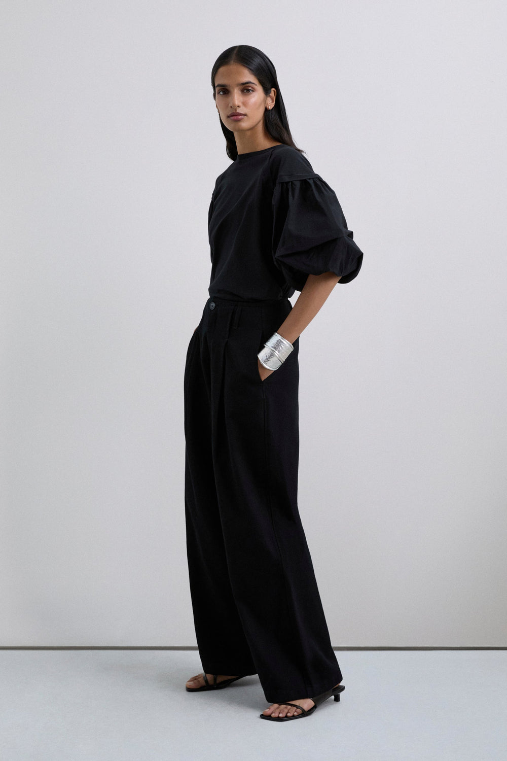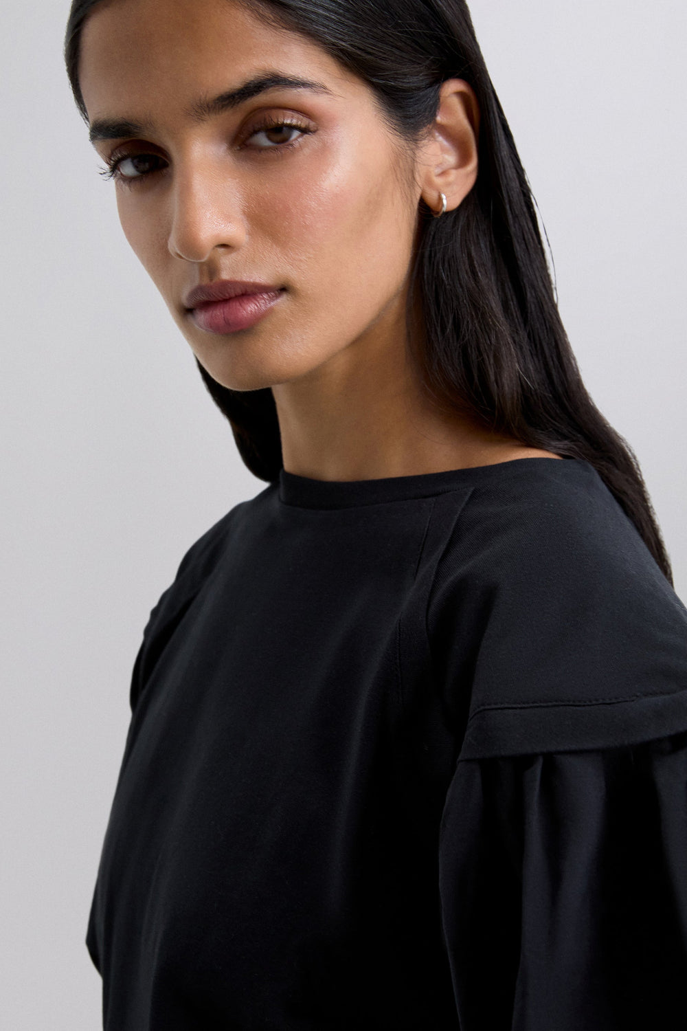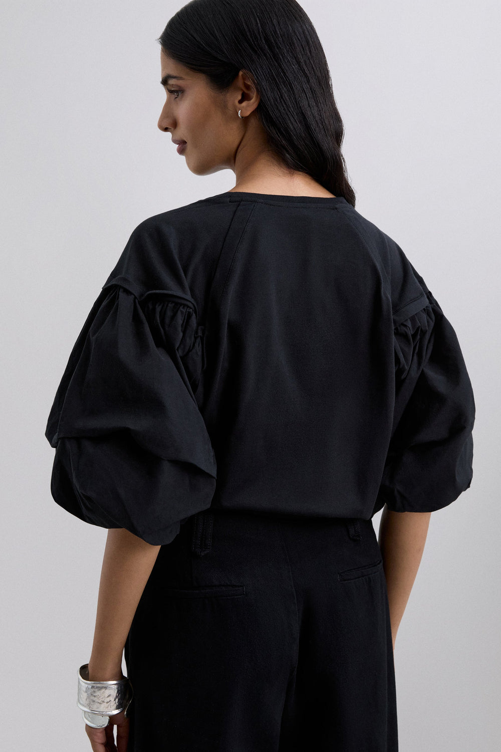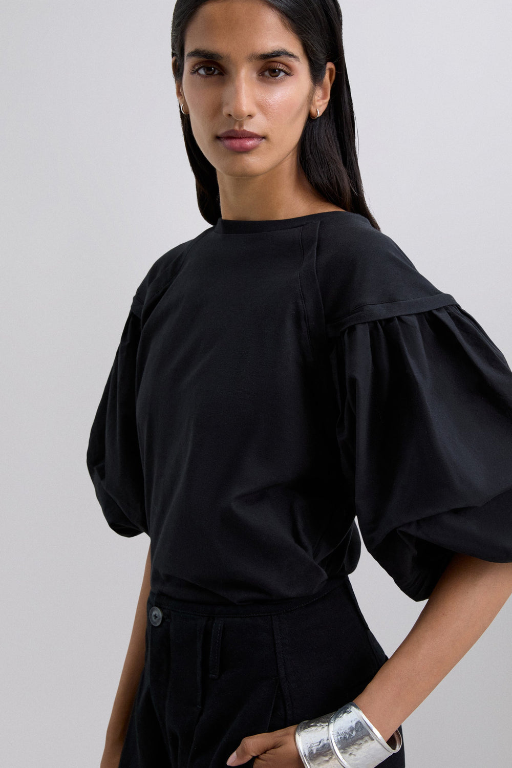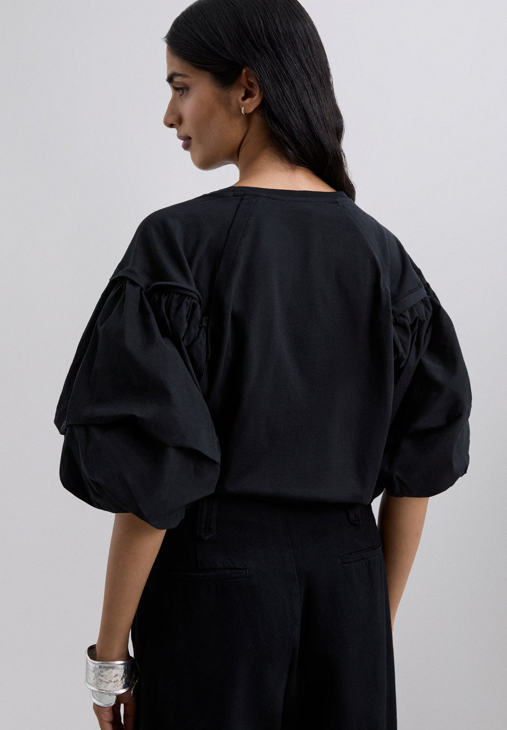 T-shirt confecionada em 100% algodão BCI. Corte regular fit, decote redondo e mangas abalonadas.