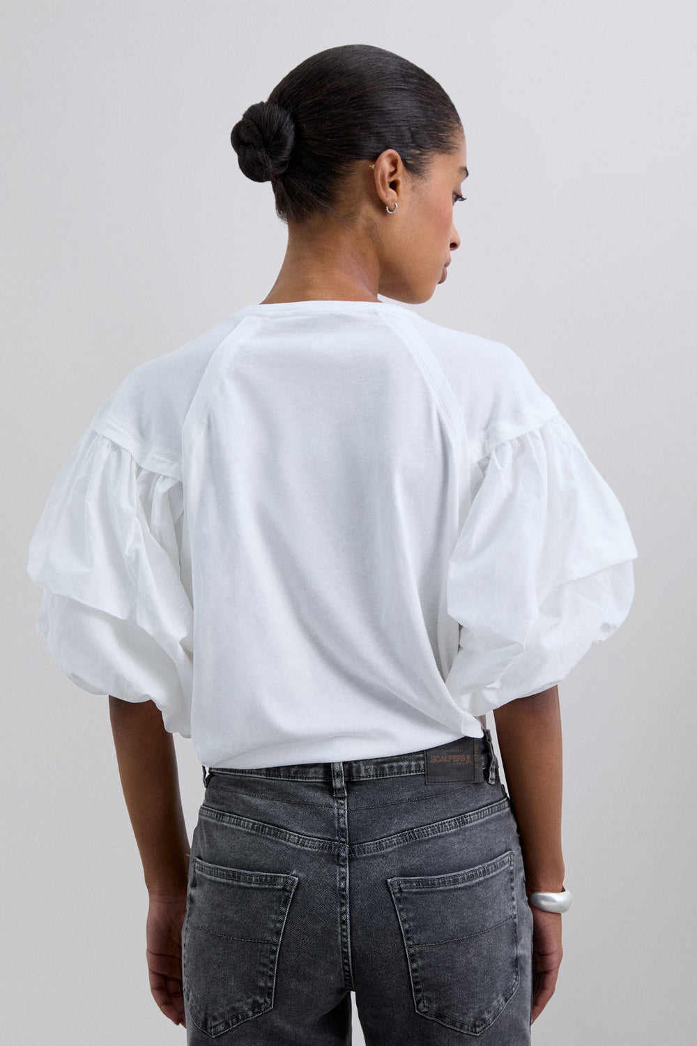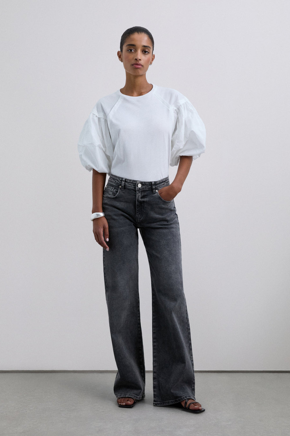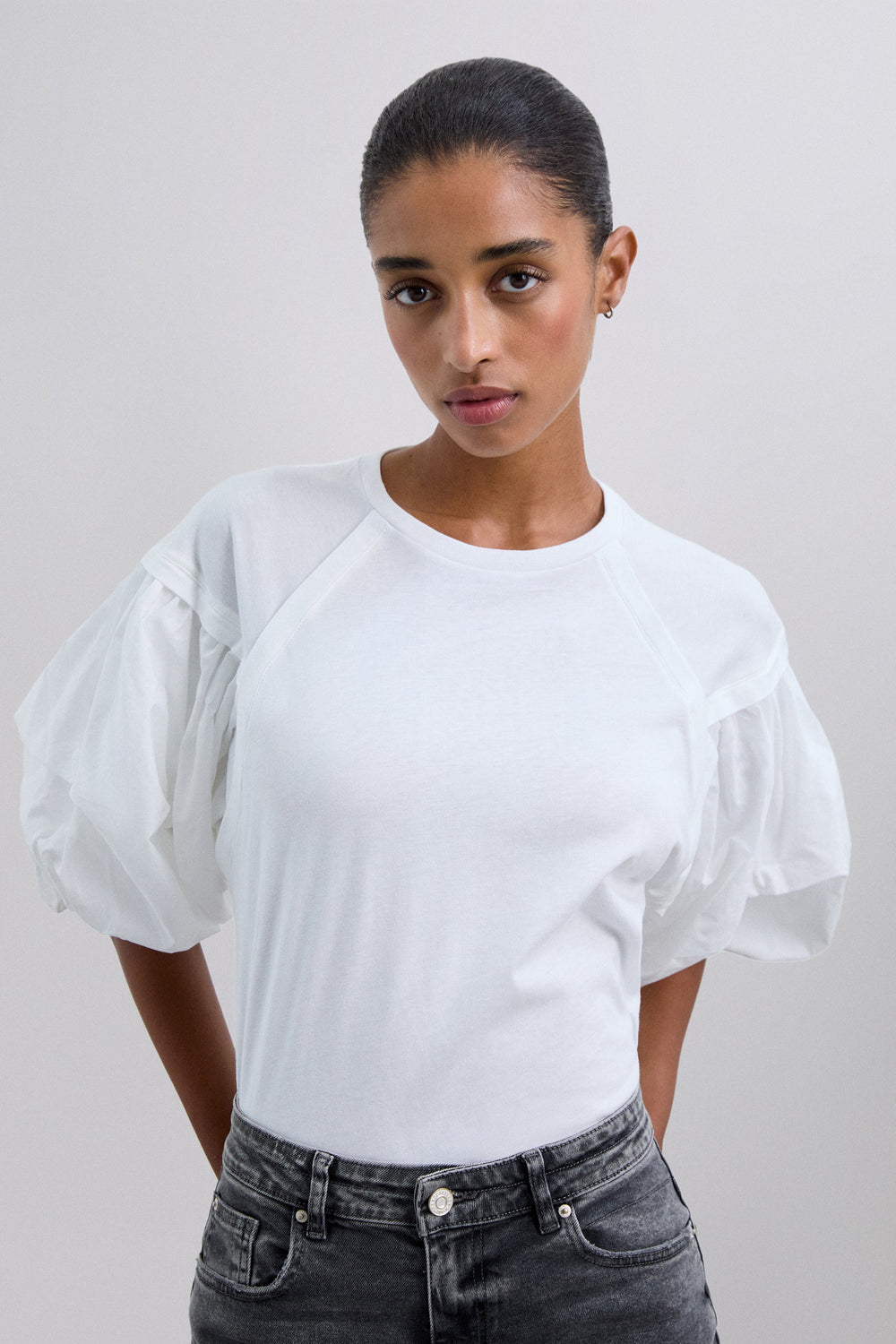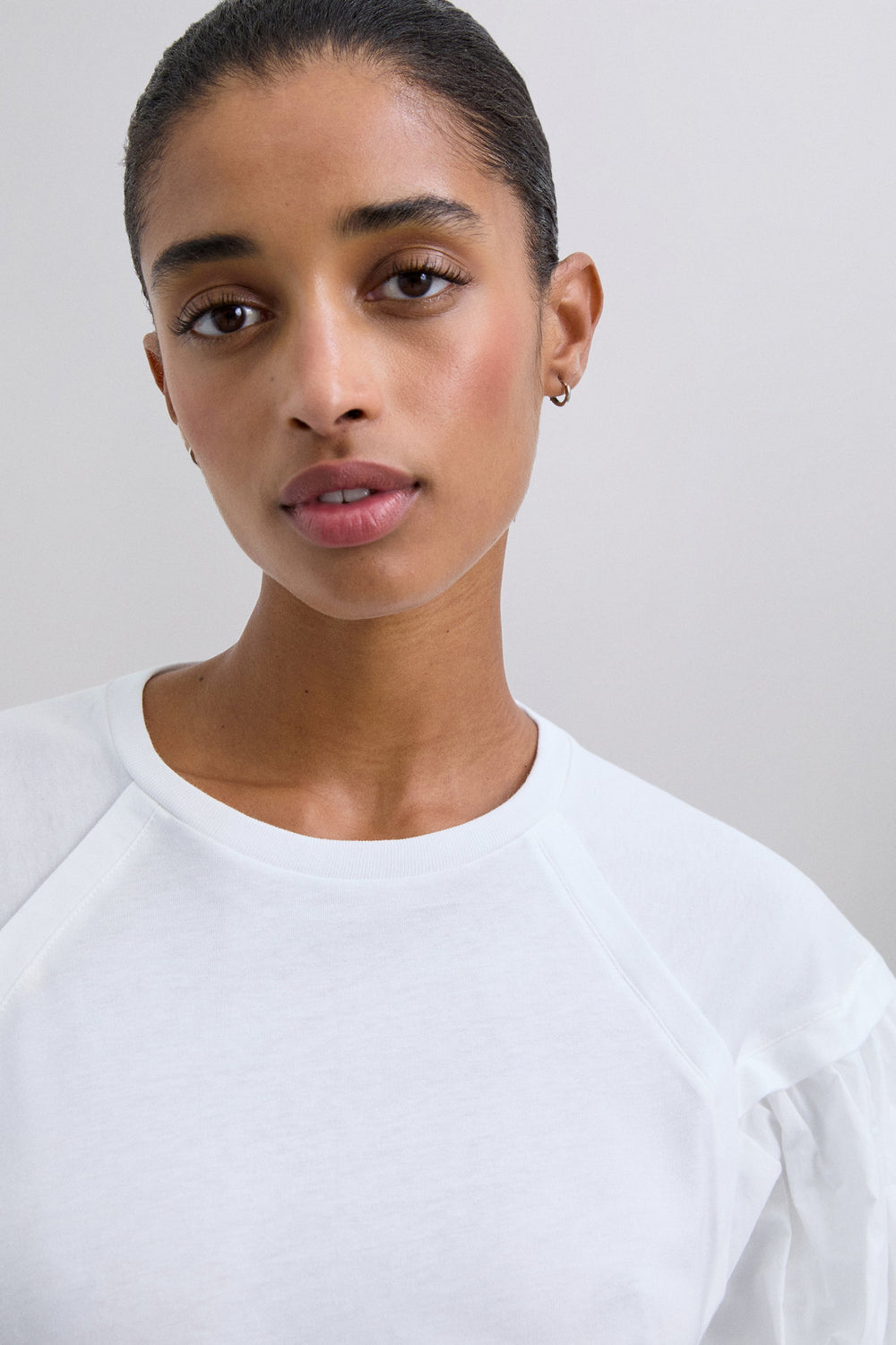 T-shirt confecionada em 100% algodão BCI. Corte regular fit, decote redondo e mangas abalonadas.