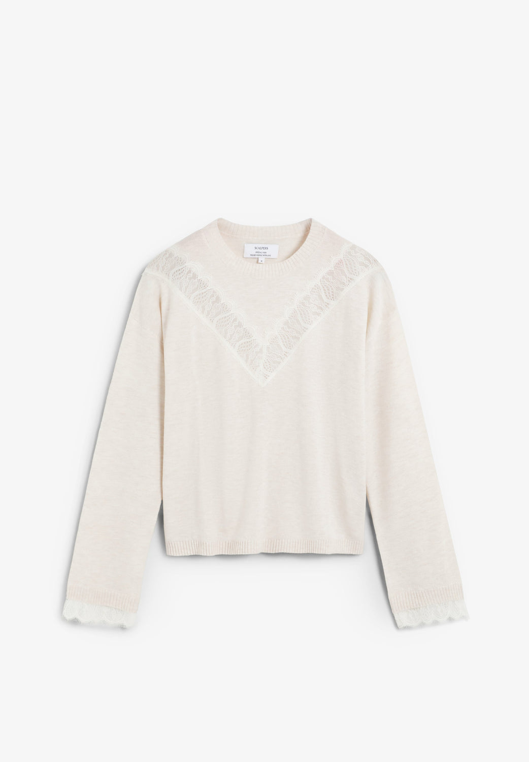 Sweater confecionada em mistura de lã e viscose. Regular fit. Decote redondo e manga comprida com acabamentos em nervuras. Pormenores de renda no peito e na parte inferior das mangas.
