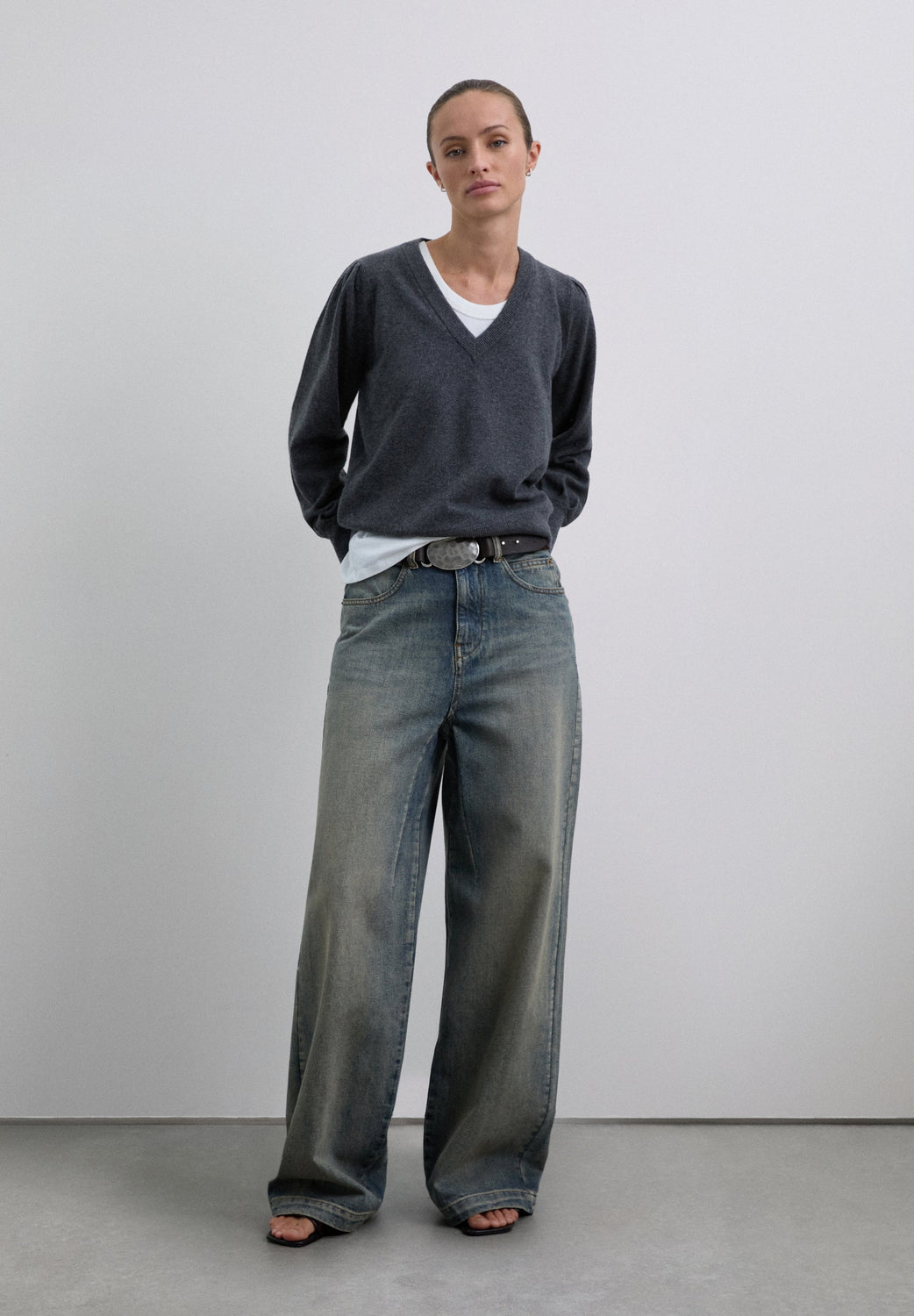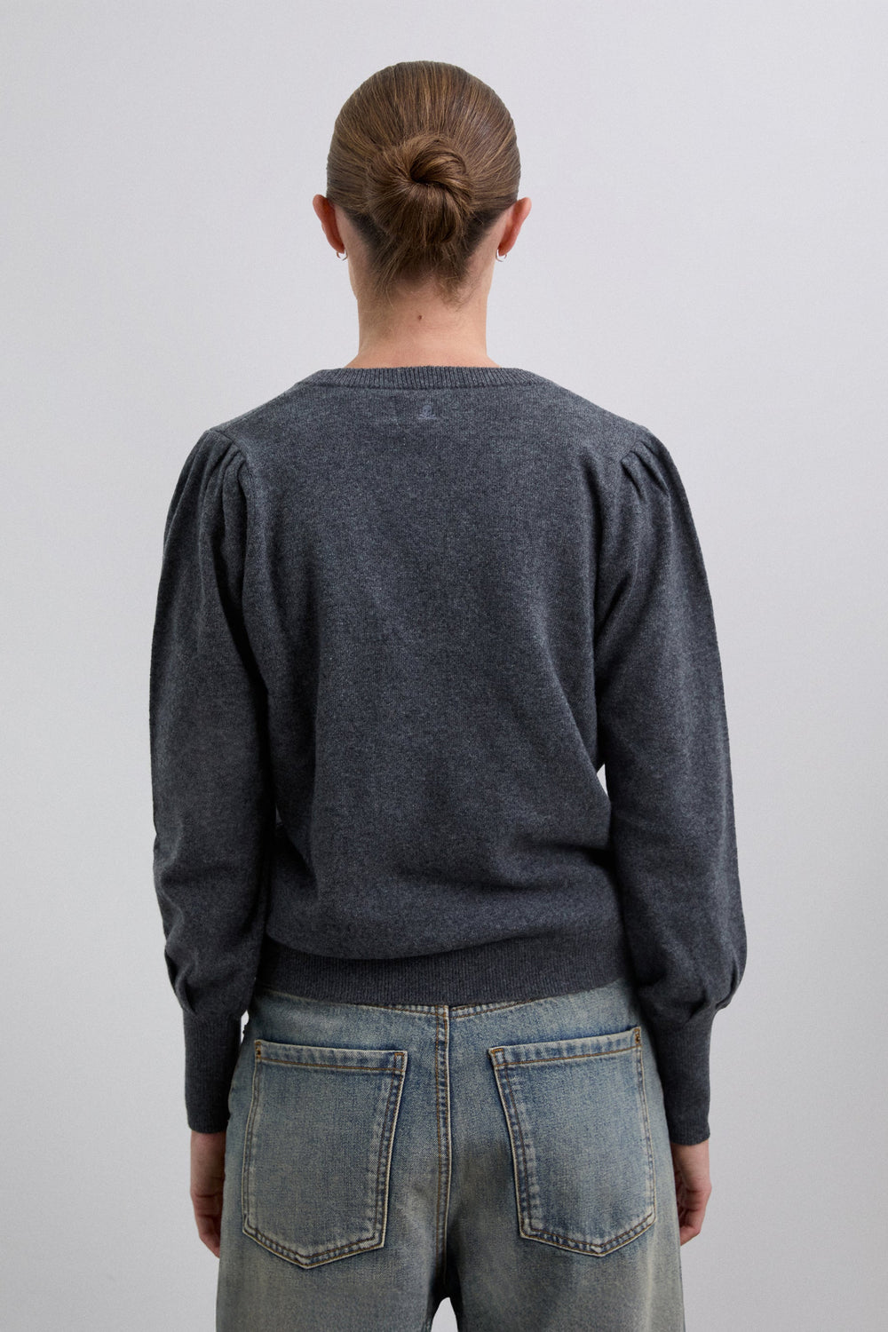 Sweater confecionada em mistura de lã com decote em V. Regular fit. Manga comprida ligeiramente abalonada terminada em punho com nervuras. Pormenor de skull bordada no tom na parte de trás.