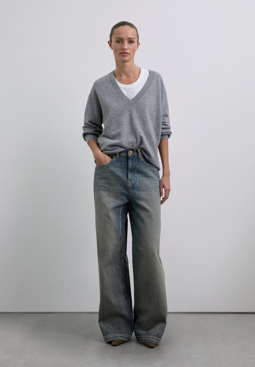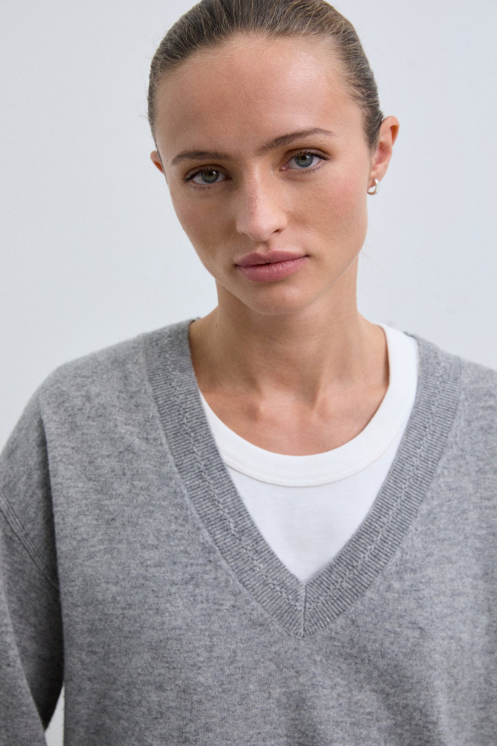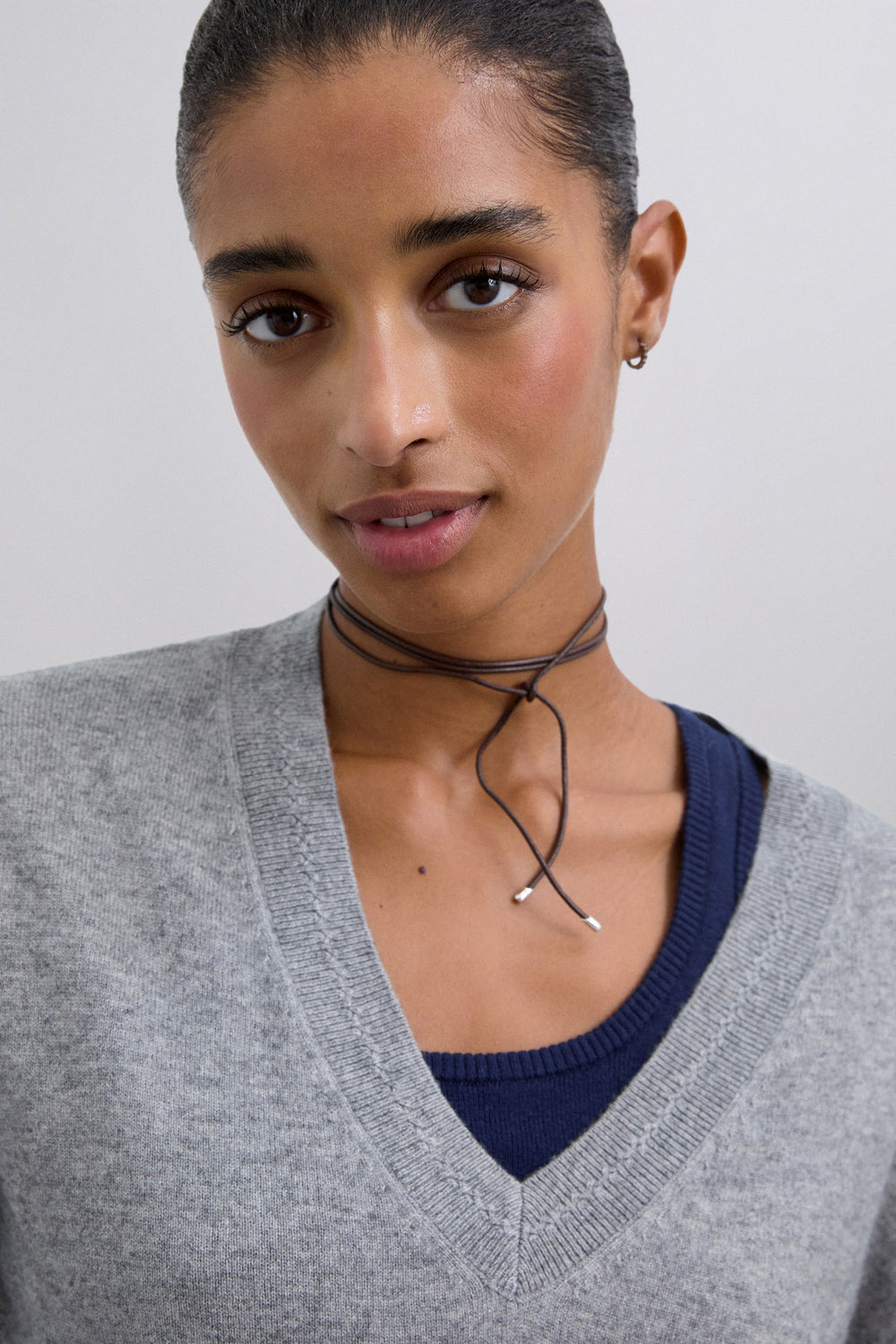 Camisola confecionada em lã. Decote em V com um ajuste ligeiramente folgado. Pormenores de mini furos junto à bainha superior. Acabamentos em nervuras na gola, nos punhos e na cintura. Pormenor do placa metálica com logótipo atrás.