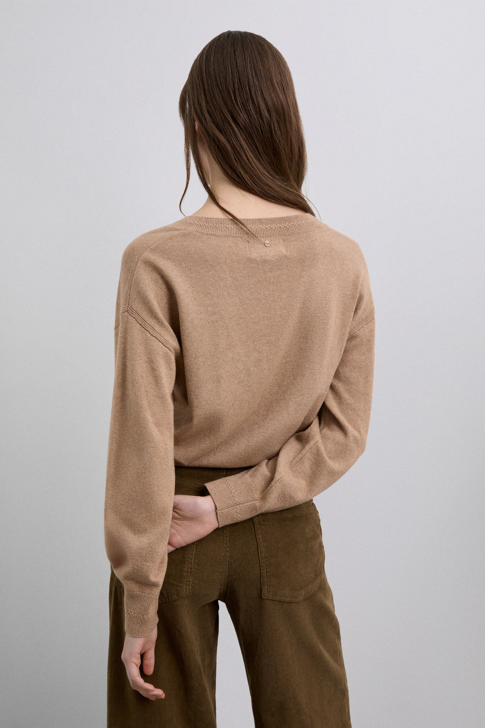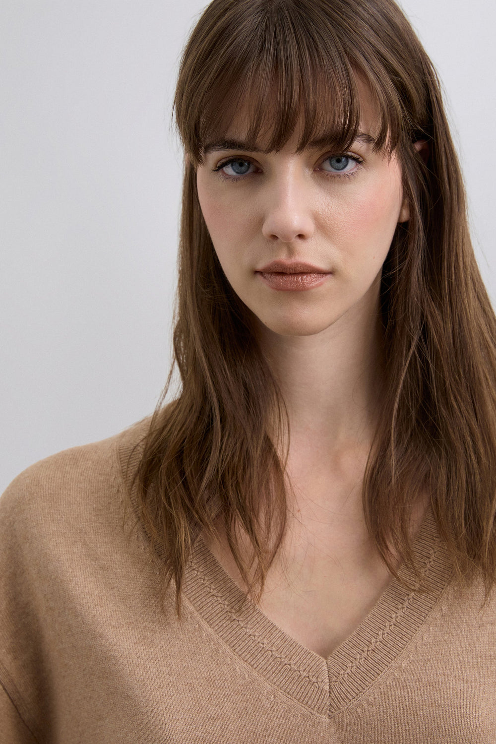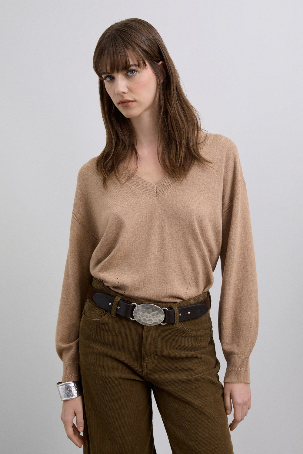 Camisola confecionada em lã. Decote em V com um ajuste ligeiramente folgado. Pormenores de mini furos junto à bainha superior. Acabamentos em nervuras na gola, nos punhos e na cintura. Pormenor do placa metálica com logótipo atrás.