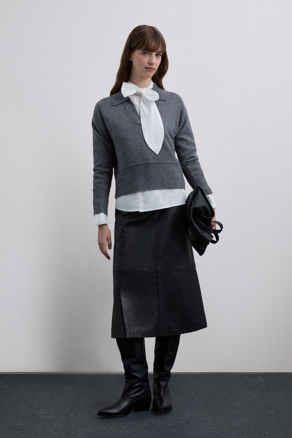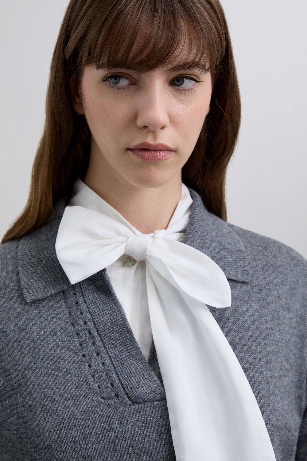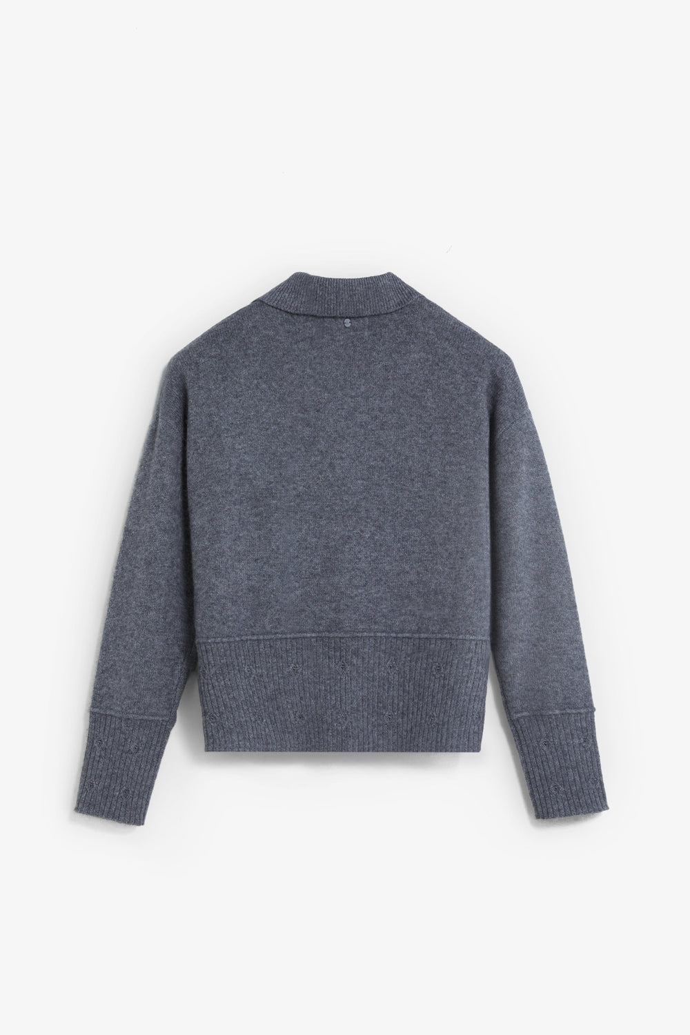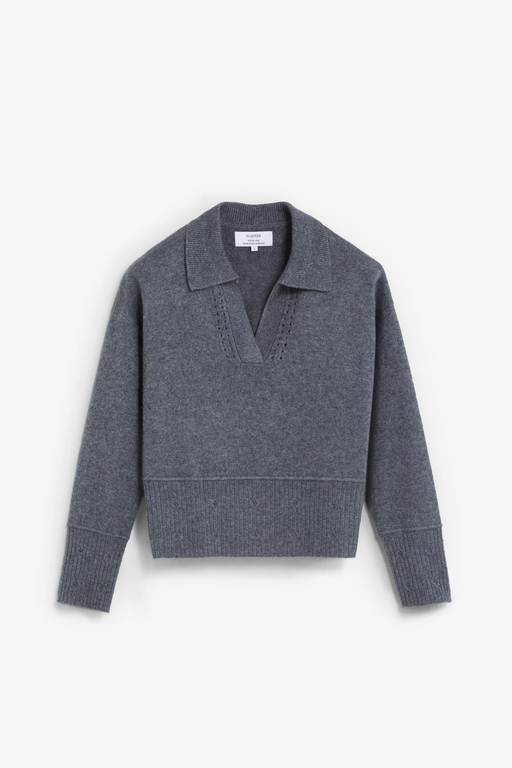 Sweater tipo camisa polo confecionada em mistura de lã e caxemira. Gola t-shirt com pormenores de aberturas na gola. Regular fit. Manga comprida com punhos terminados em nervuras. Bainha com acabamento canelado com pormenores em relevo.