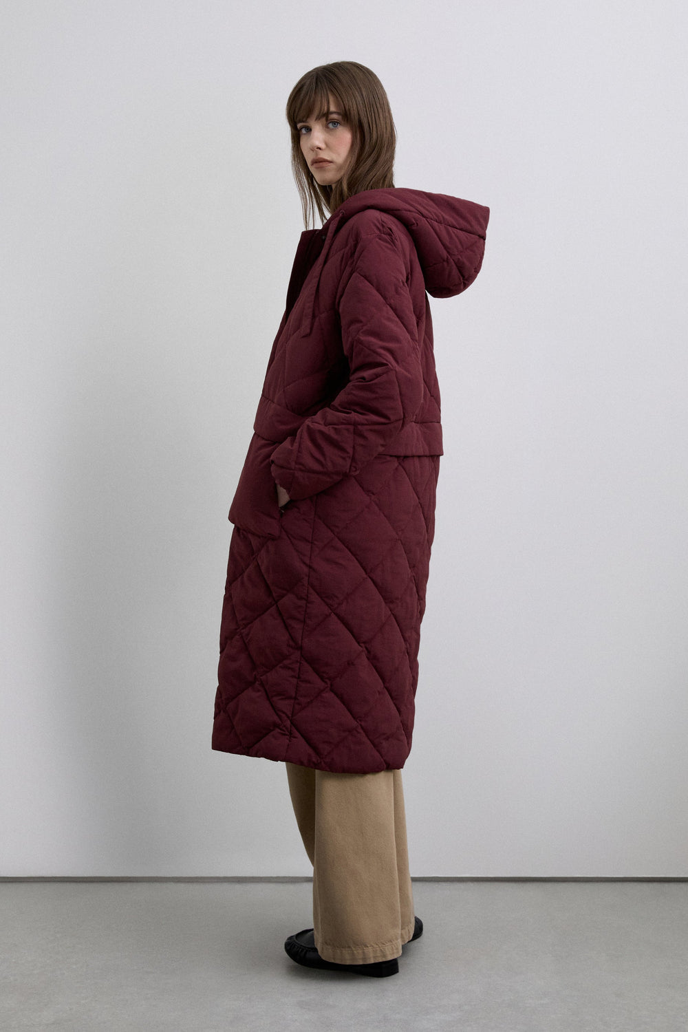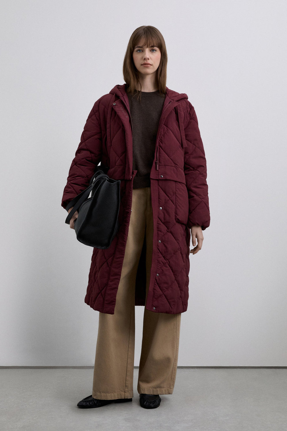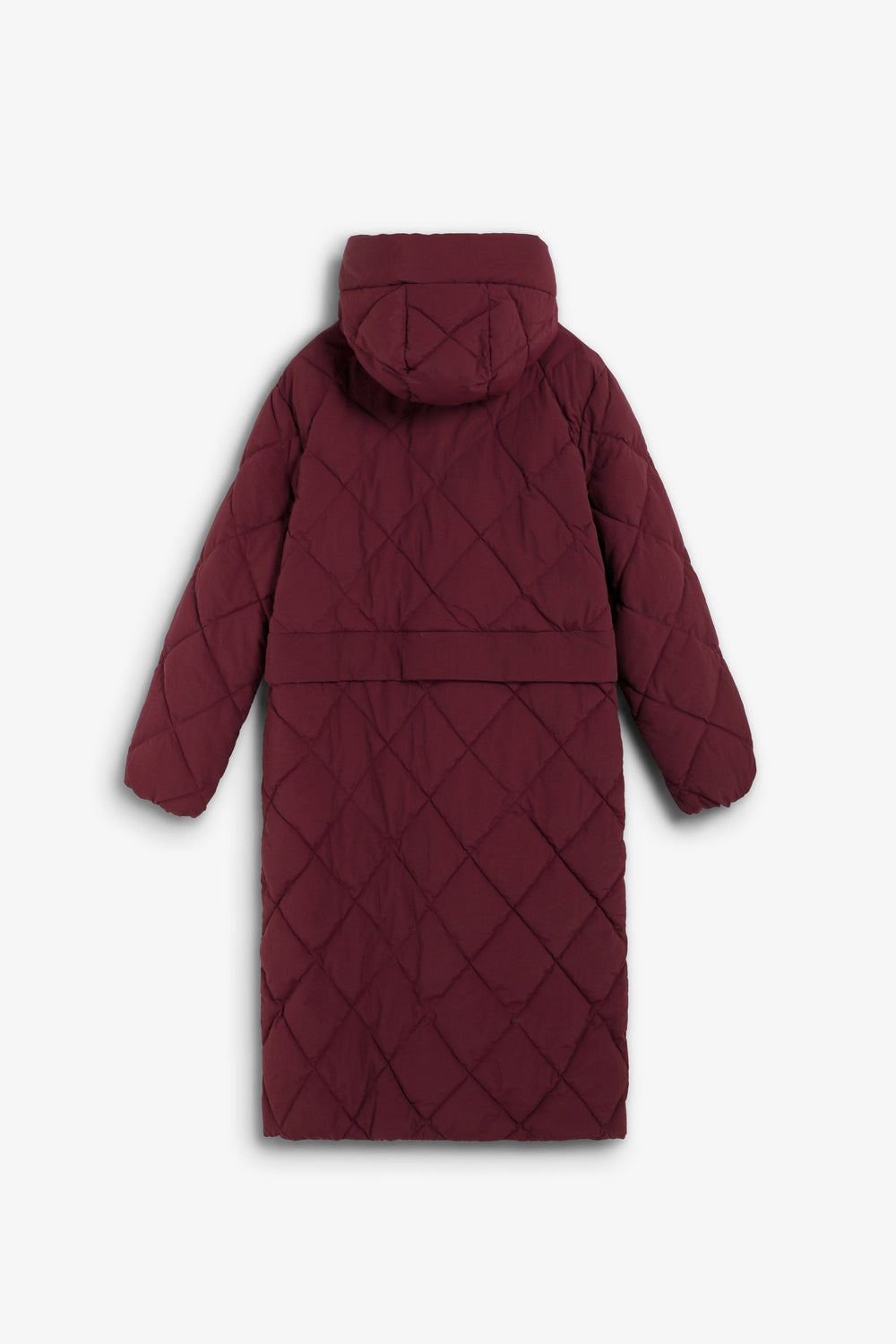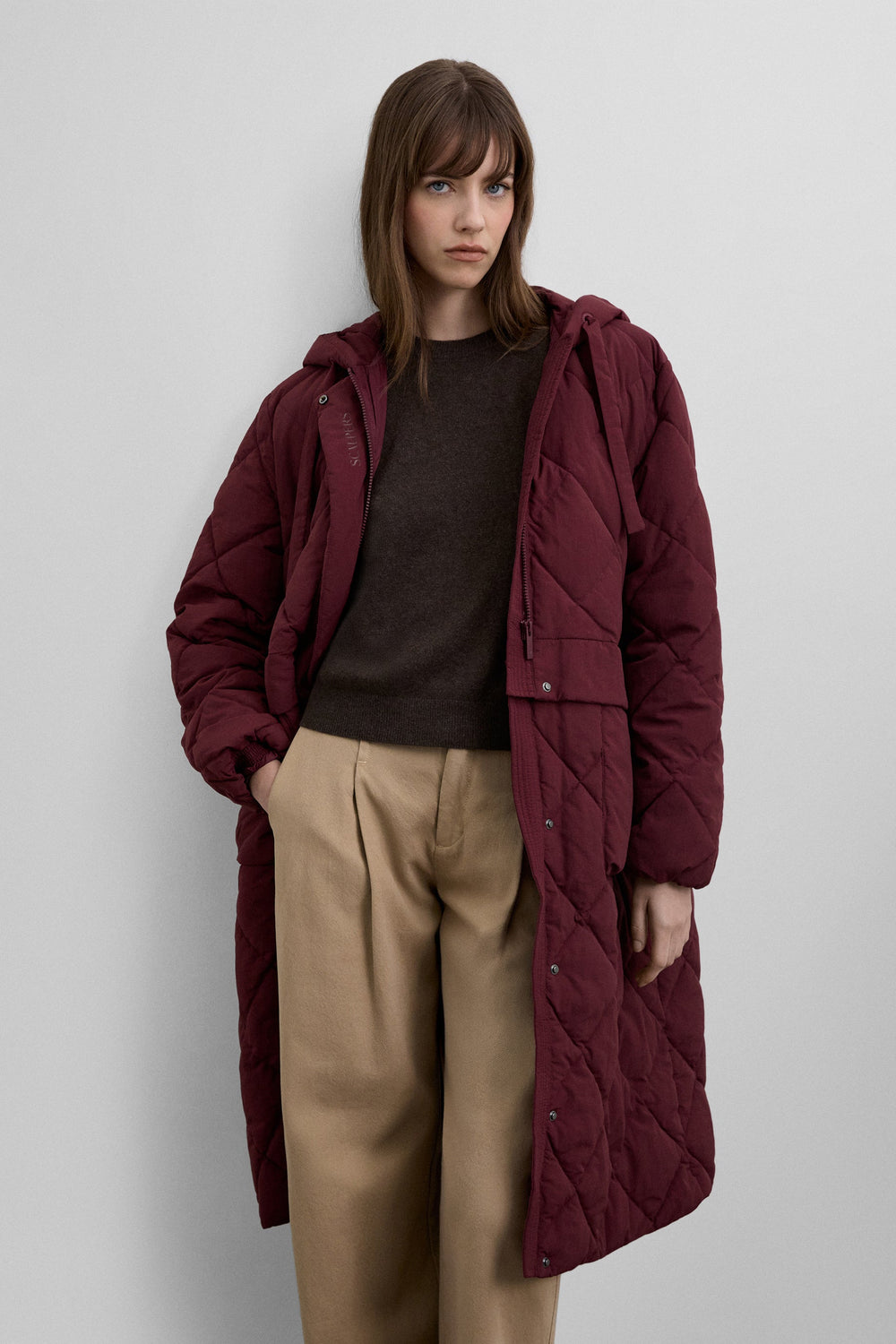 Casaco comprido acolchoado de nylon impermeável desmontável. Permite transformar o casaco comprido num cardigan curto. Fecho à frente com zip oculto. Capuz.