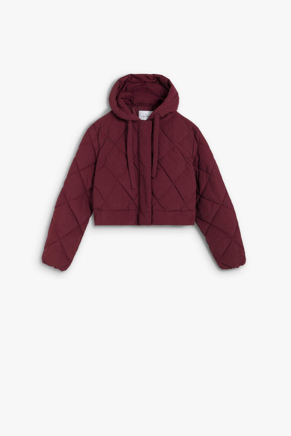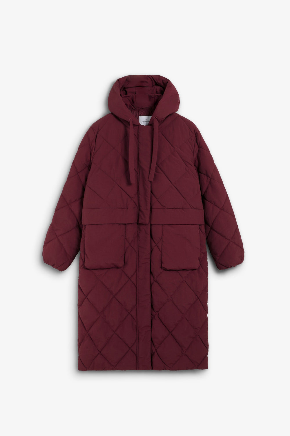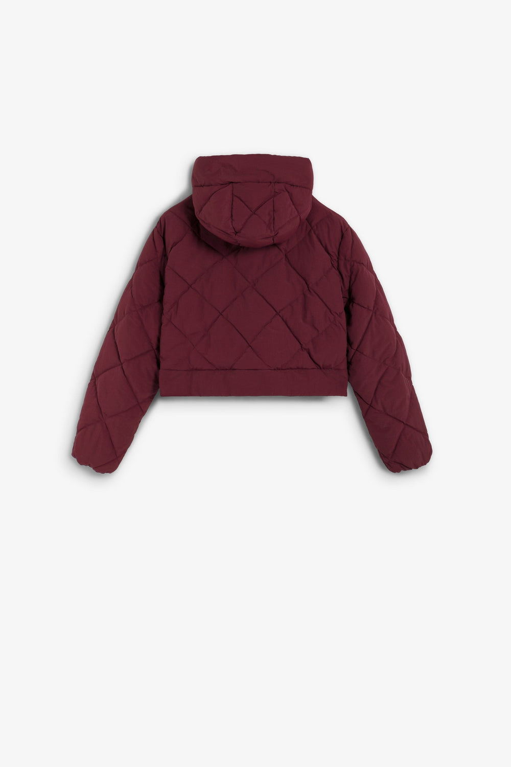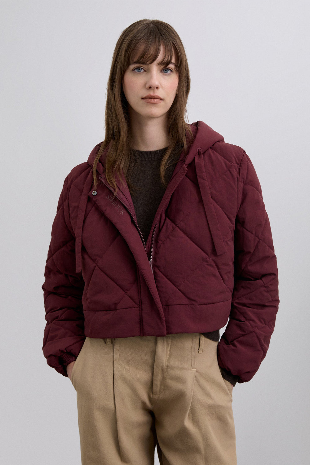 Casaco comprido acolchoado de nylon impermeável desmontável. Permite transformar o casaco comprido num cardigan curto. Fecho à frente com zip oculto. Capuz.