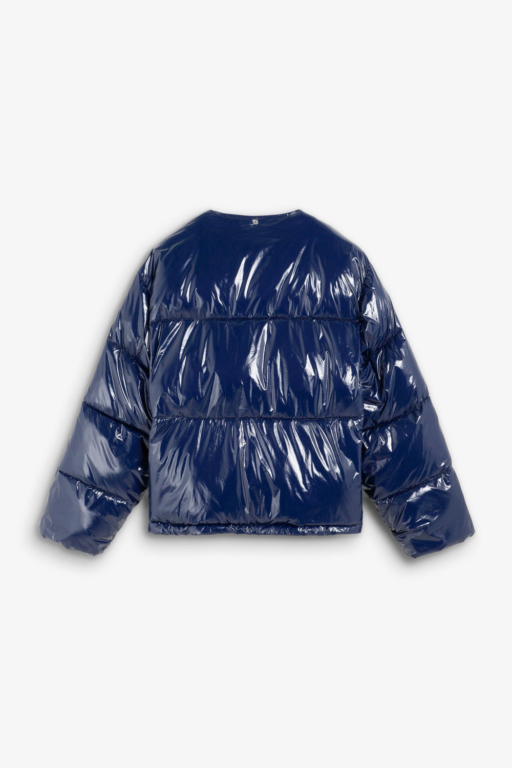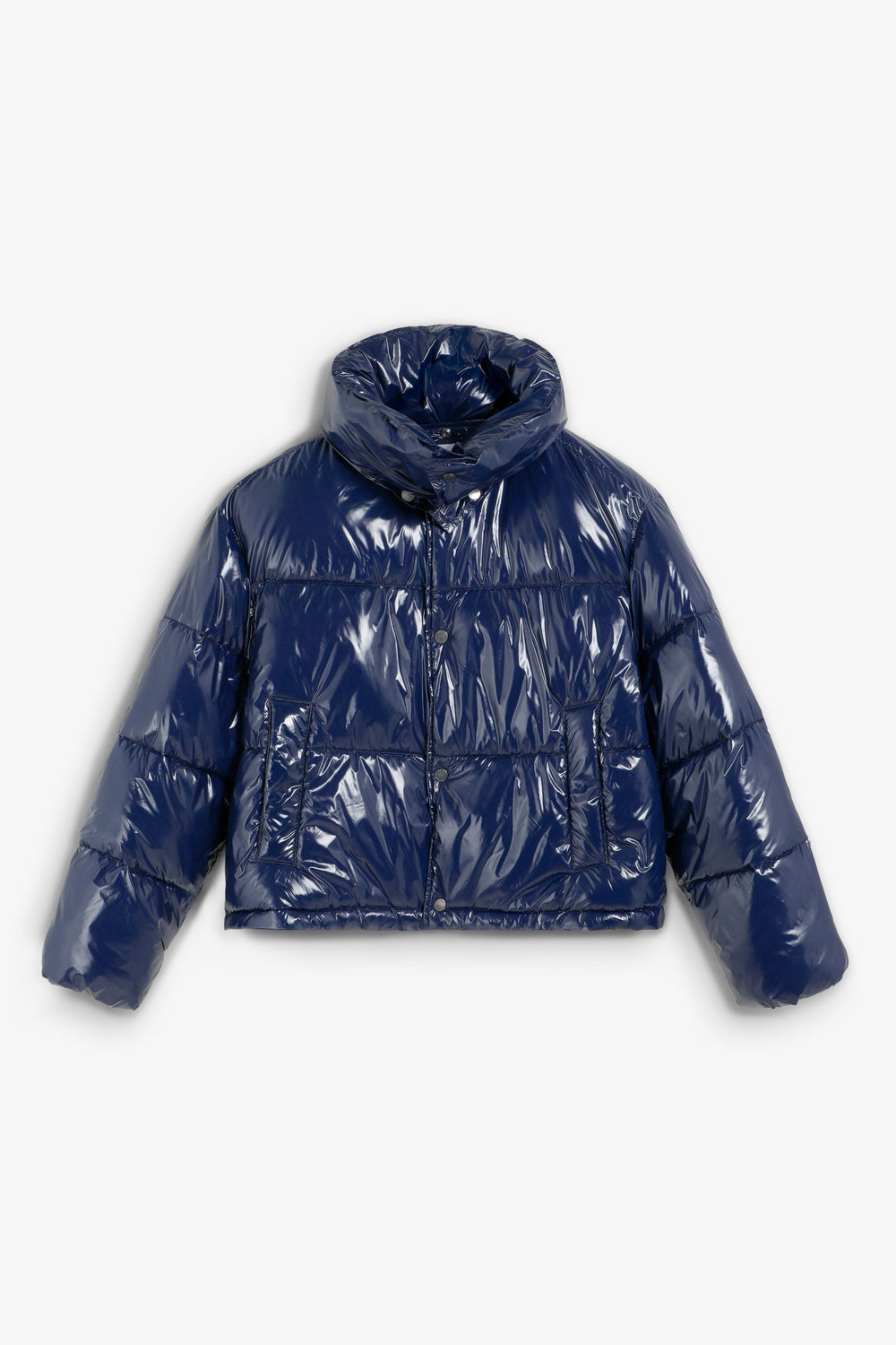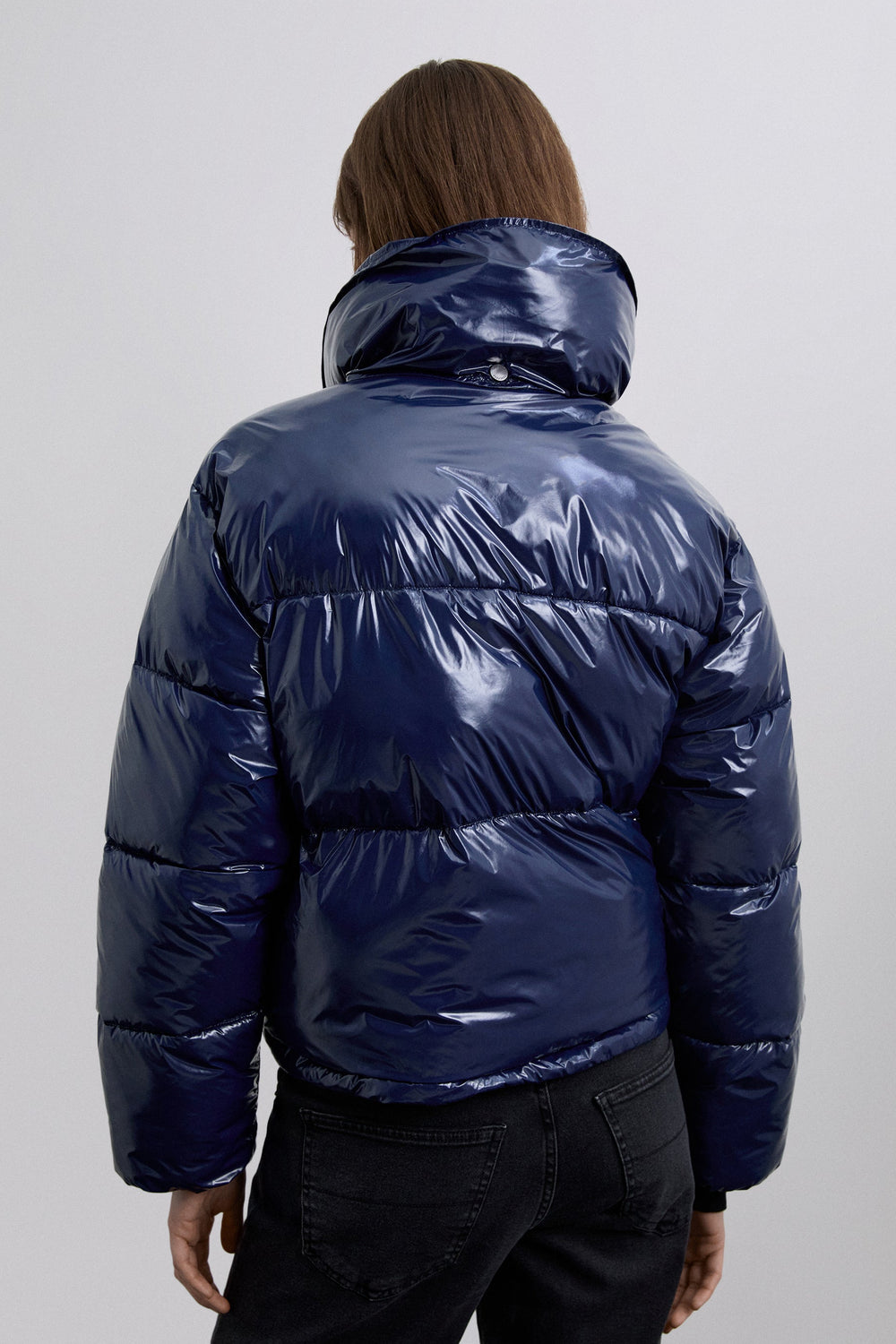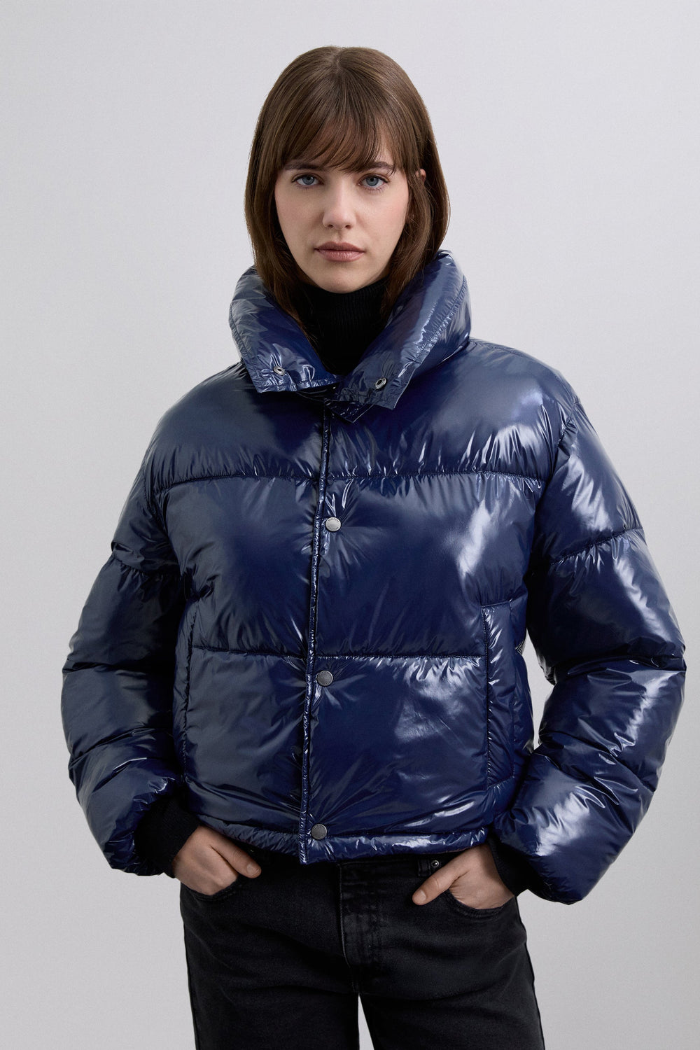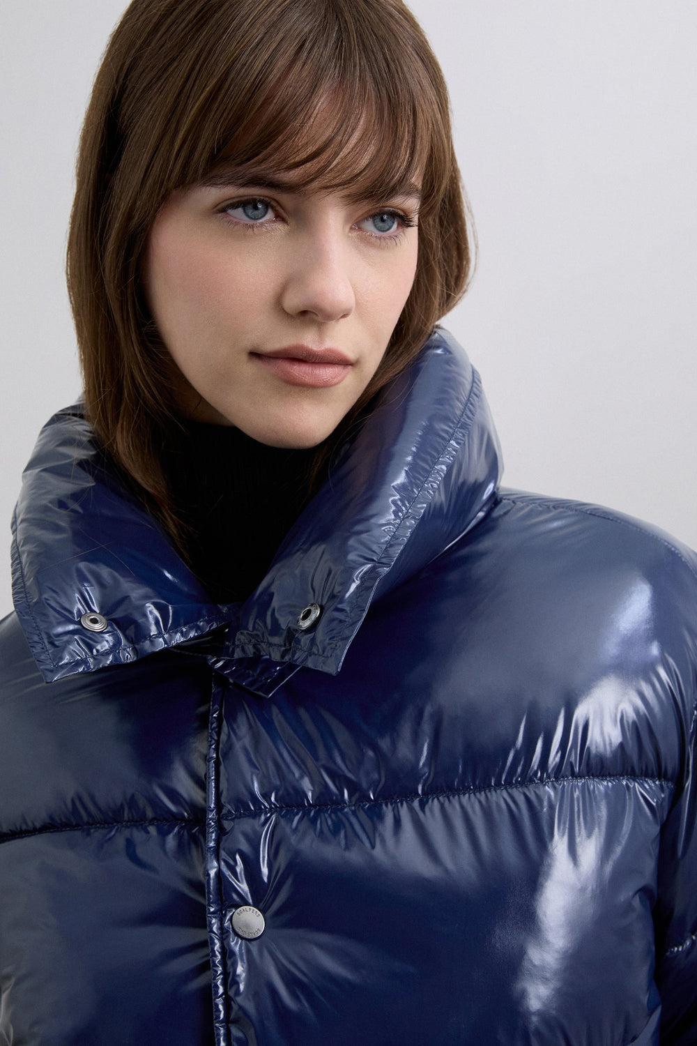 Casaco de penas confecionado em nylon com acabamento de brilho. Regular fit. Gola subida. Manga comprida. Bolsos laterais inclinados. Fecho com botões de pressão.