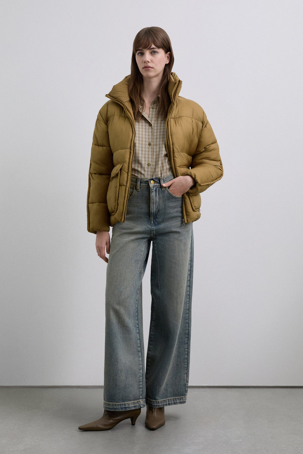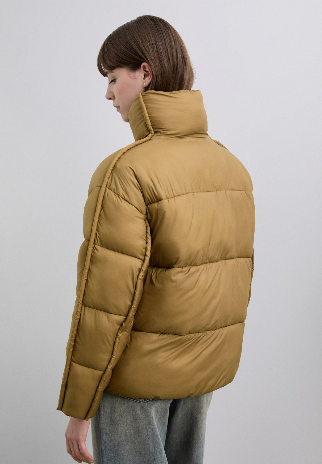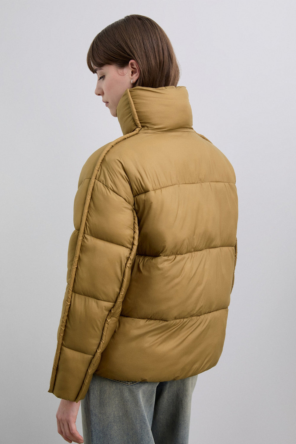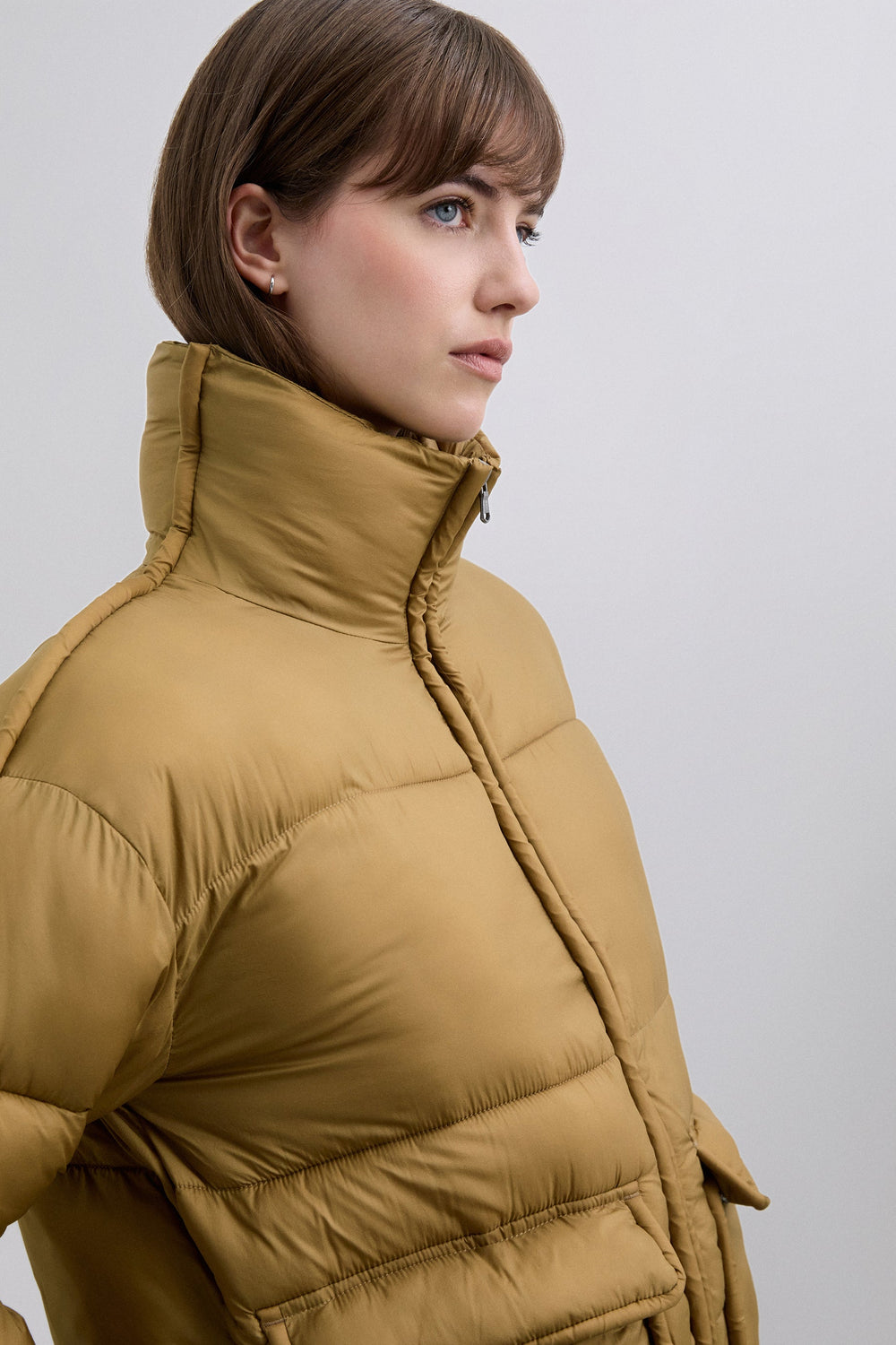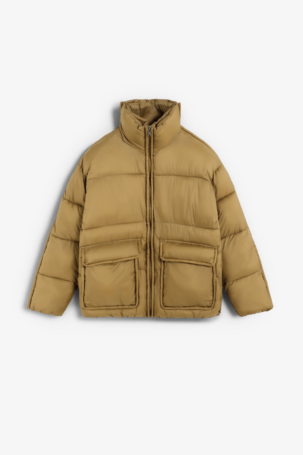 Cardigan acolchoado com bolsos à frente. Fecho de correr à frente. Gola alta e manga comprida.