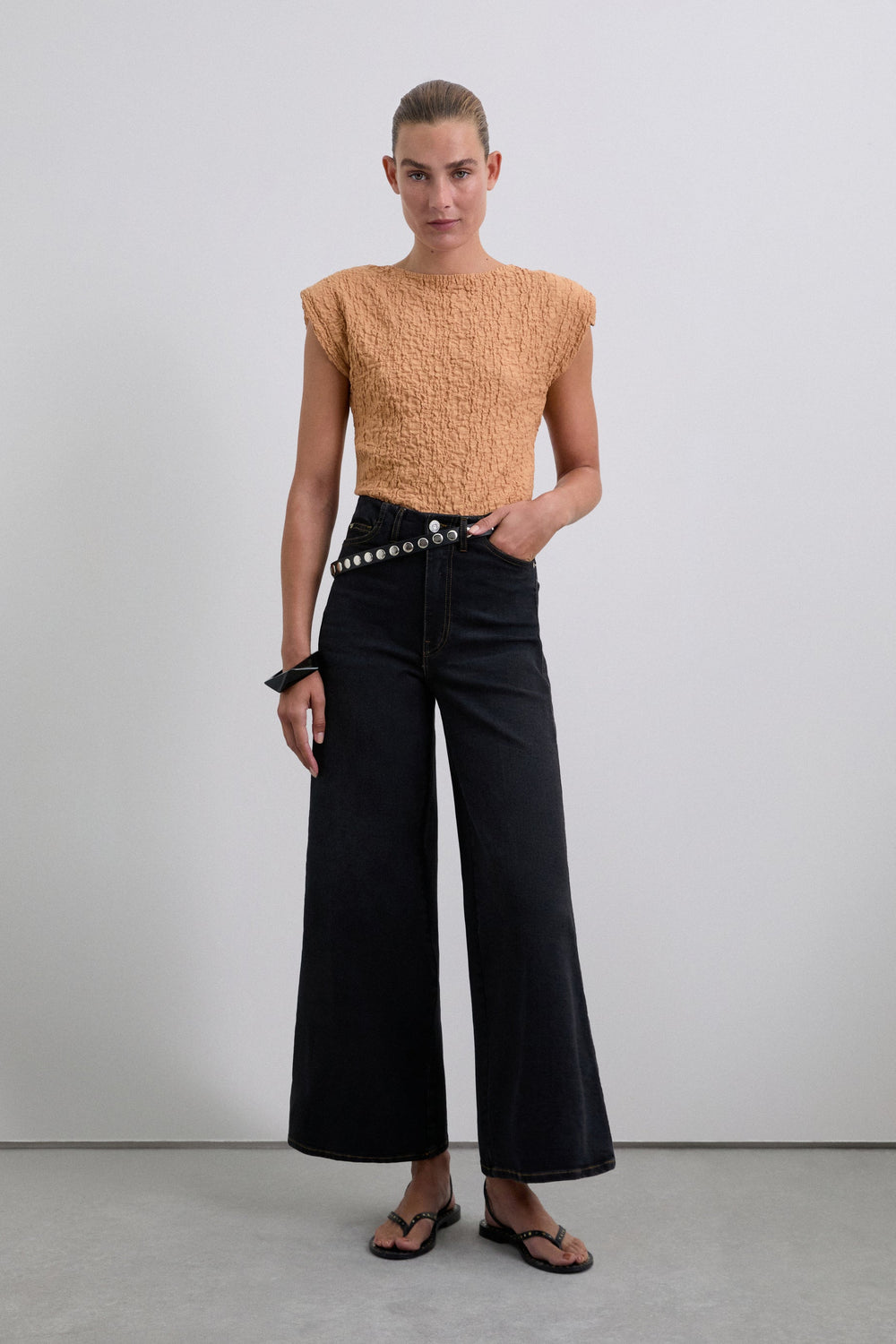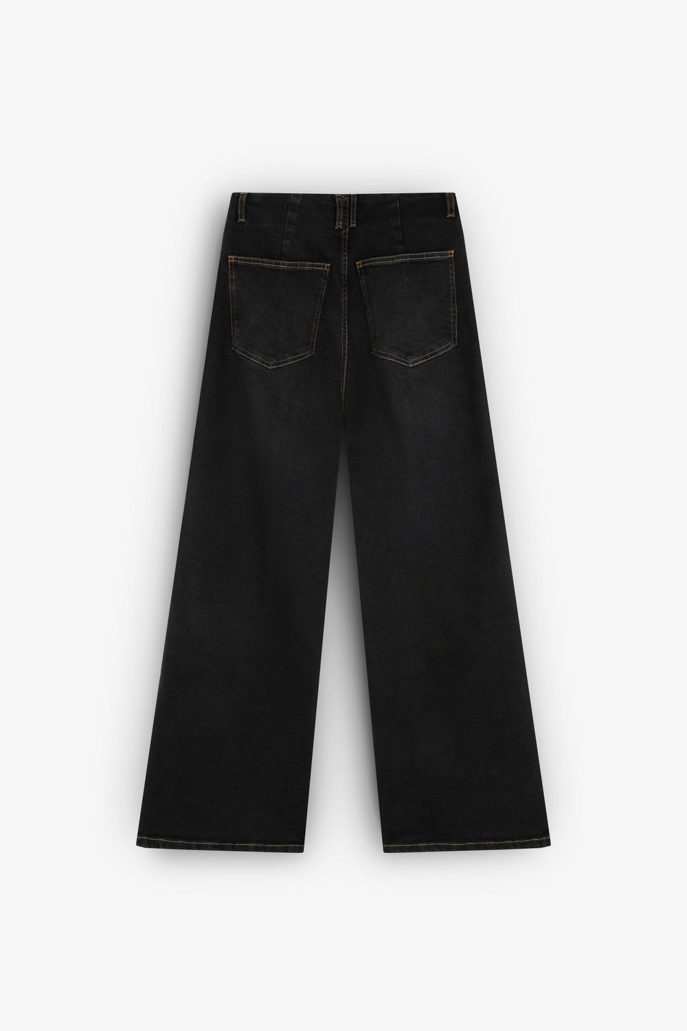 Calças denim confecionadas em algodão com ligeiro elastano. Corte culottes, cintura alta e fecho com zip e botão. Bolsos à frente e atrás.