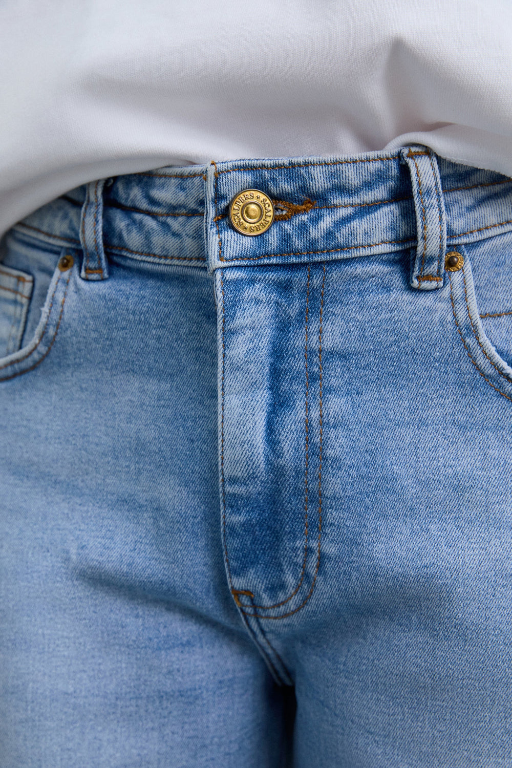Calças jeans mid waist e cintura com presilhas. Corte full length, fecho de correr e botão à frente. Bolsos atrás e à frente.