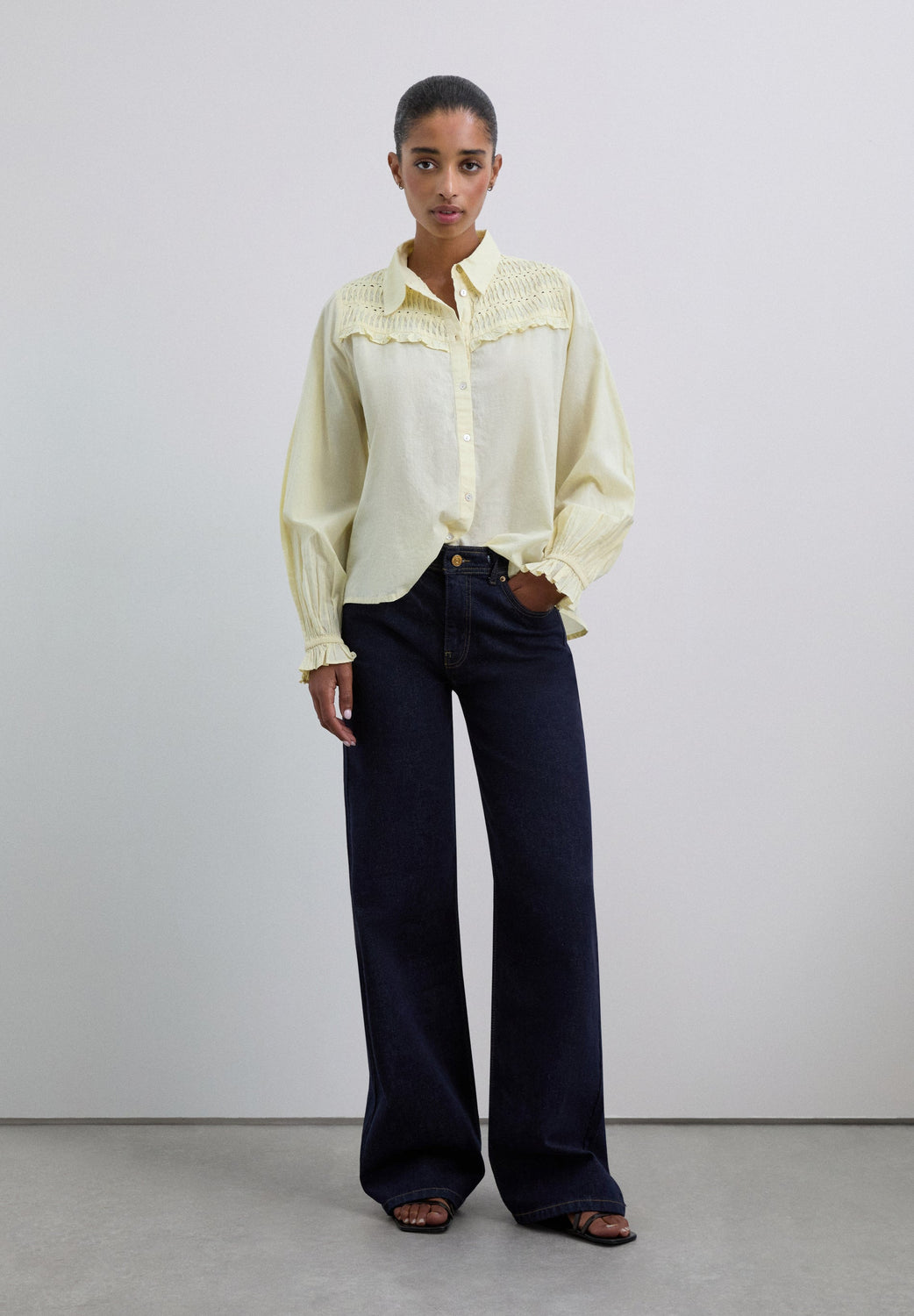 Blusa confecionada em 100% algodão. Corte regular fit. Colarinho clássico. Pormenor de parte superior no peito. Manga comprida acabada em punho elástico com ligeiro folho. Fecho com botões.