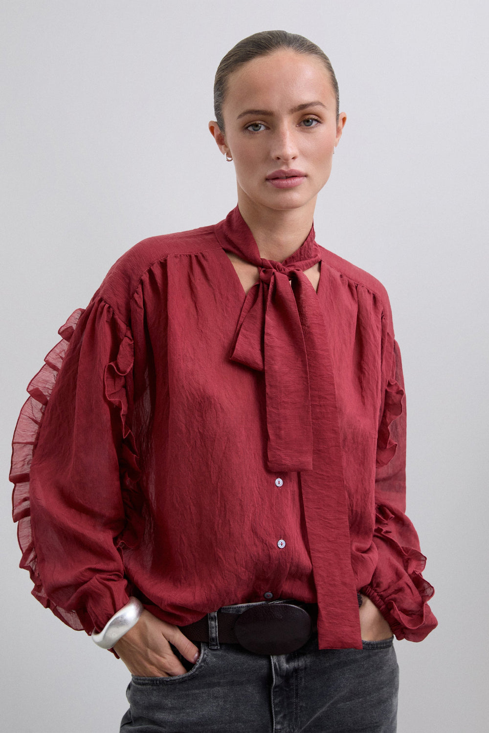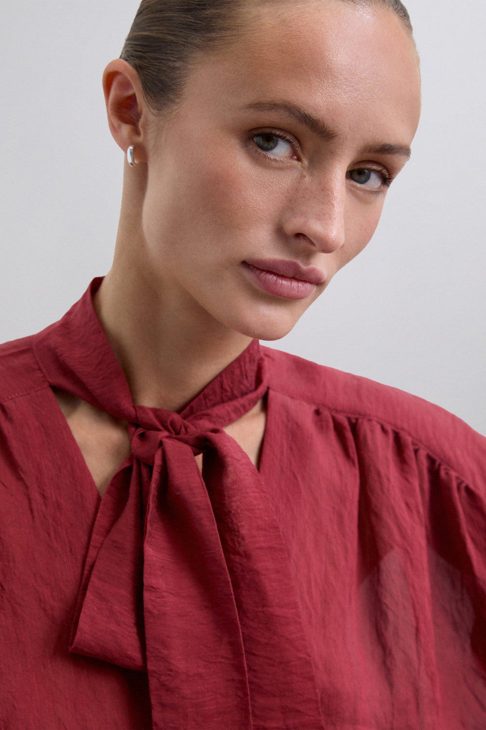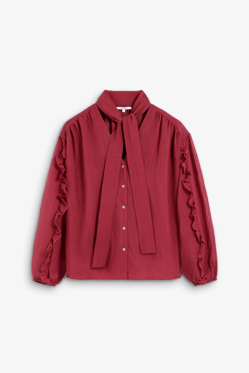 Blusa confecionada em tecido fluido com linho e rayón. Regular fit. Decote com pormenor de laço. Fecho com botões à frente. Manga comprida ligeiramente abalonada terminada em punhos. Pormenores de franzidos nas mangas.
