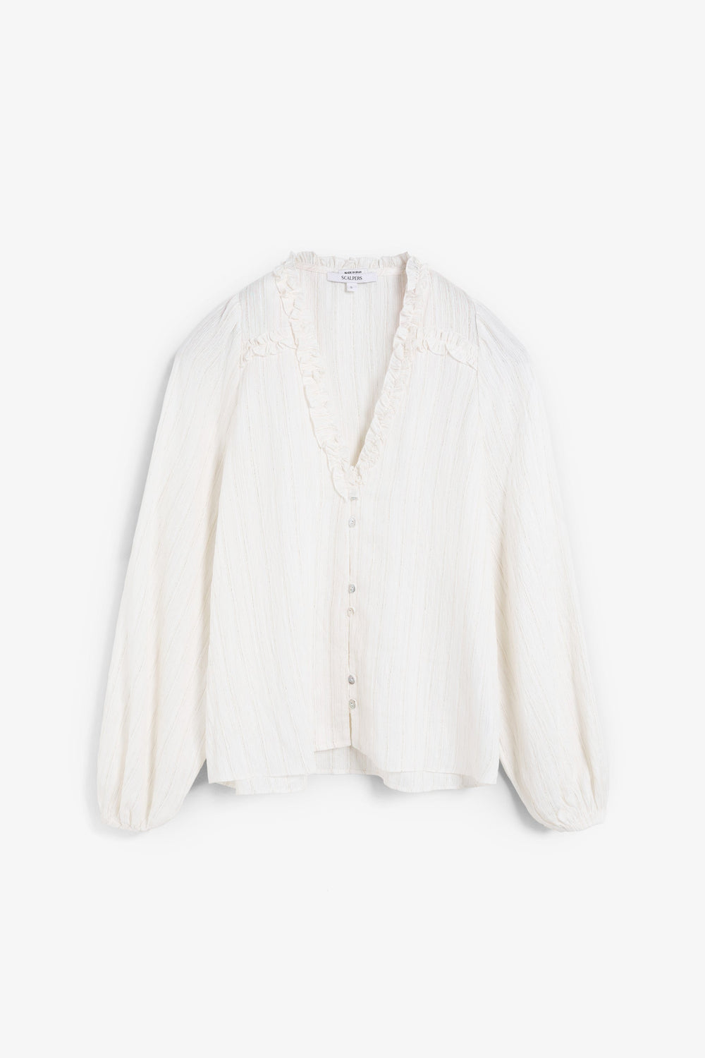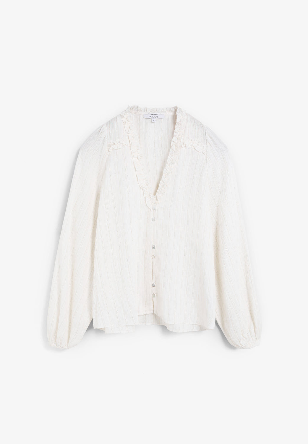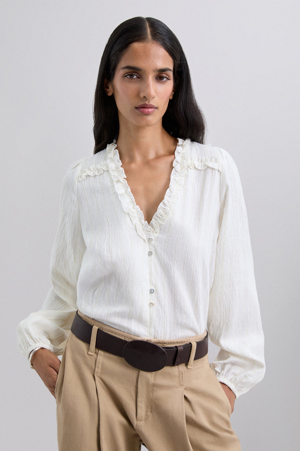 Blusa confecionada em tecido fluido com pormenores de fio metalizado. Corte regular fit, decote em V com pormenores franzidos na gola e nos ombros. Manga comprida abalonada terminada em punho. Fecho com botões à frente.