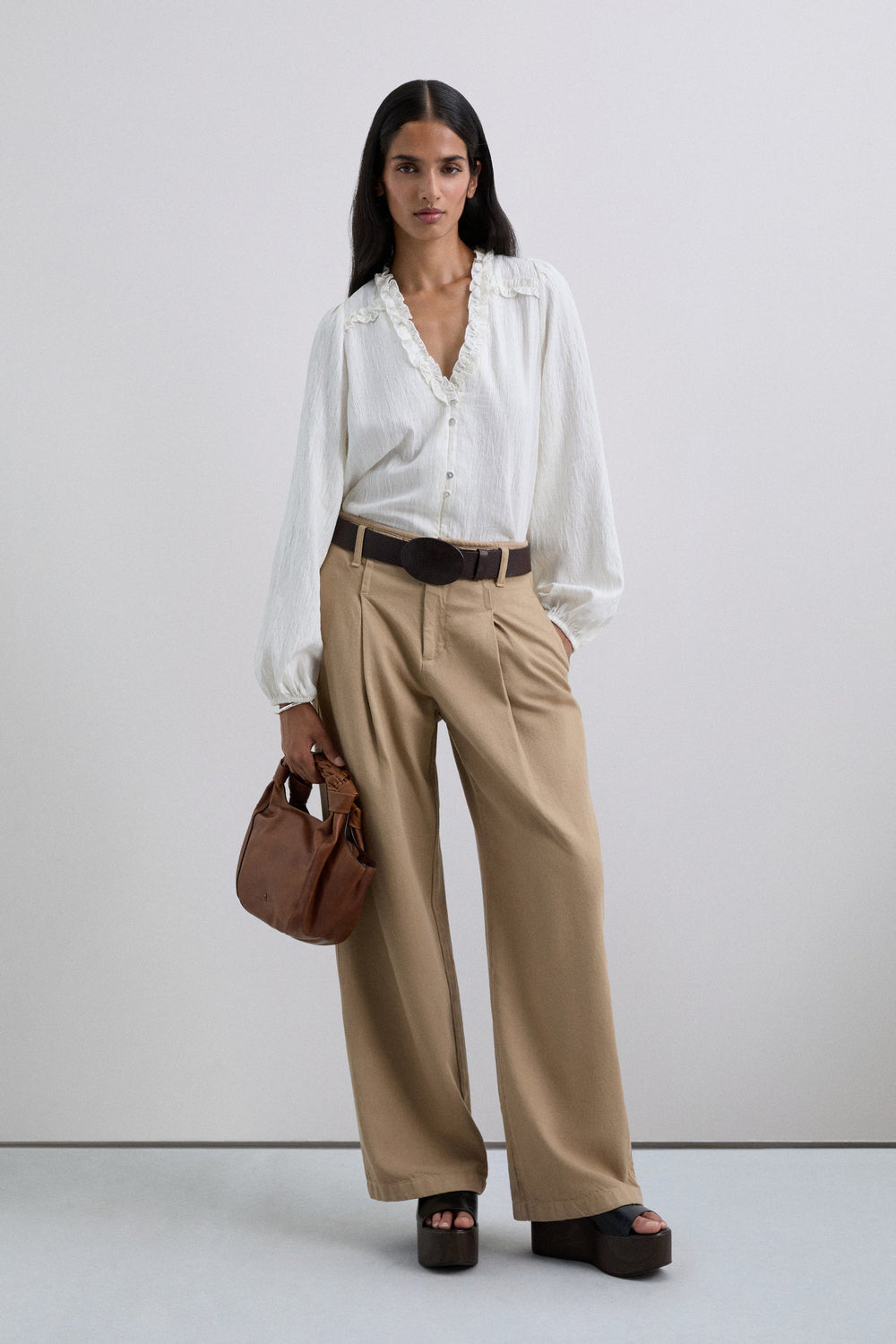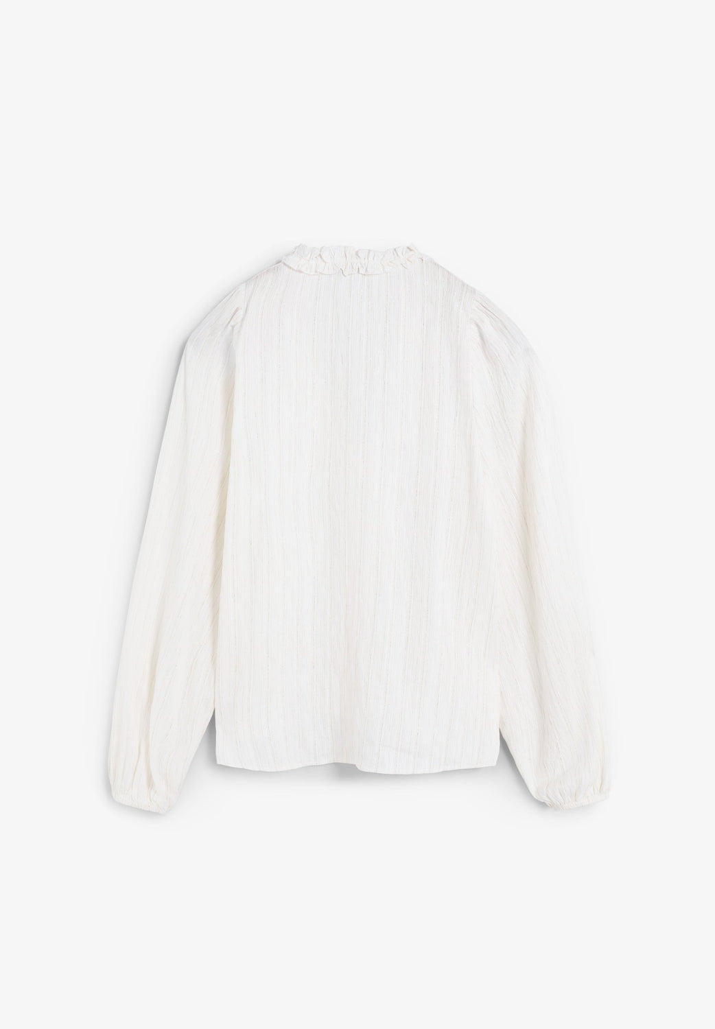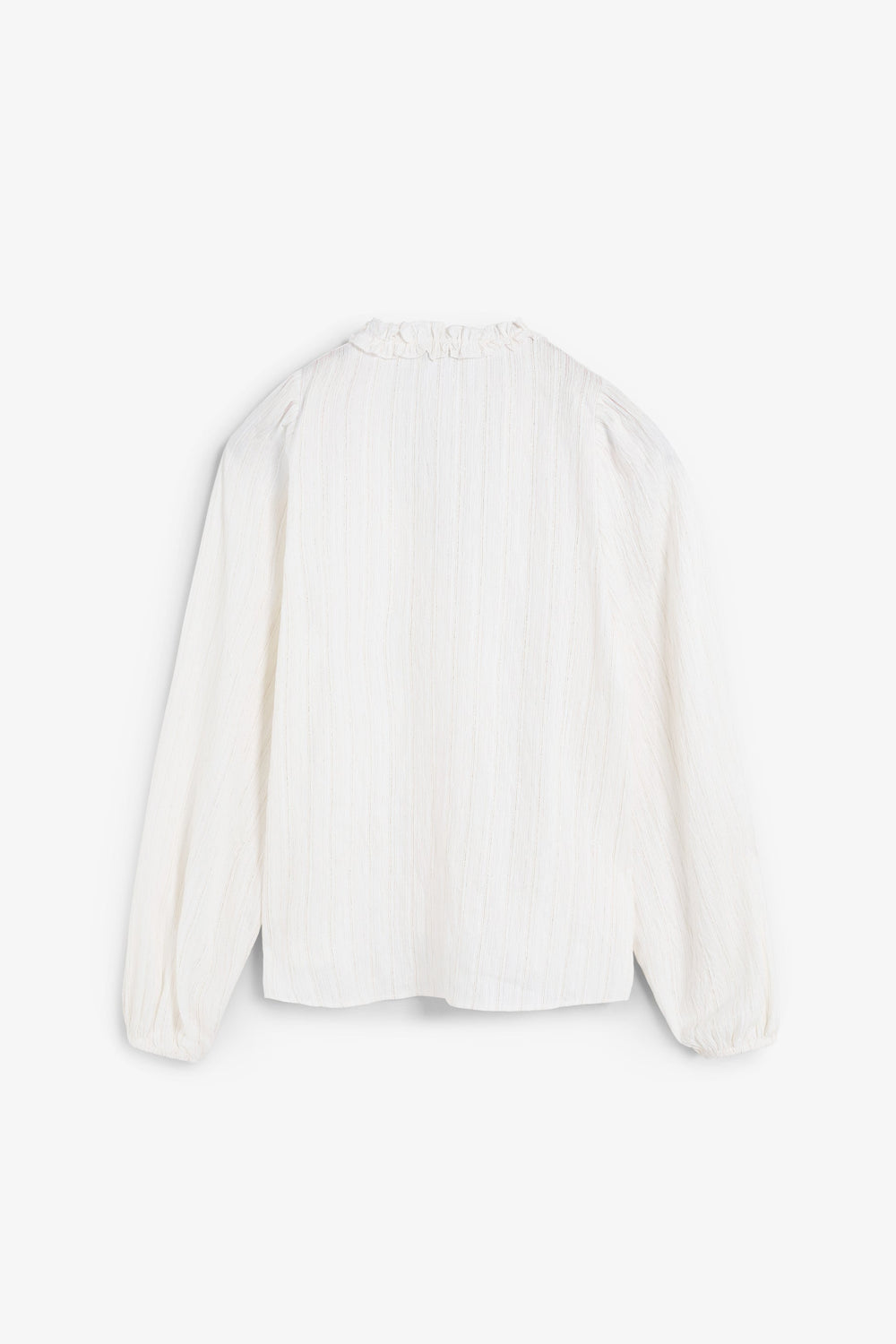 Blusa confecionada em tecido fluido com pormenores de fio metalizado. Corte regular fit, decote em V com pormenores franzidos na gola e nos ombros. Manga comprida abalonada terminada em punho. Fecho com botões à frente.