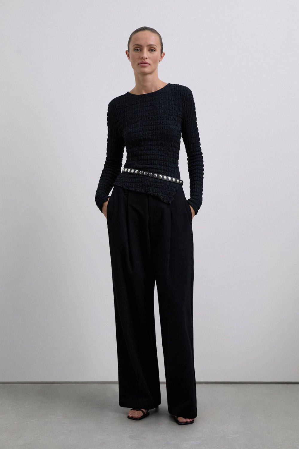 Top com decote redondo e manga comprida. Tecido leve com design com estrutura franzida.