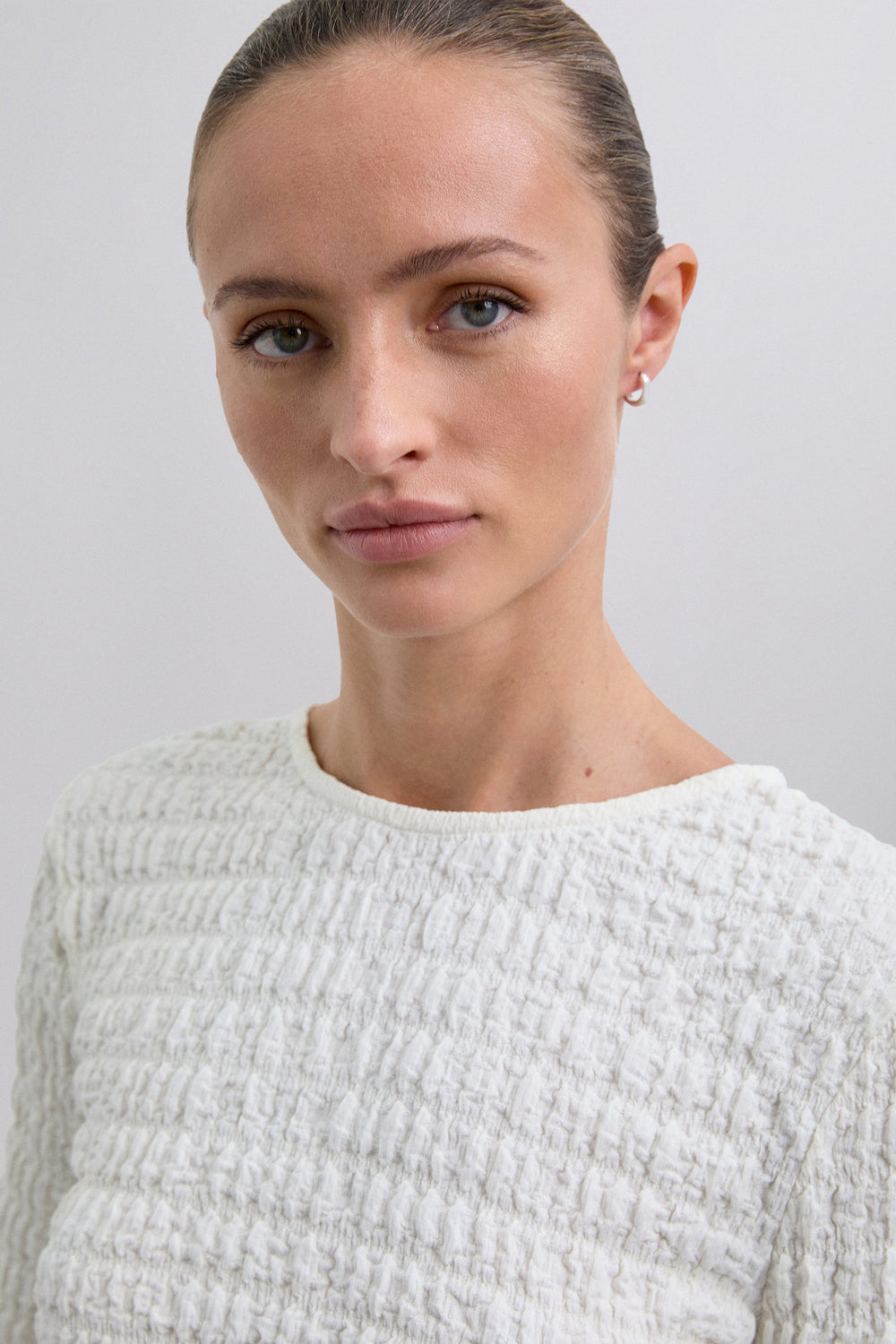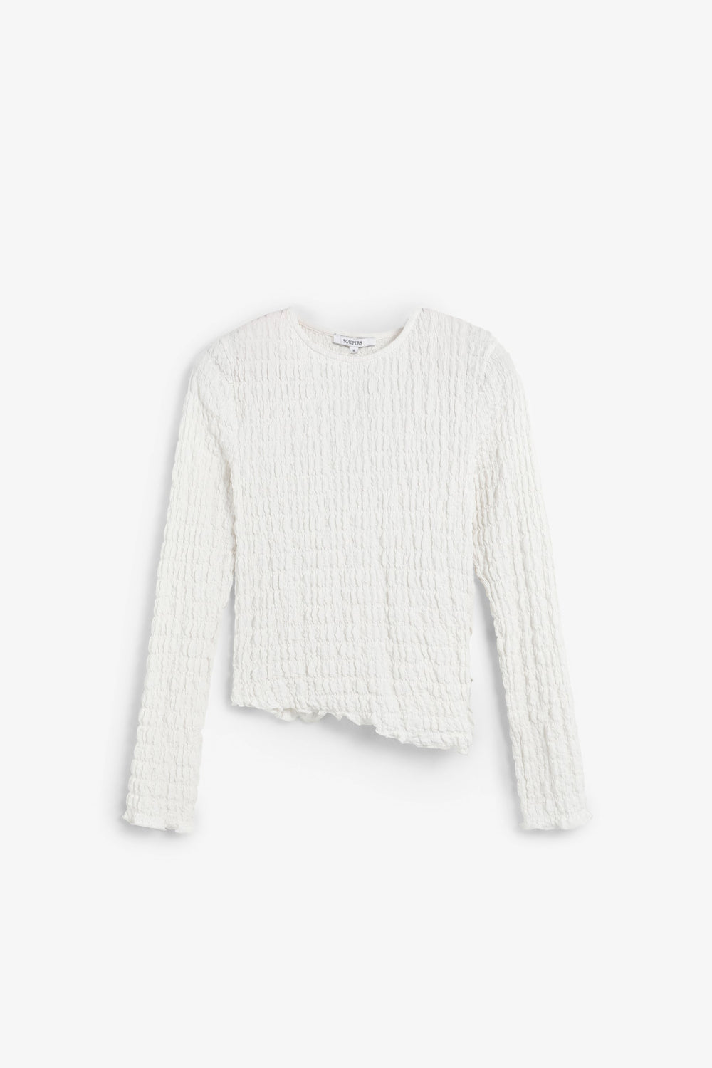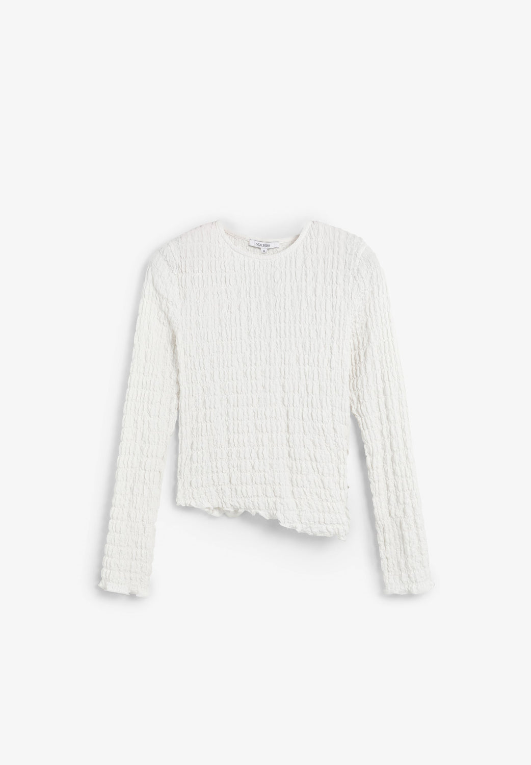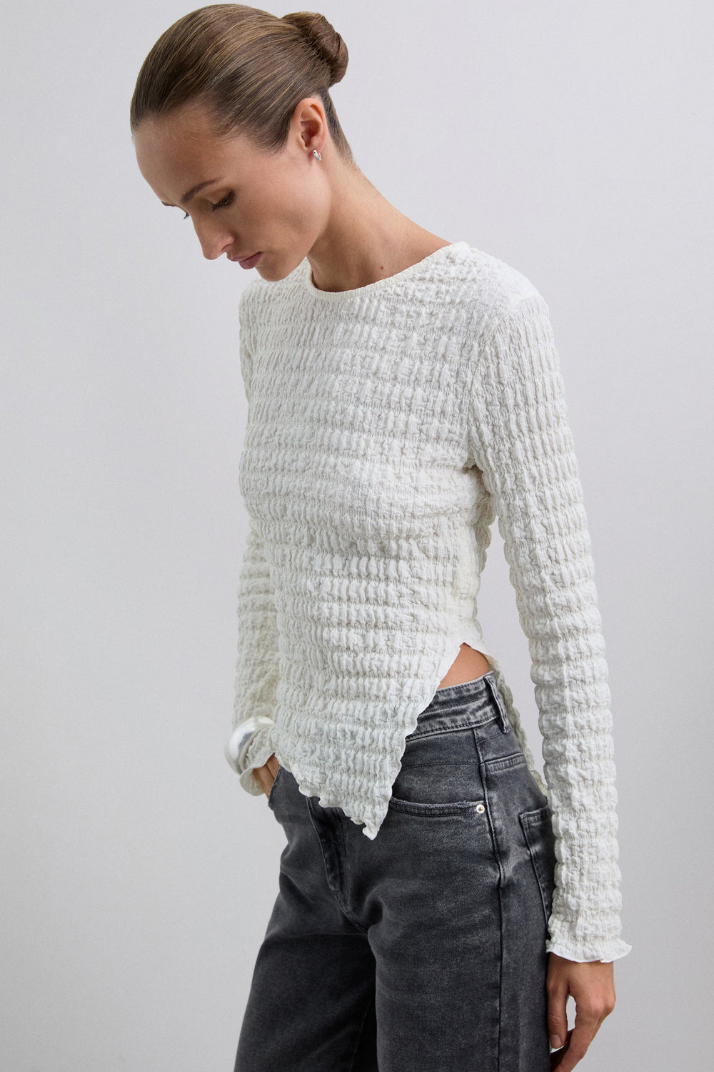 Top com decote redondo e manga comprida. Tecido leve com design com estrutura franzida.