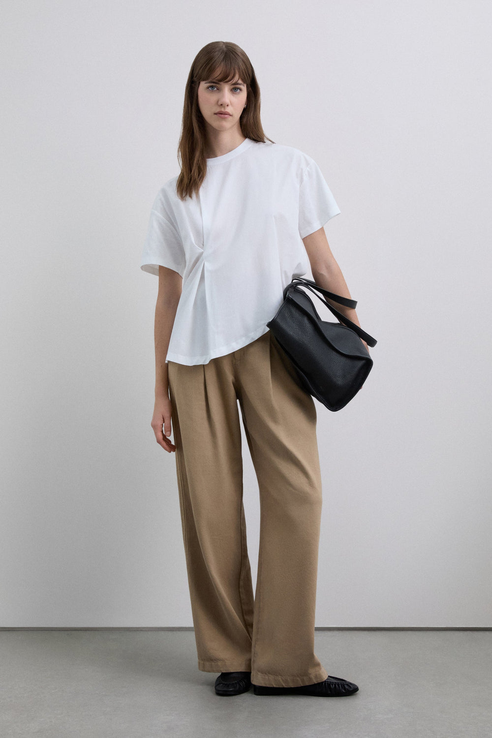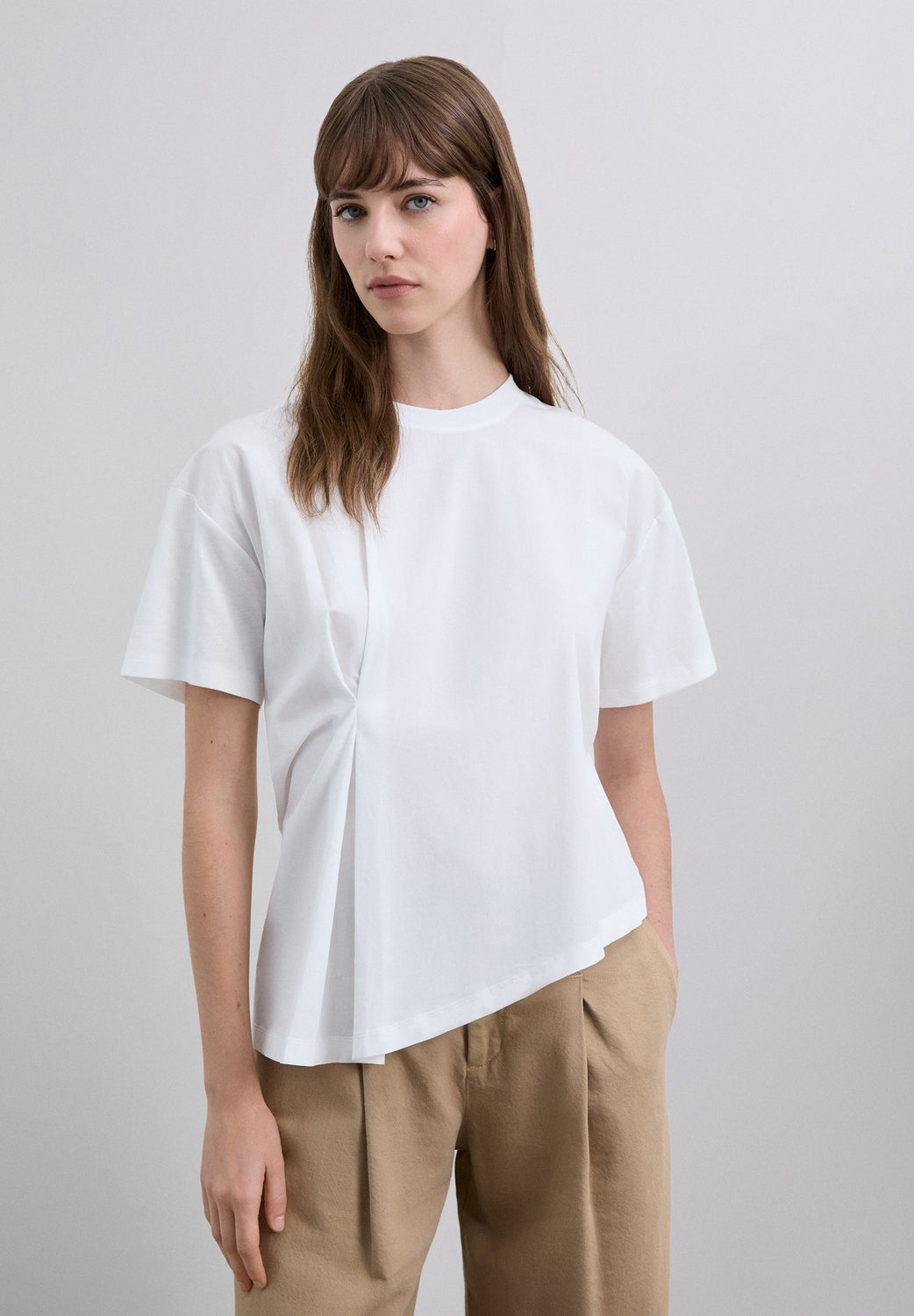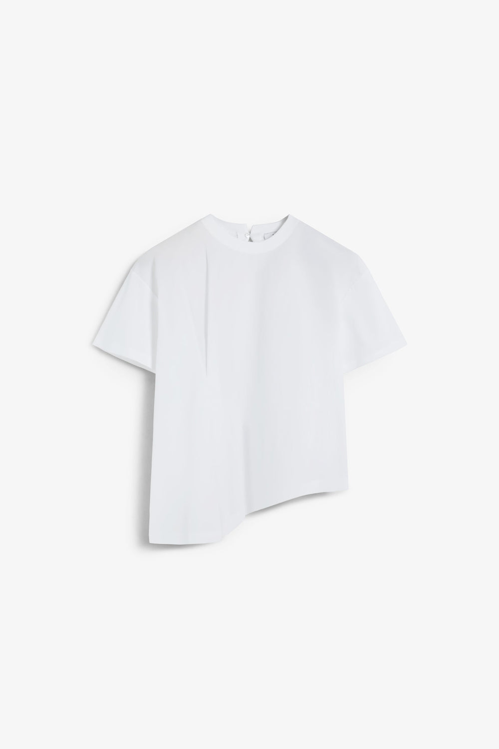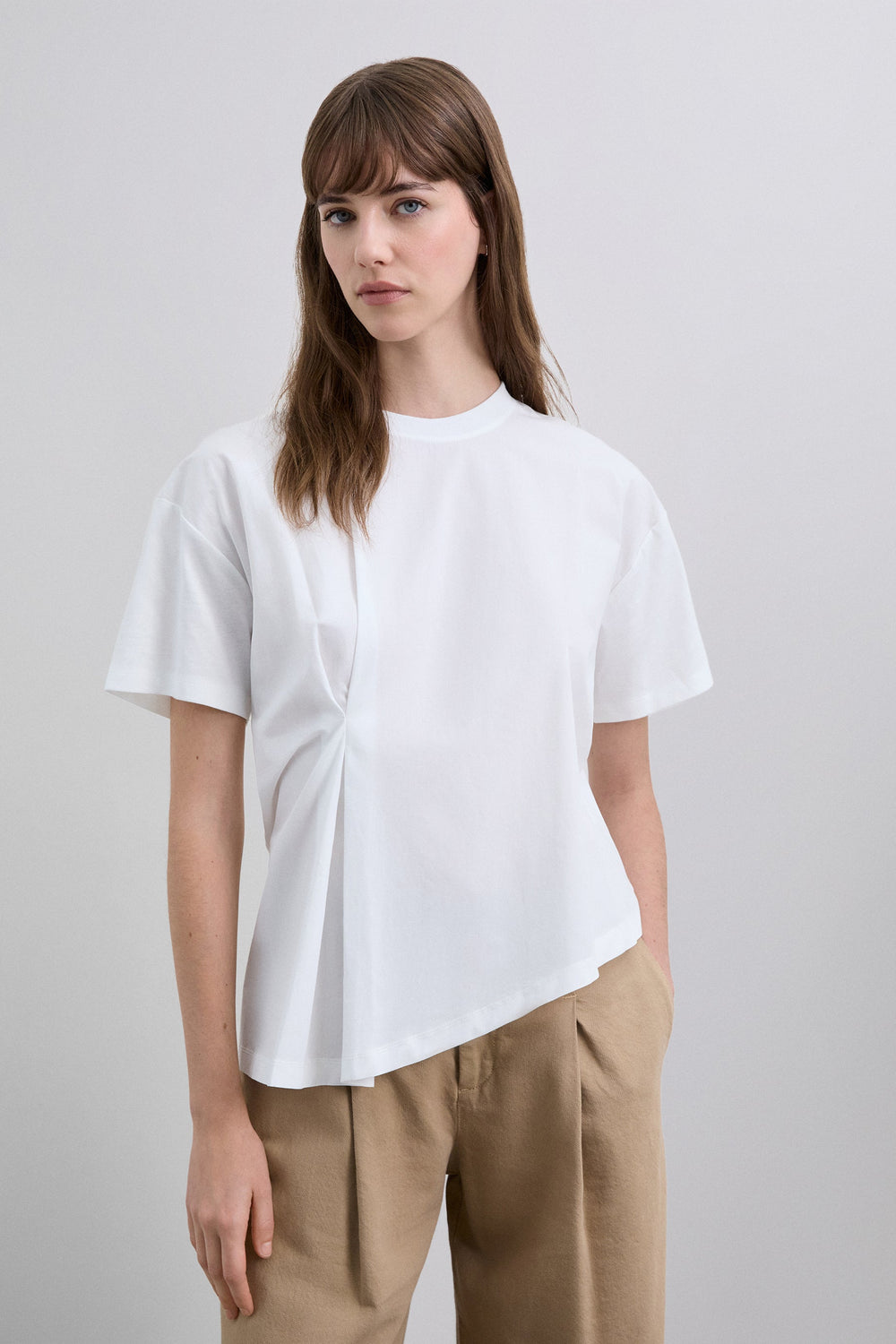T-shirt de manga curta com design assimétrico confecionada em 100% algodão BCI. Com decote redondo e um painel frontal sobreposto que cria um efeito drapeado lateral. Fecho nas costas com pequena abertura.