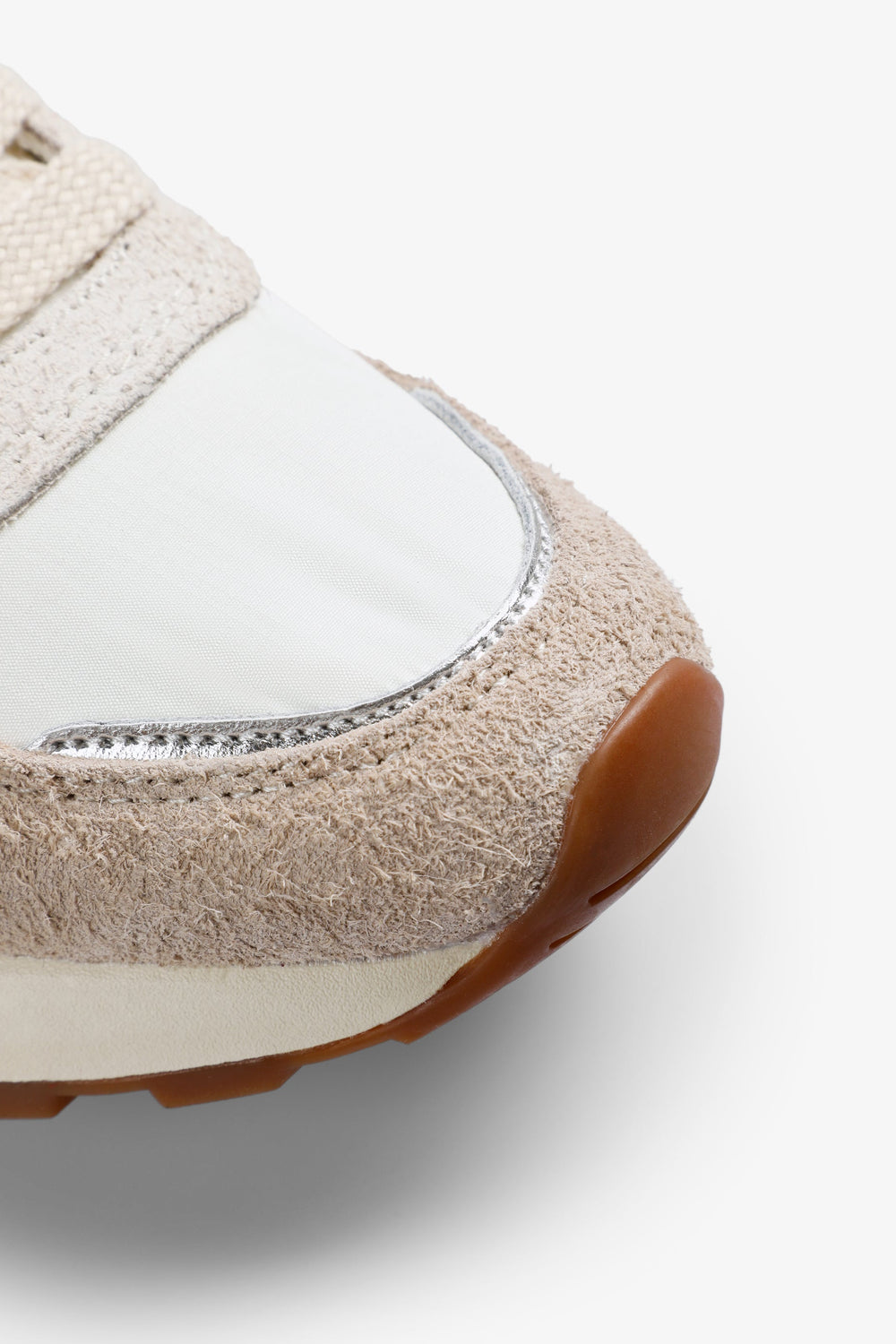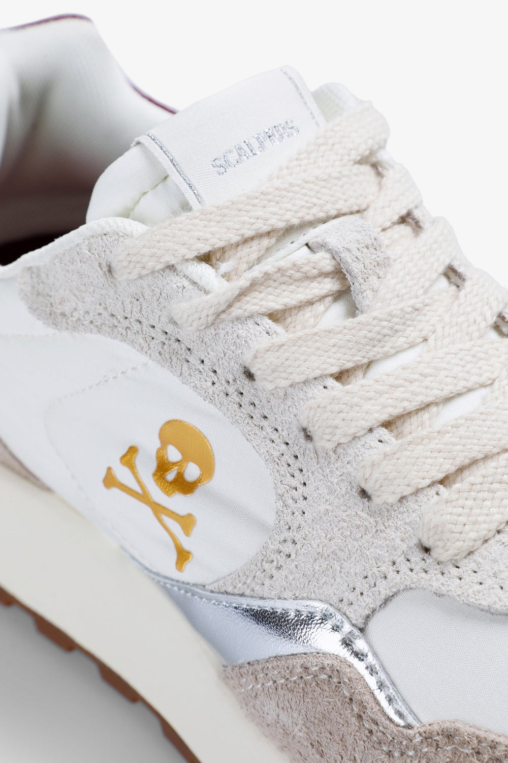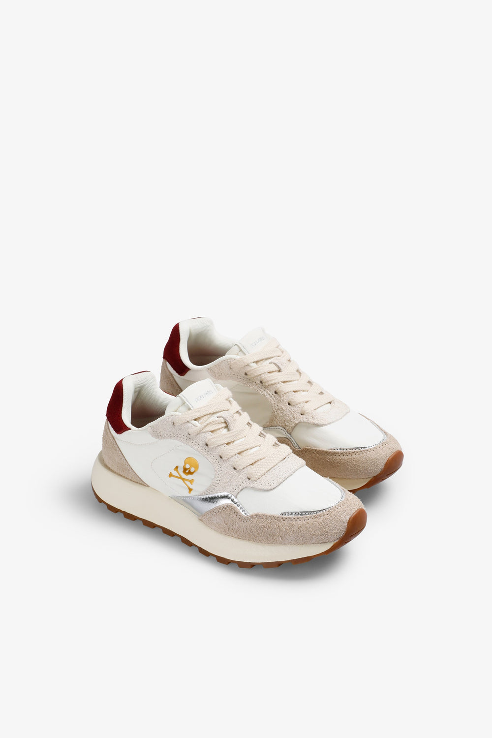 Sapatilhas combinadas com reforços em croute e pormenores em contraste. Co uma peça em contraste no calcanhar para um acabamento dinâmico. Pormenor de skull em dourado nas laterais.