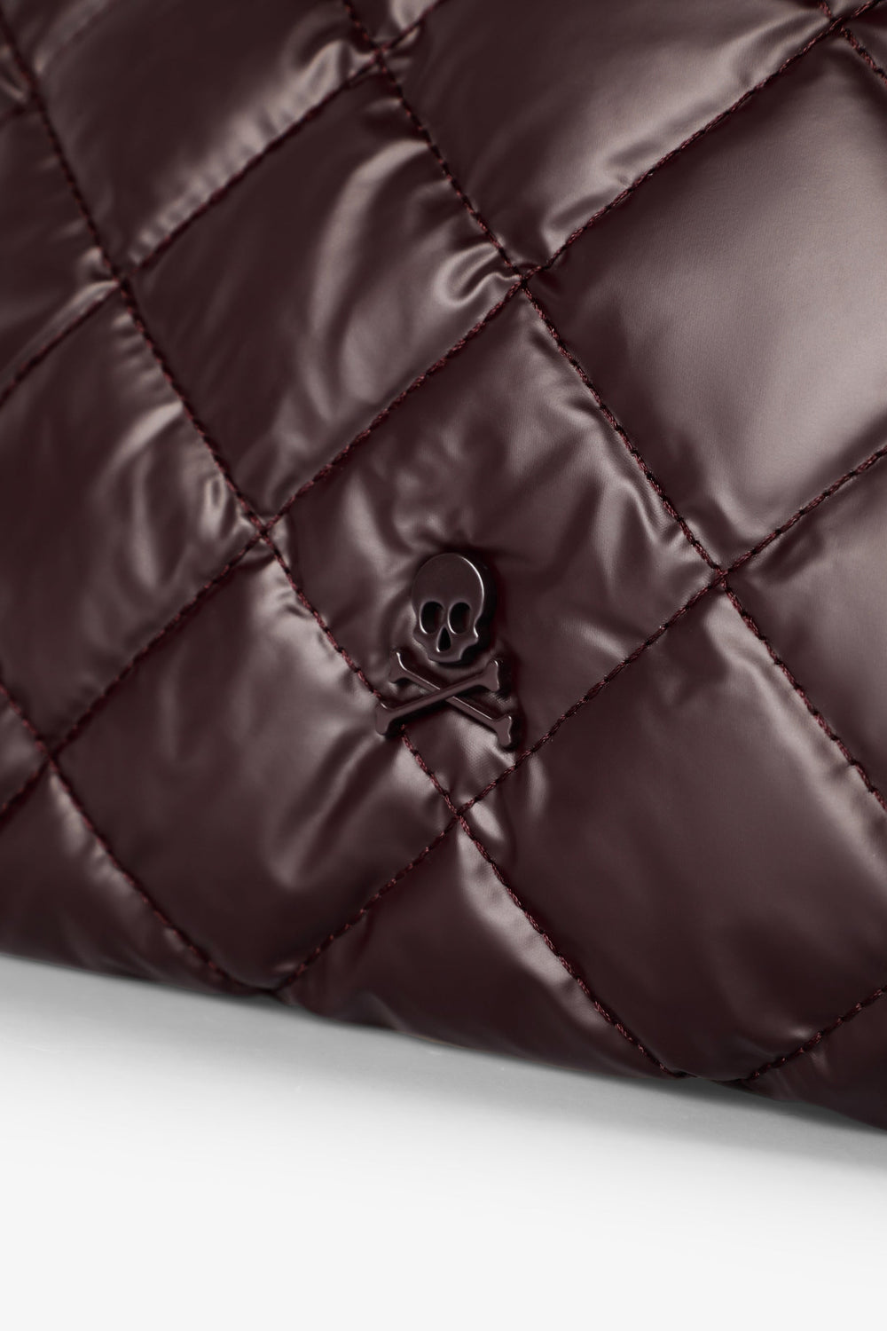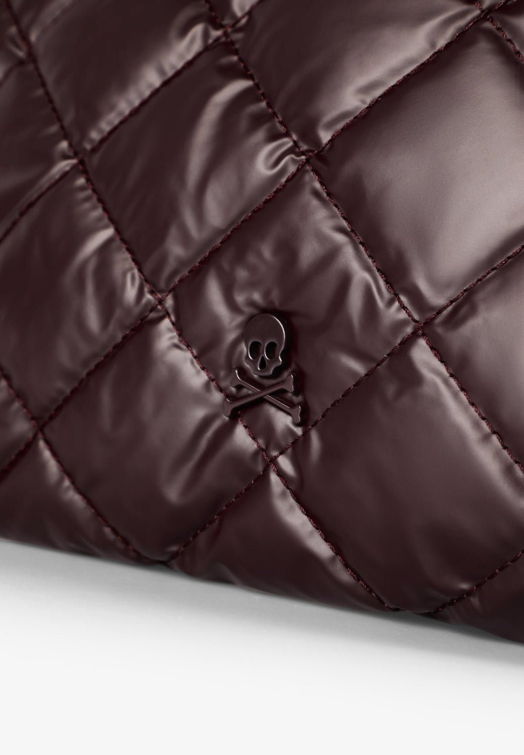 Bolsa tote bag acolchoada. Alça dupla. Fecho com botão magnético. Forro e bolso interior com fecho de correr. Pormenor do logótipo no bolso e remendo de skull metalizada à frente.