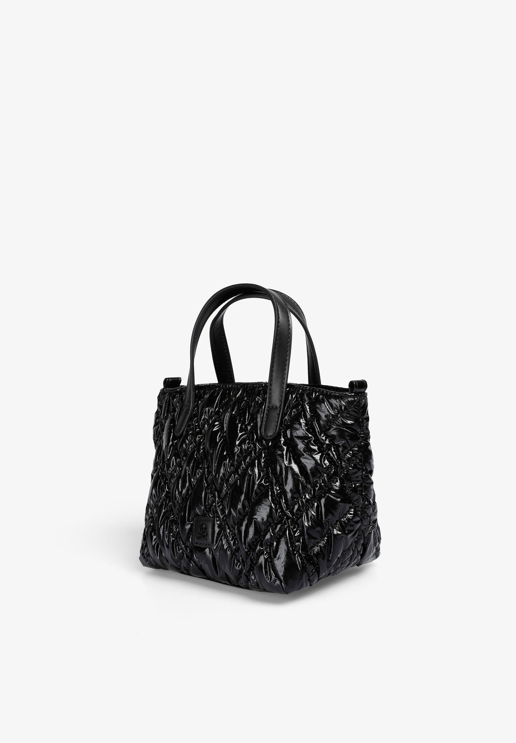 Bolsa mini acolchoada confecionada em PU. Dupla alça, curta e corrente. Interior forrado e bolso com zip. Fecho de correr. Pormenor de remendo de logótipo à frente.