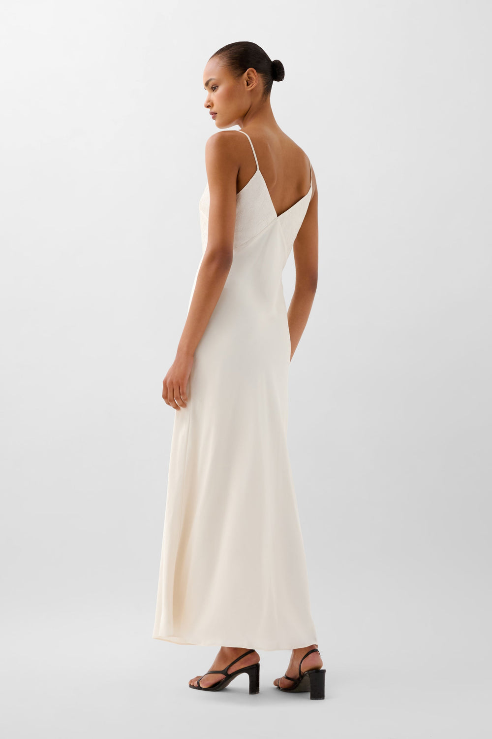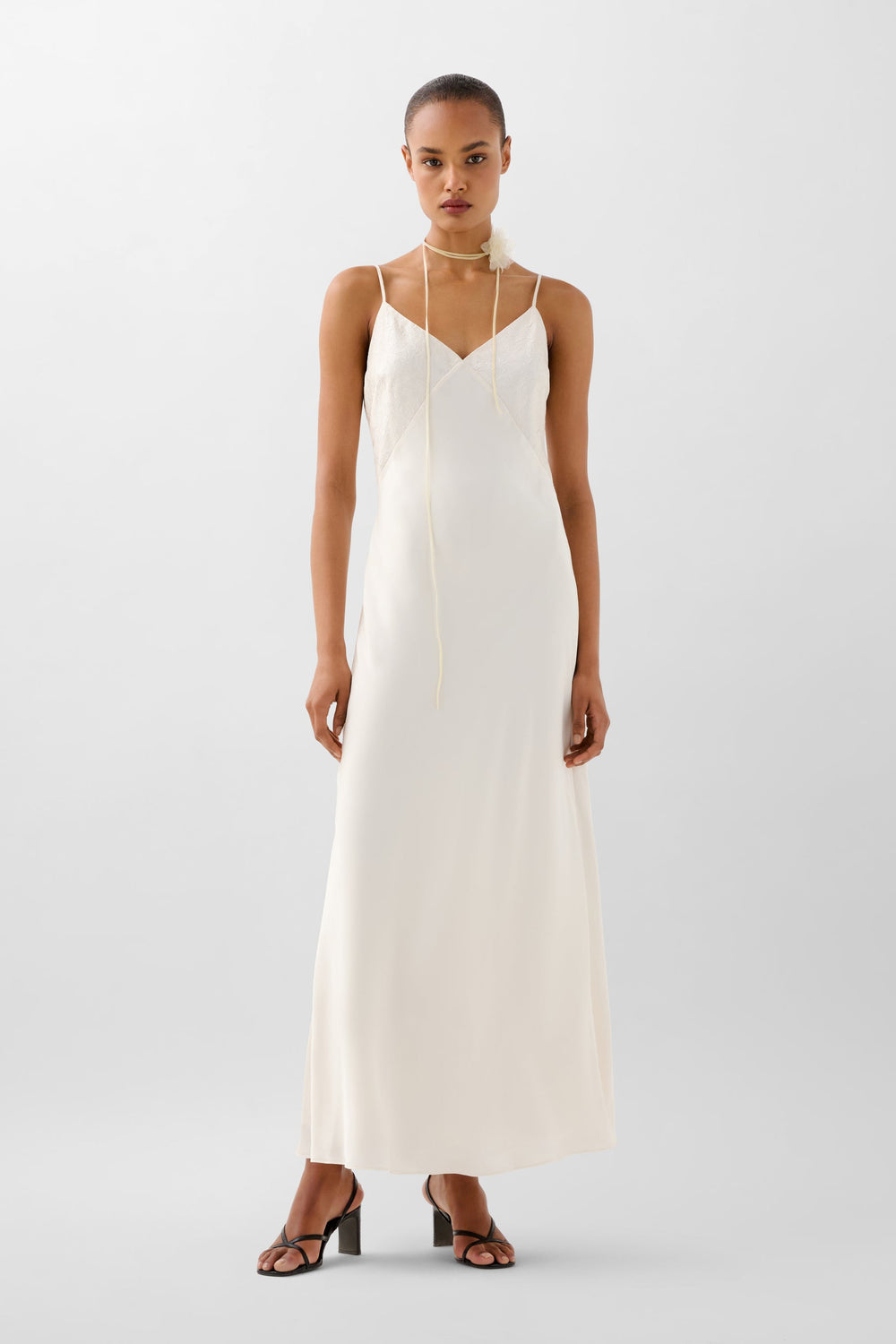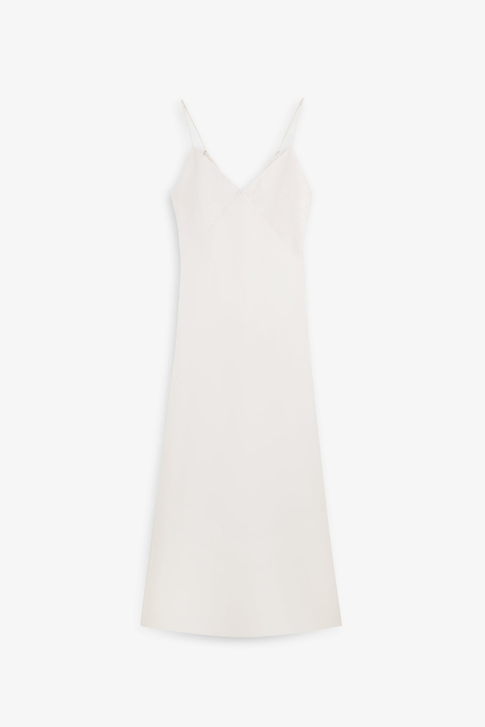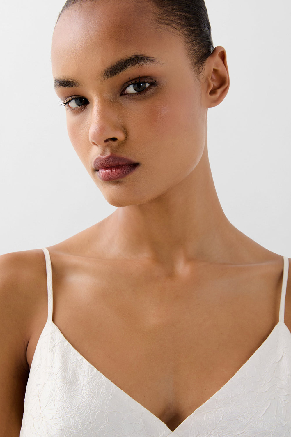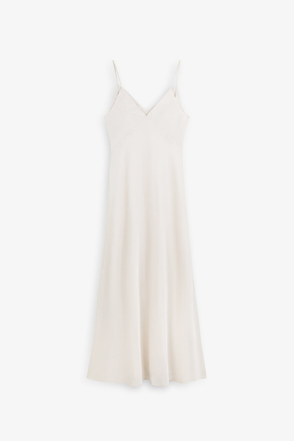 Vestido confecionado em tecido fluido com textura. Corte slim fit, comprido, com alças finas ajustáveis. Decote em bico.