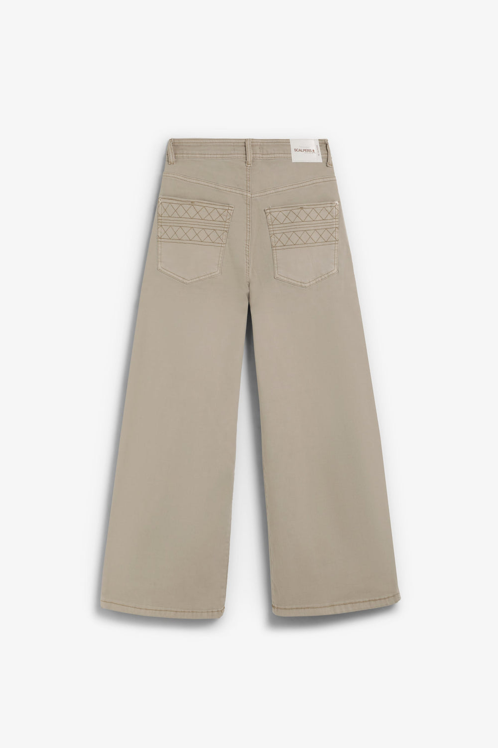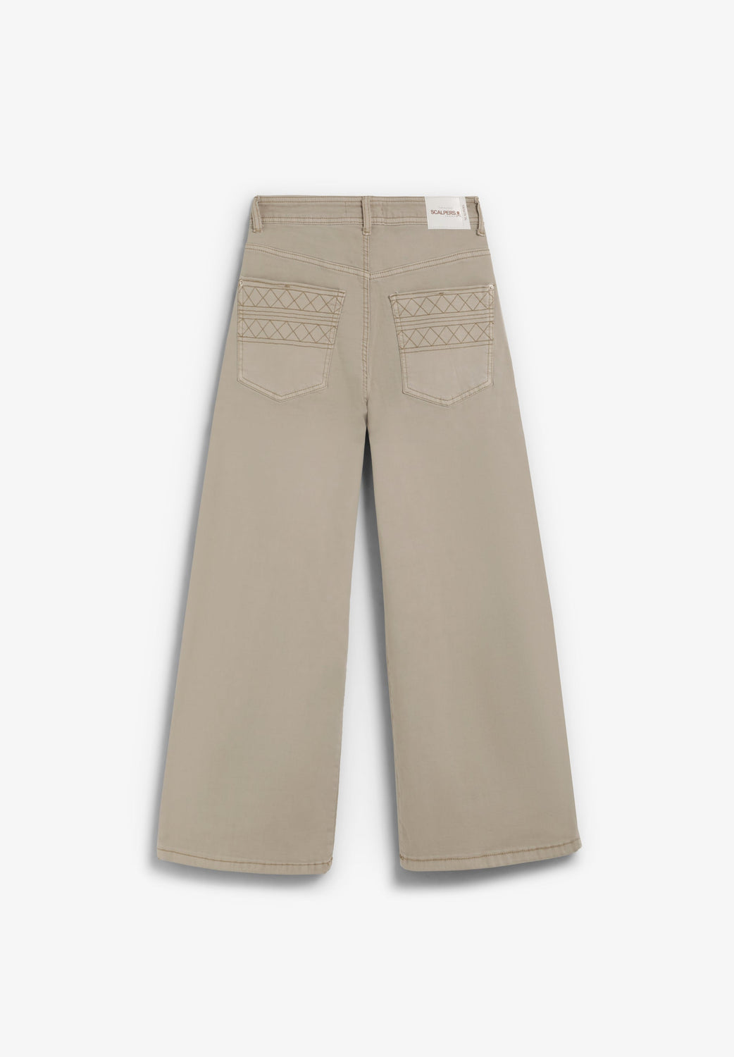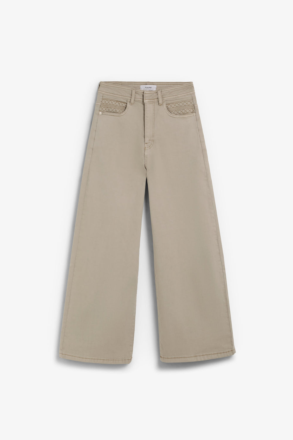 Calças culottes de cintura subida em sarja elástica. Pormenores bordados na cintura e nos bolsos traseiros, para um acabamento texturado. Silhueta de perna ampla.