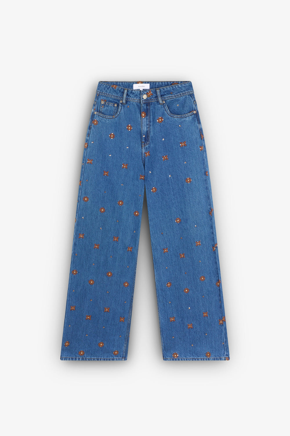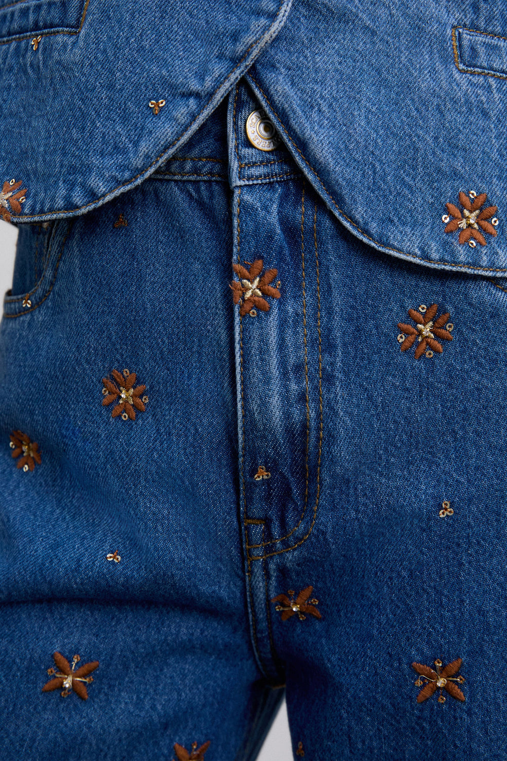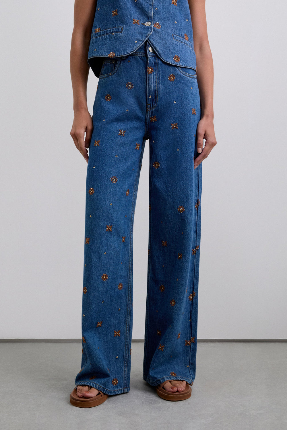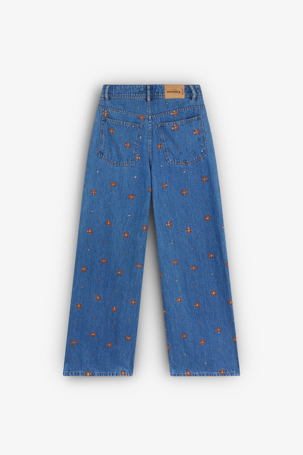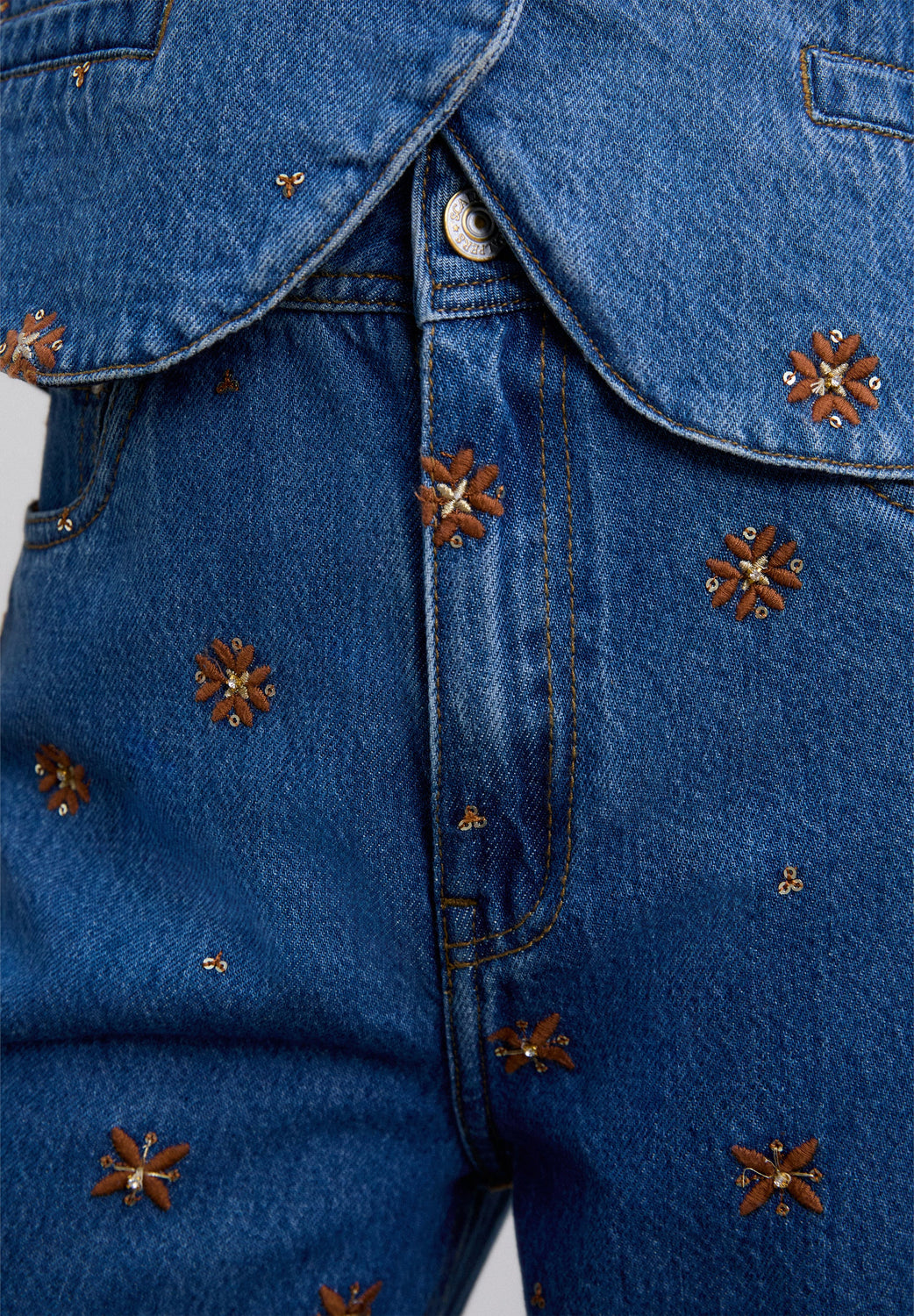 Calças a direito denim de cintura alta. Pormenores de flores bordadas. Bolsos à frente e atrás. Fecho com botão e presilhas na cintura. Pormenor de logótipo em etiqueta atrás.