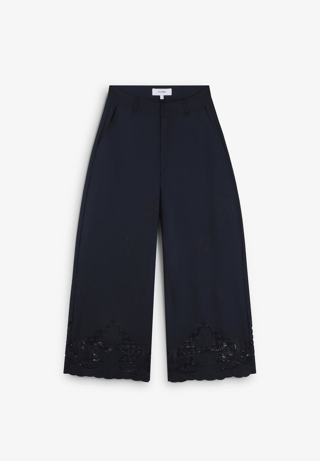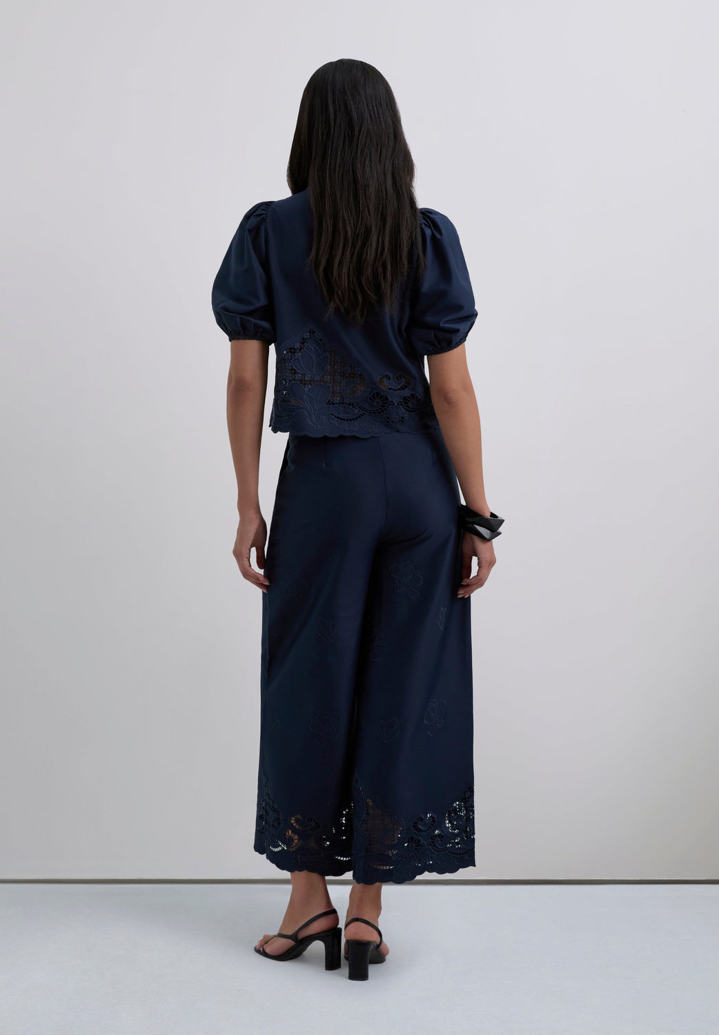 Calças compridas culotte. Bordado rendilhado em toda a perna, especialmente à volta da bainha. Bolsos frontais inclinados. Acabamento ligeiramente em volta.