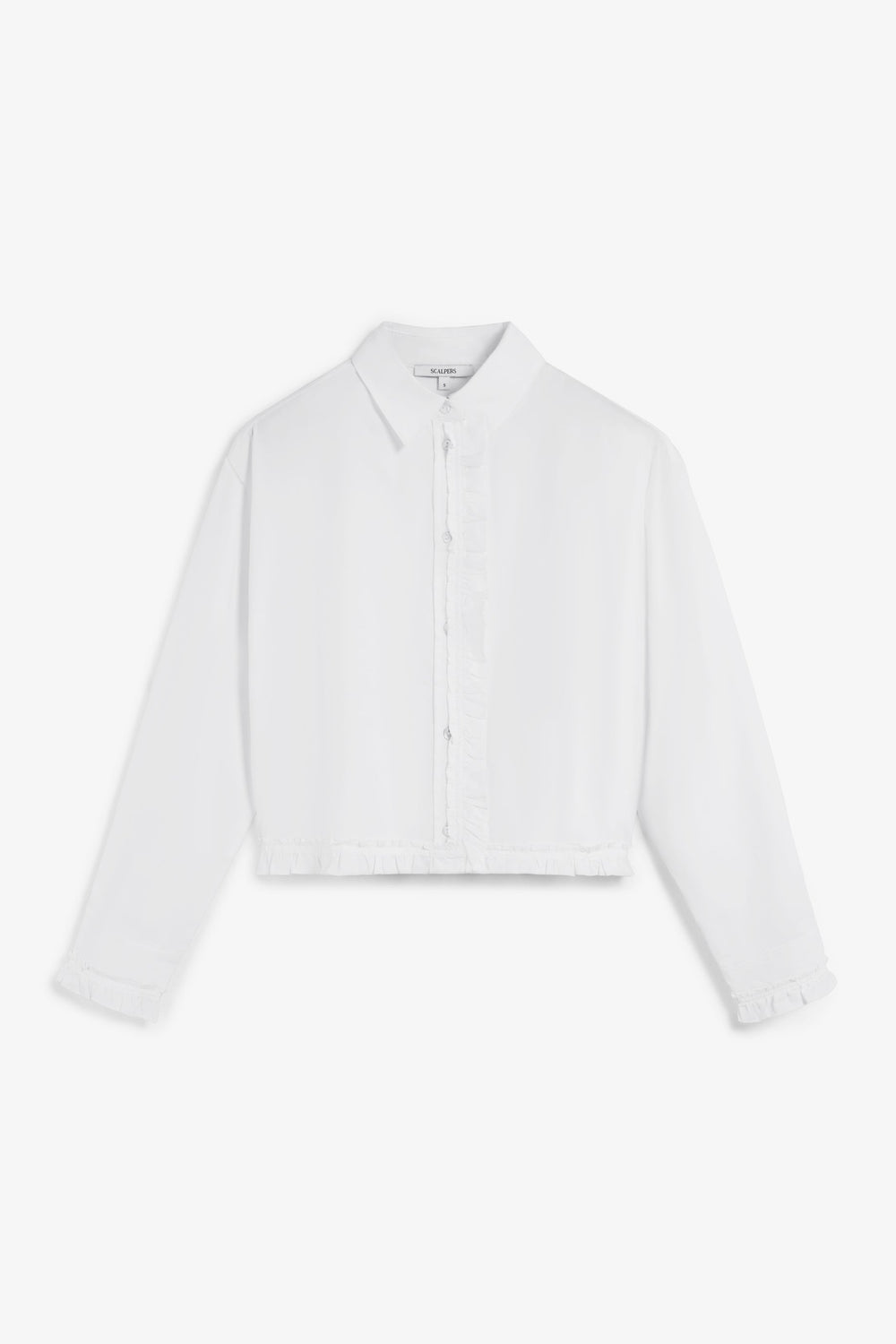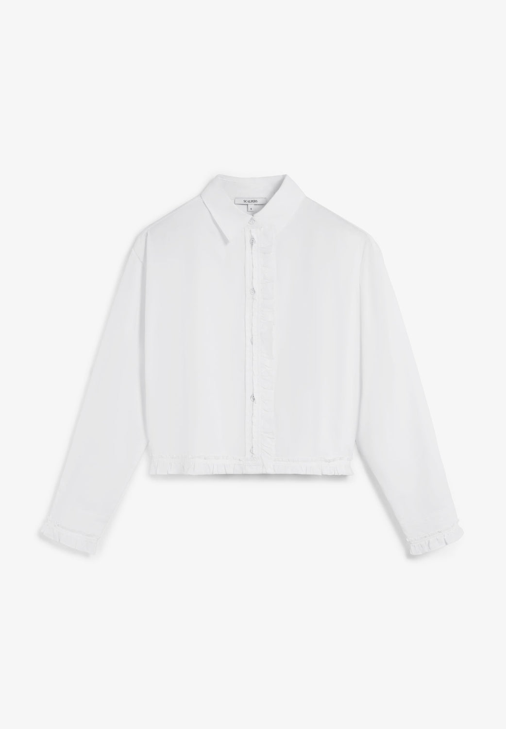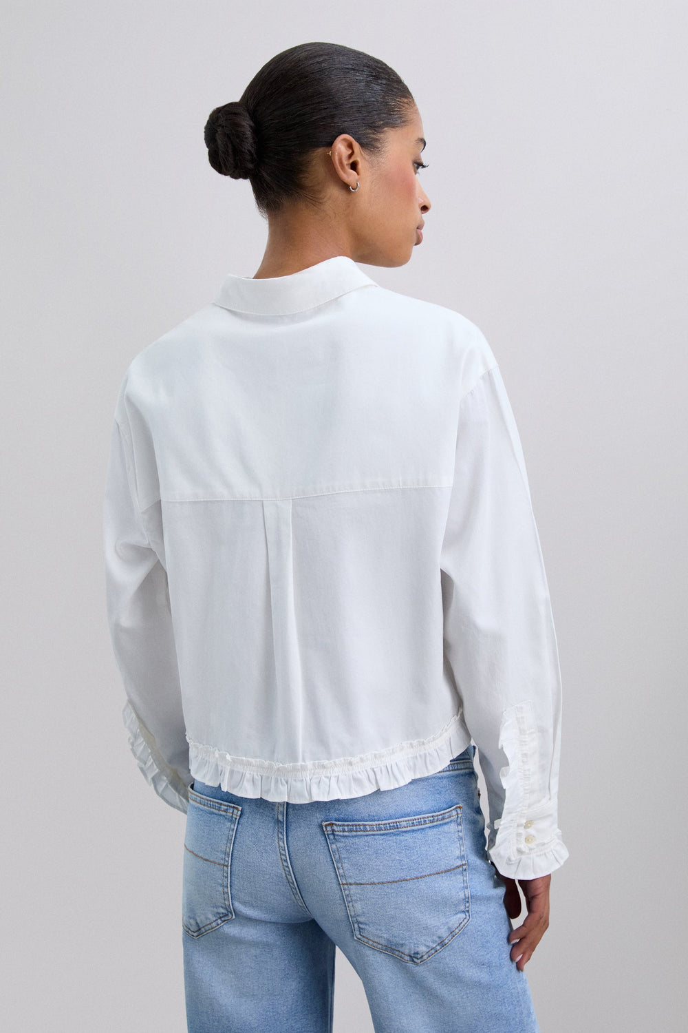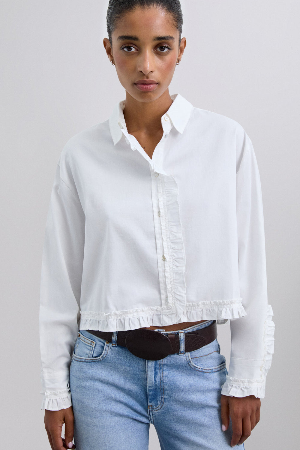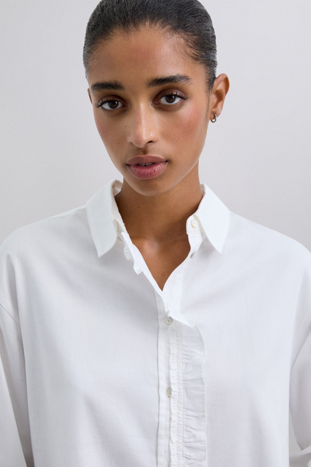 Camisa confecionada em algodão 100% BCI. Corte cropped. Gola de camisa. Pormenor de franzidos na aba frontal, punhos e na bainha. Fecho com botões. Manga comprida.