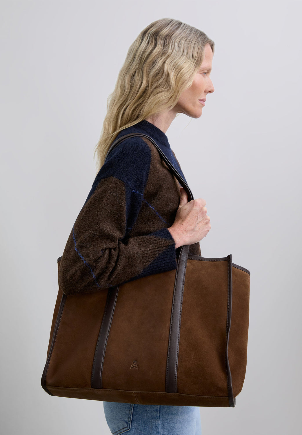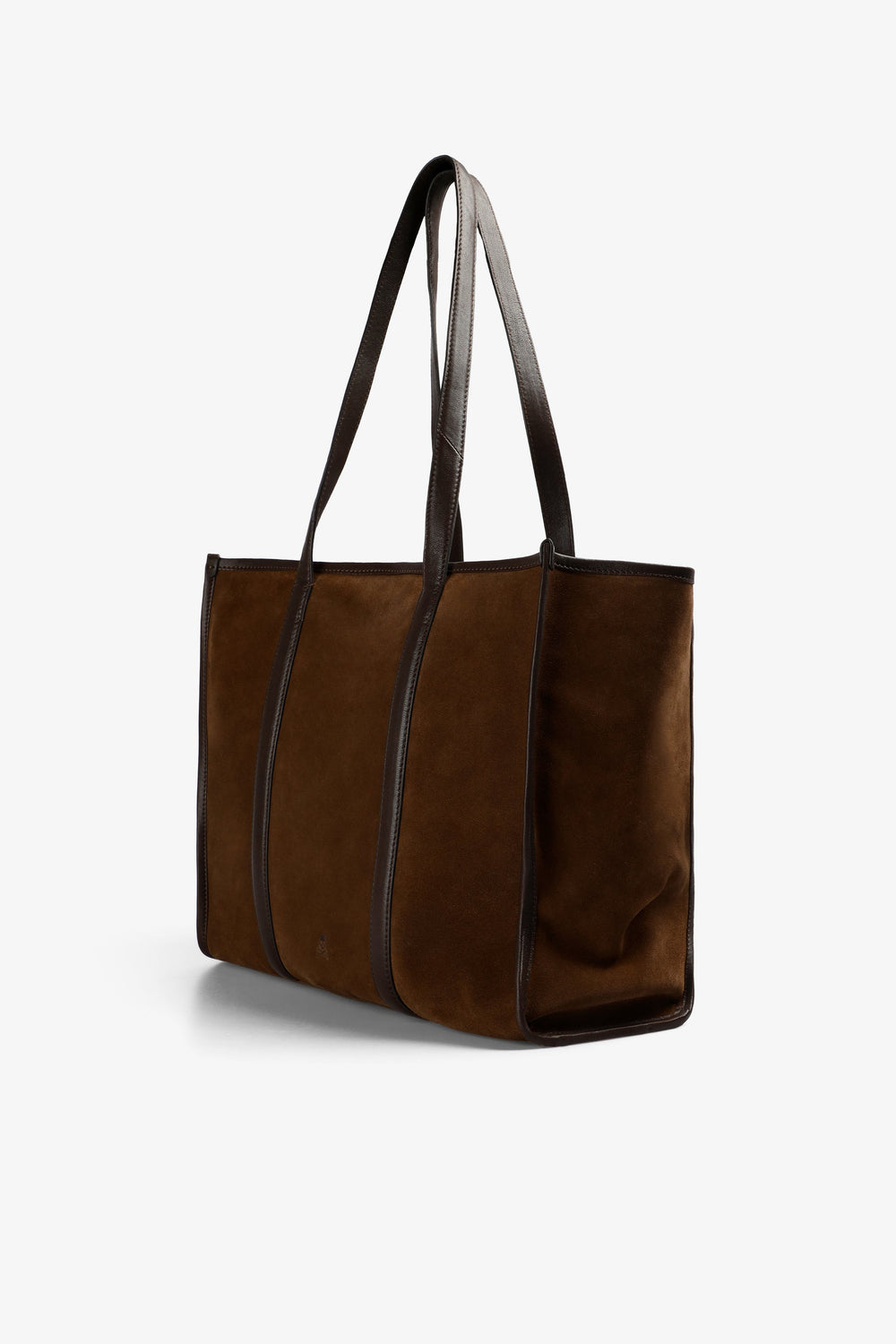 Bolsa shopper confecionada em 100% camurça. Pormenores em pele em contraste. Fecho de correr.