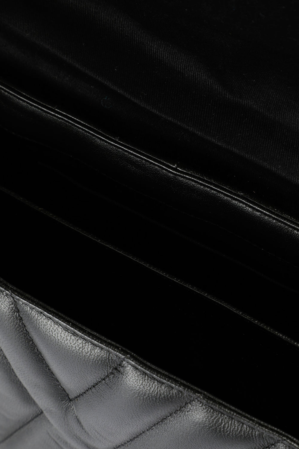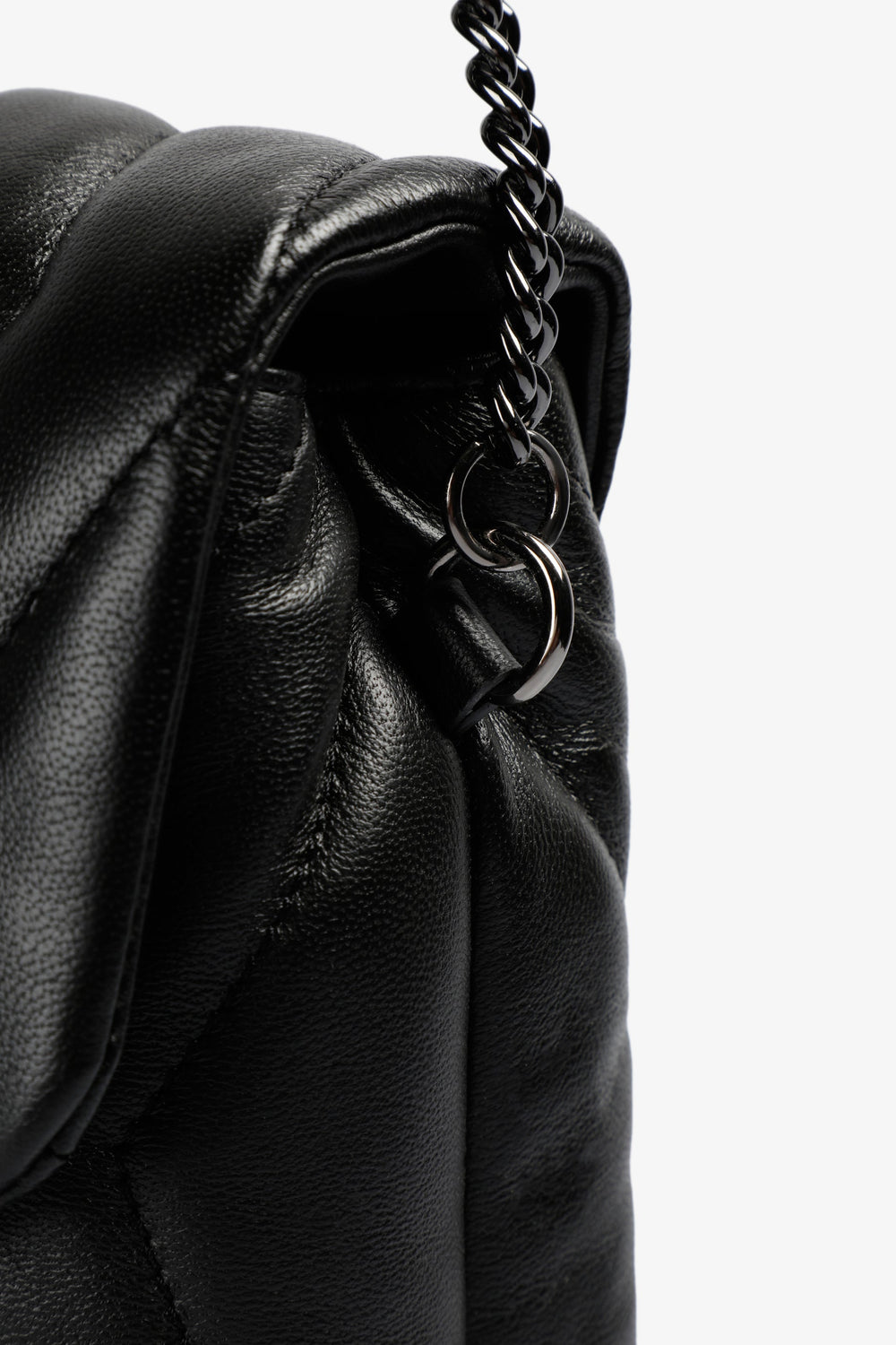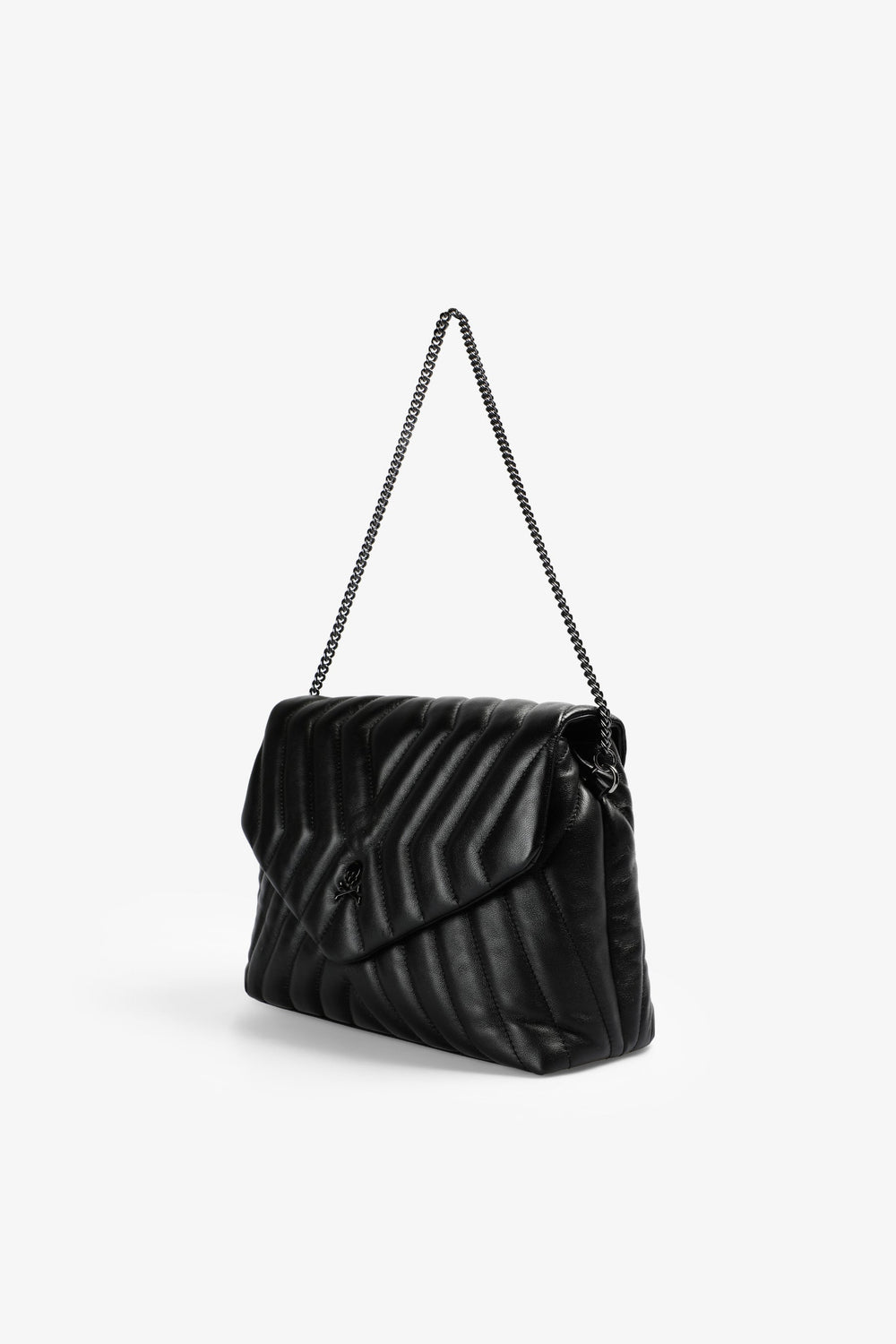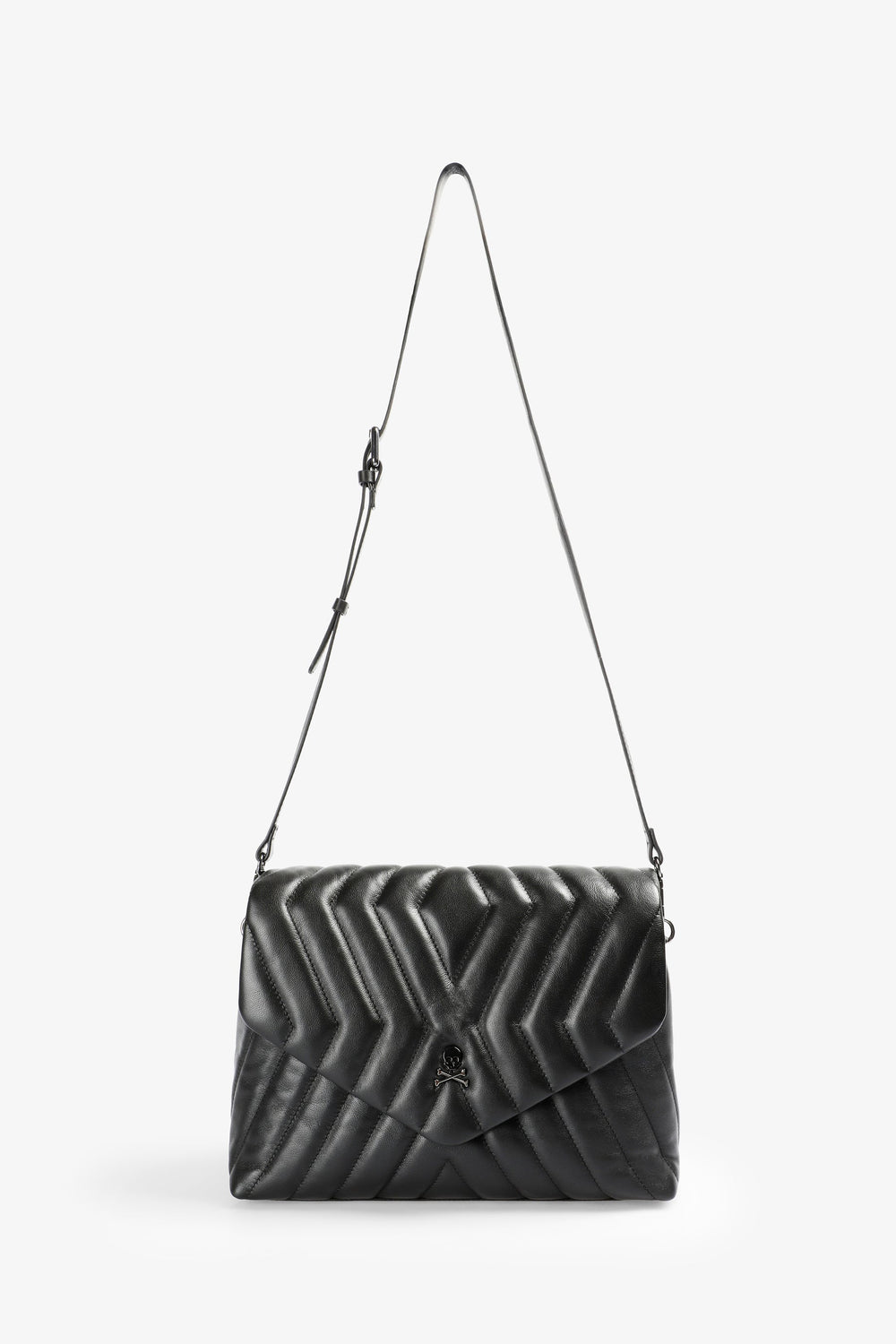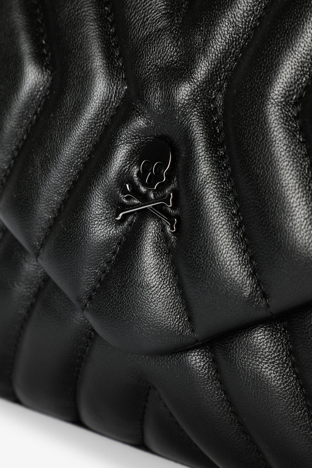 Bolsa confecionada em 100% pele acolchoada. Fecho com placket e íman, alça de corrente e compartimentos interiores. Skull metálica frontal.