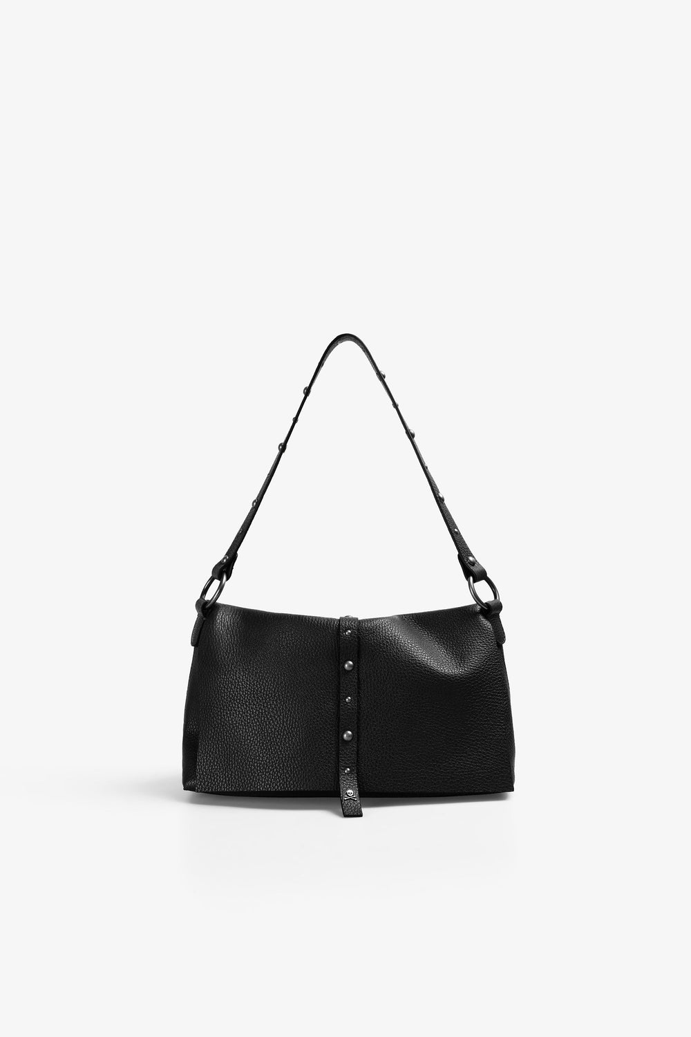 Bolsa confecionada em 100% pele com pormenor de studs. Fecho com placket. Alça curta e alça comprida.