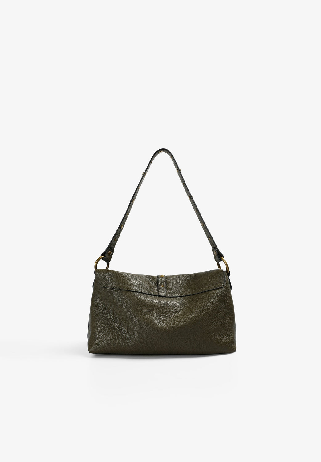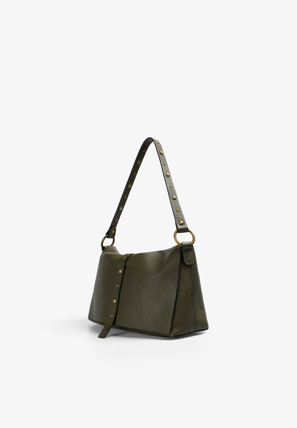 Bolsa confecionada em 100% pele com pormenor de studs. Fecho com placket. Alça curta e alça comprida.