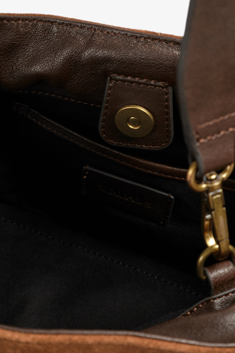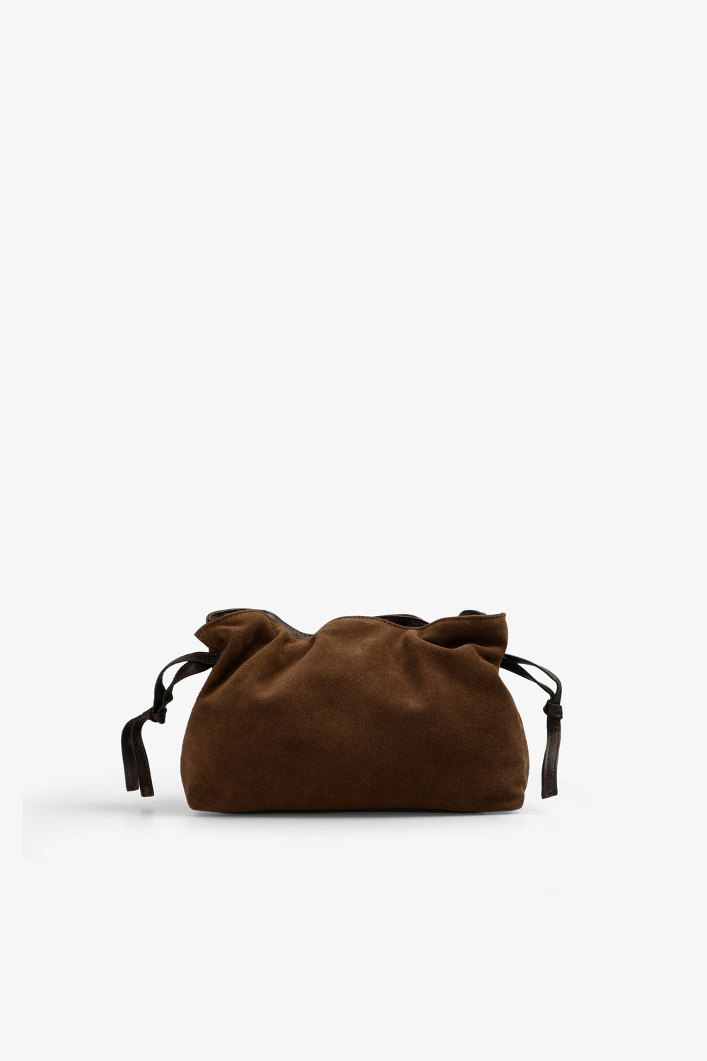 Mala confecionada em 100% camurça. Alças de napa em contraste. Forro interior. Fecho magnético. Bolso interior. Acabamentos metálicos dourados personalizados.
