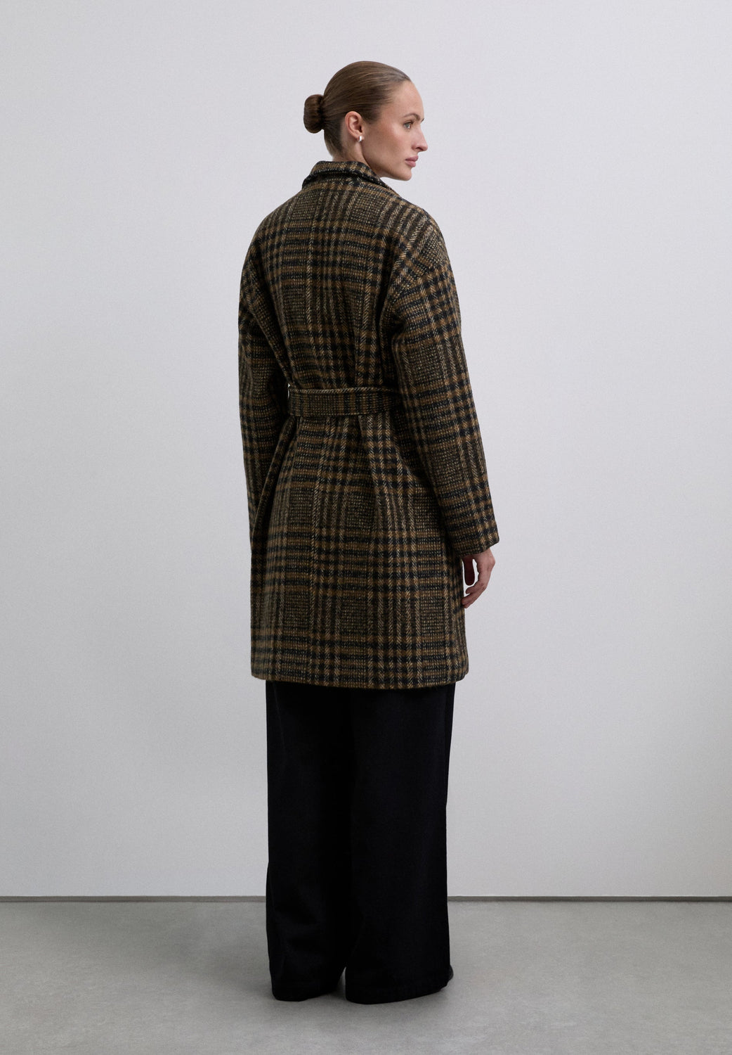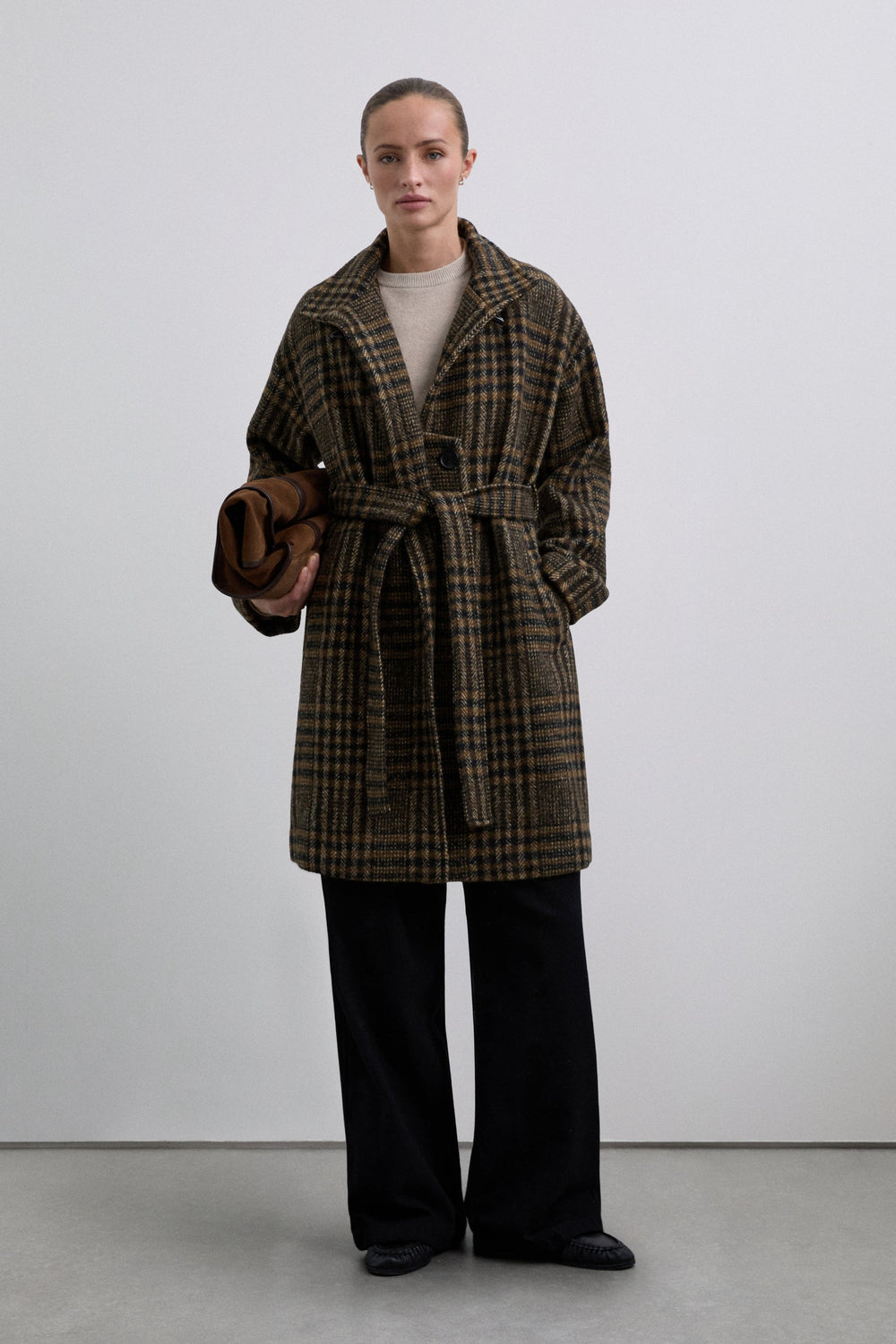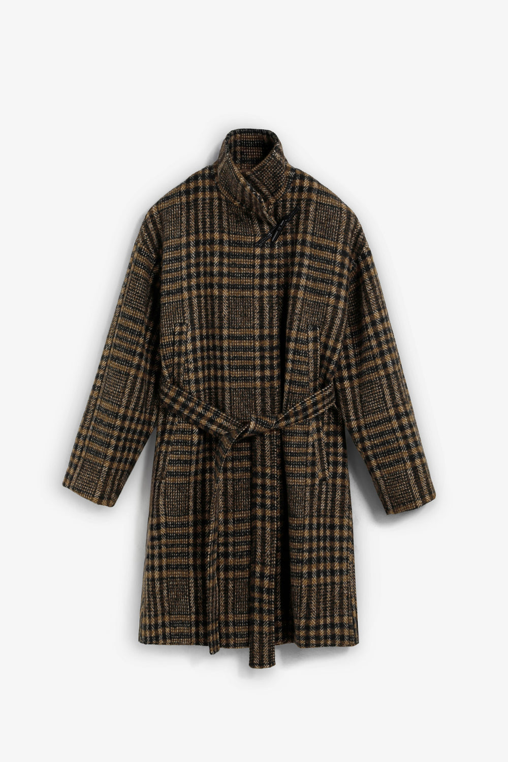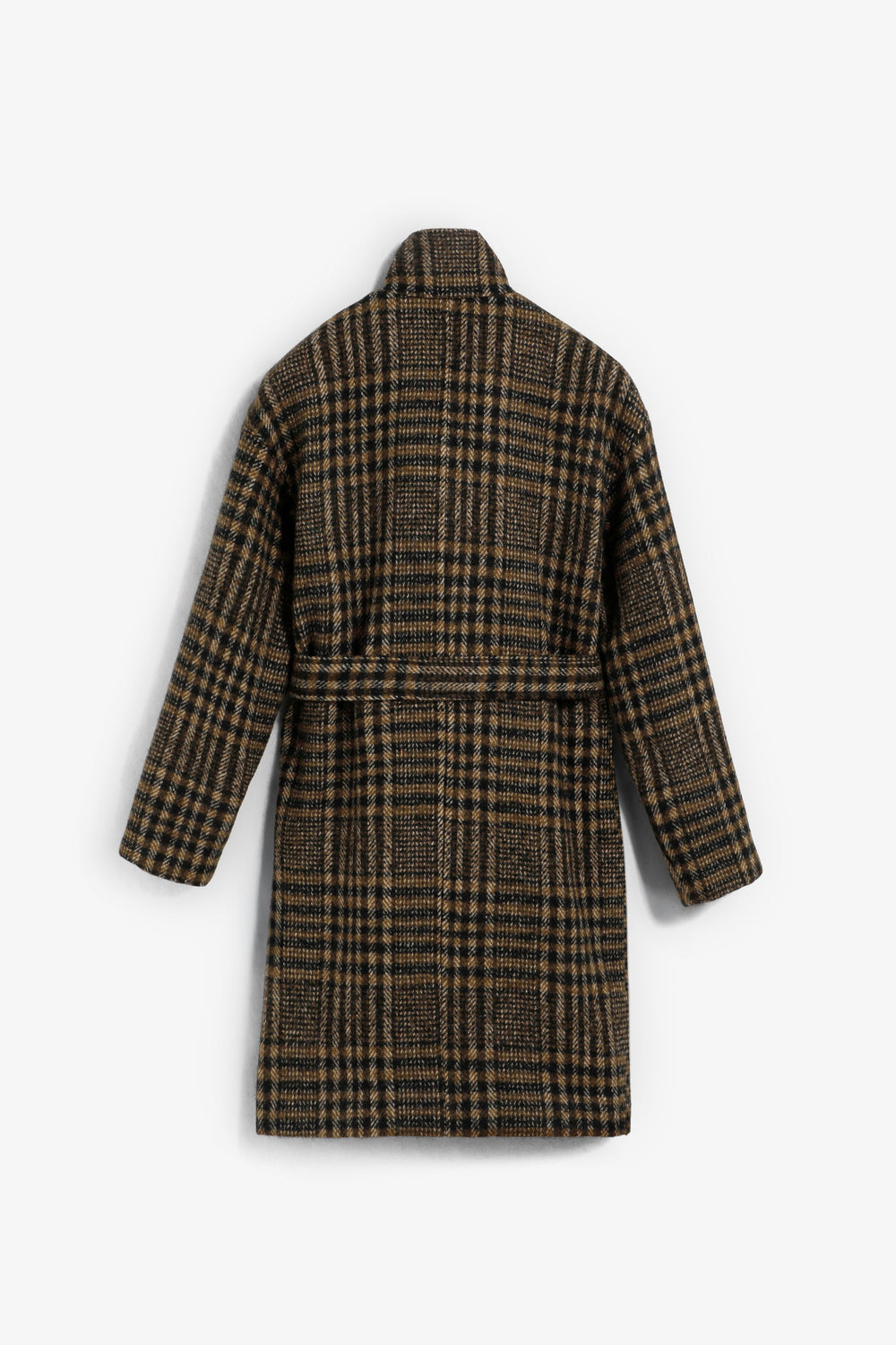 Casaco curto confecionado em lã. Gola a direito levantada. Botão de tipo loop na parte superior. Fecho interior com 2 botões e fecho exterior com cinto ajustável. Manga comprida com punho dobrado.