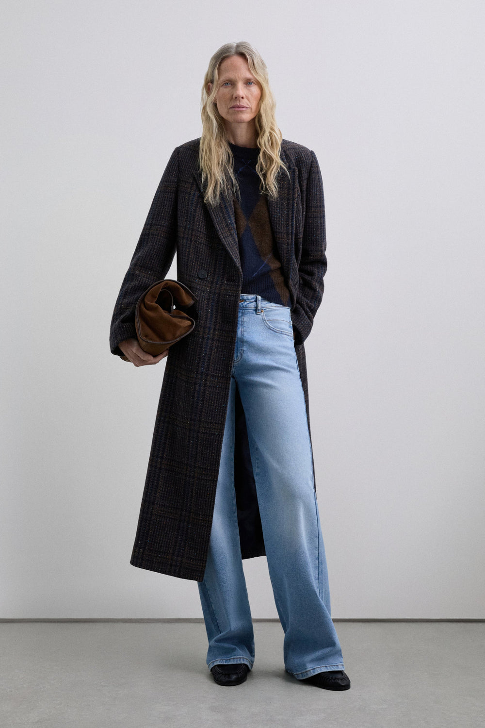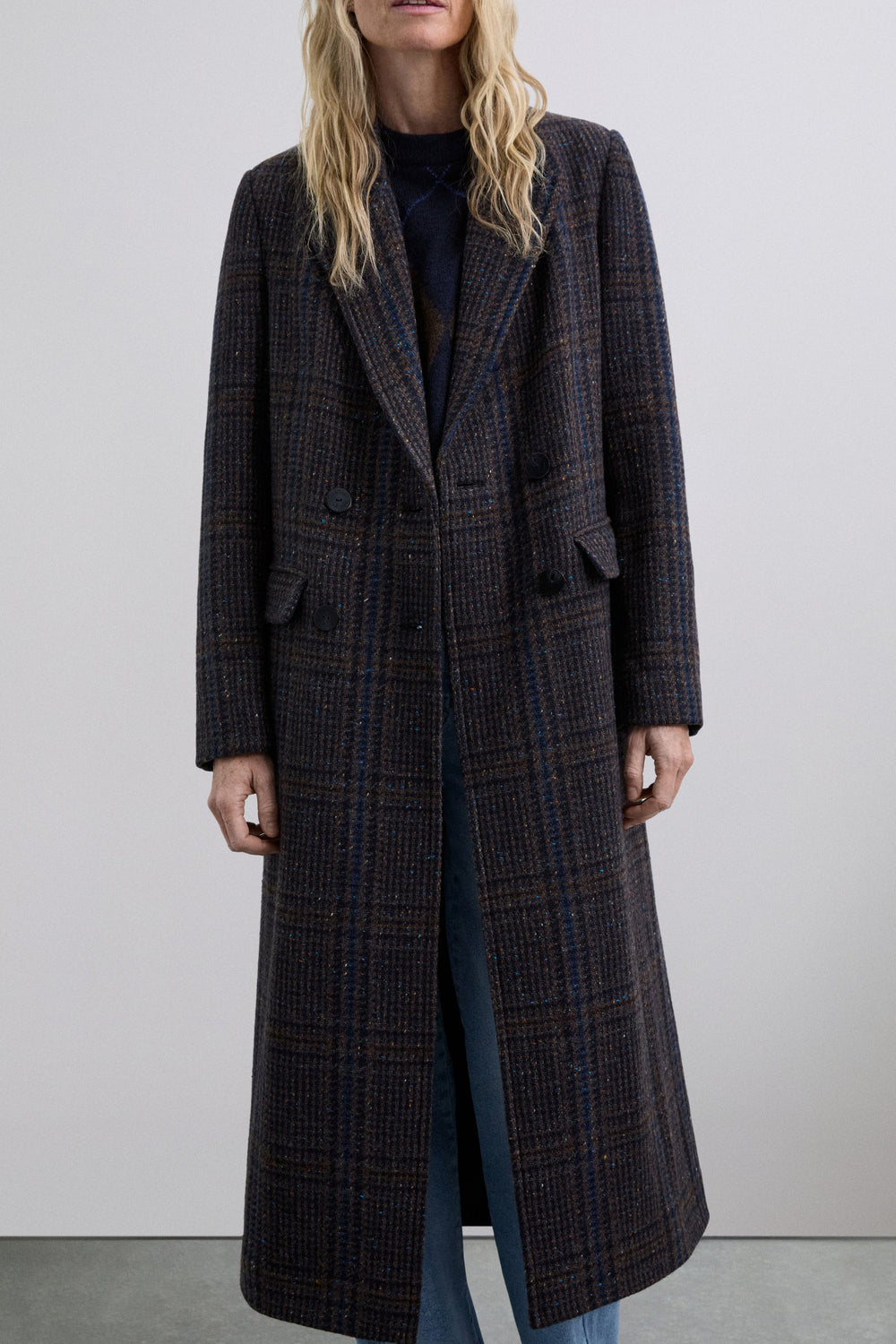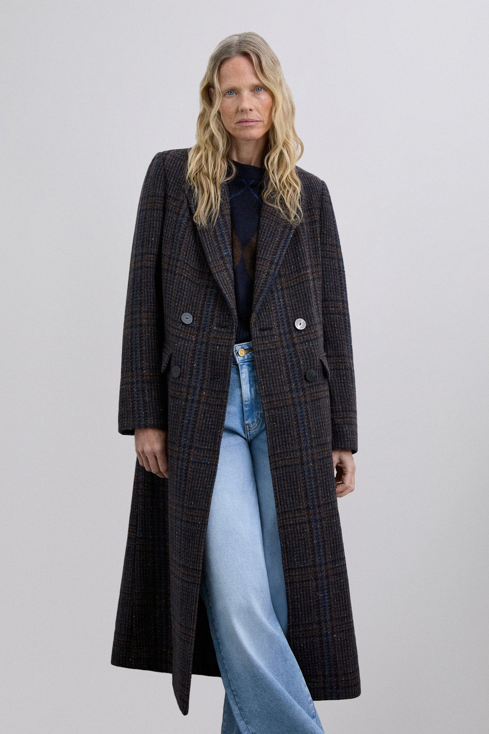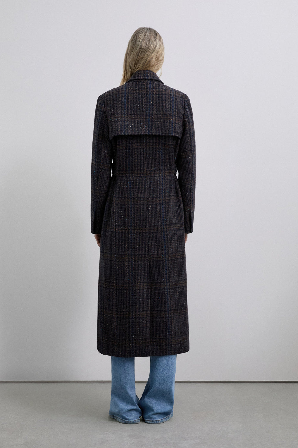 Casaco comprido de lã com padrão xadrez subtil. Com ombreiras, corte a direito e lapelas clássicas. Fecho de botões à frente e cinto no tom para ajustar a cintura. Bolsos laterais.
