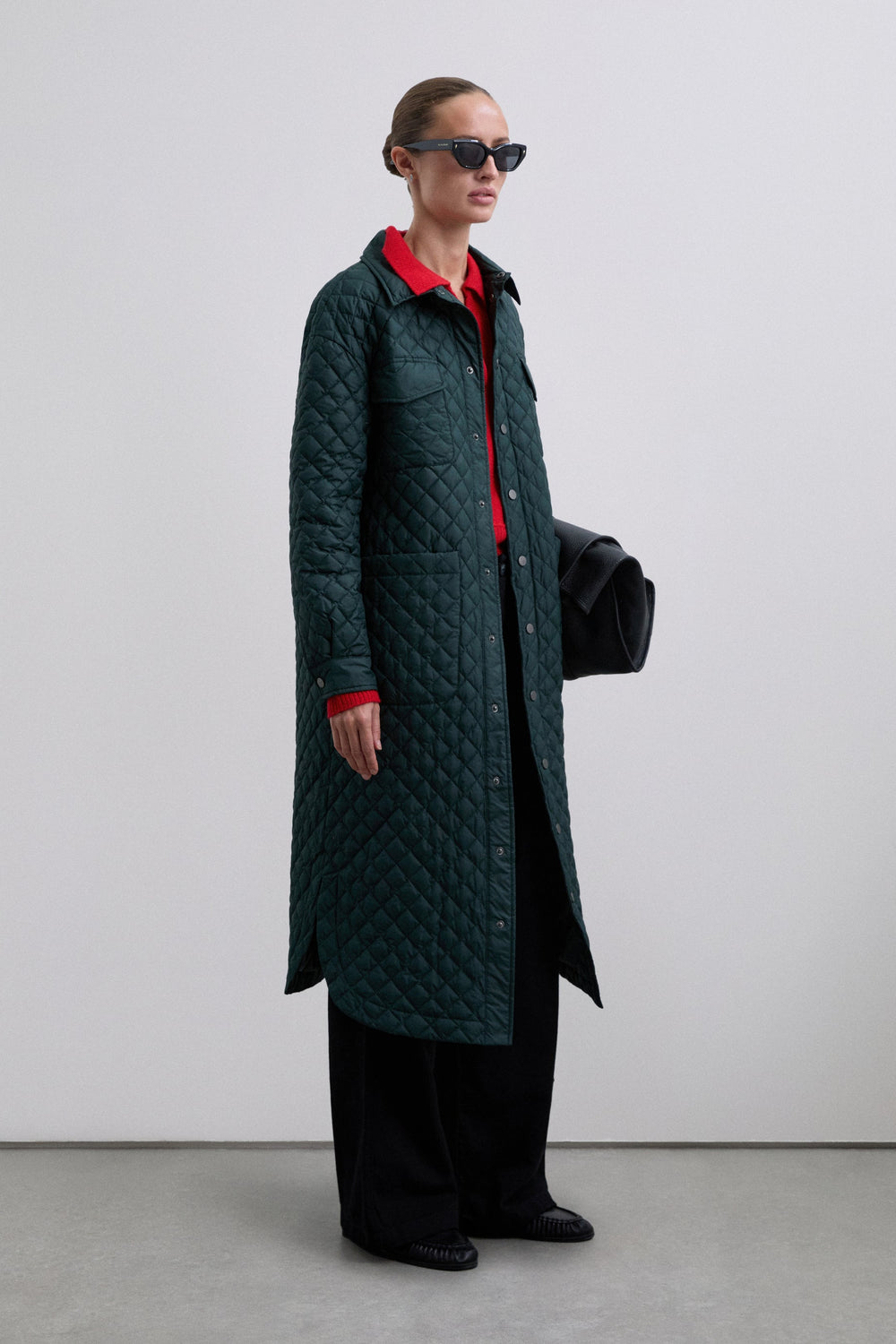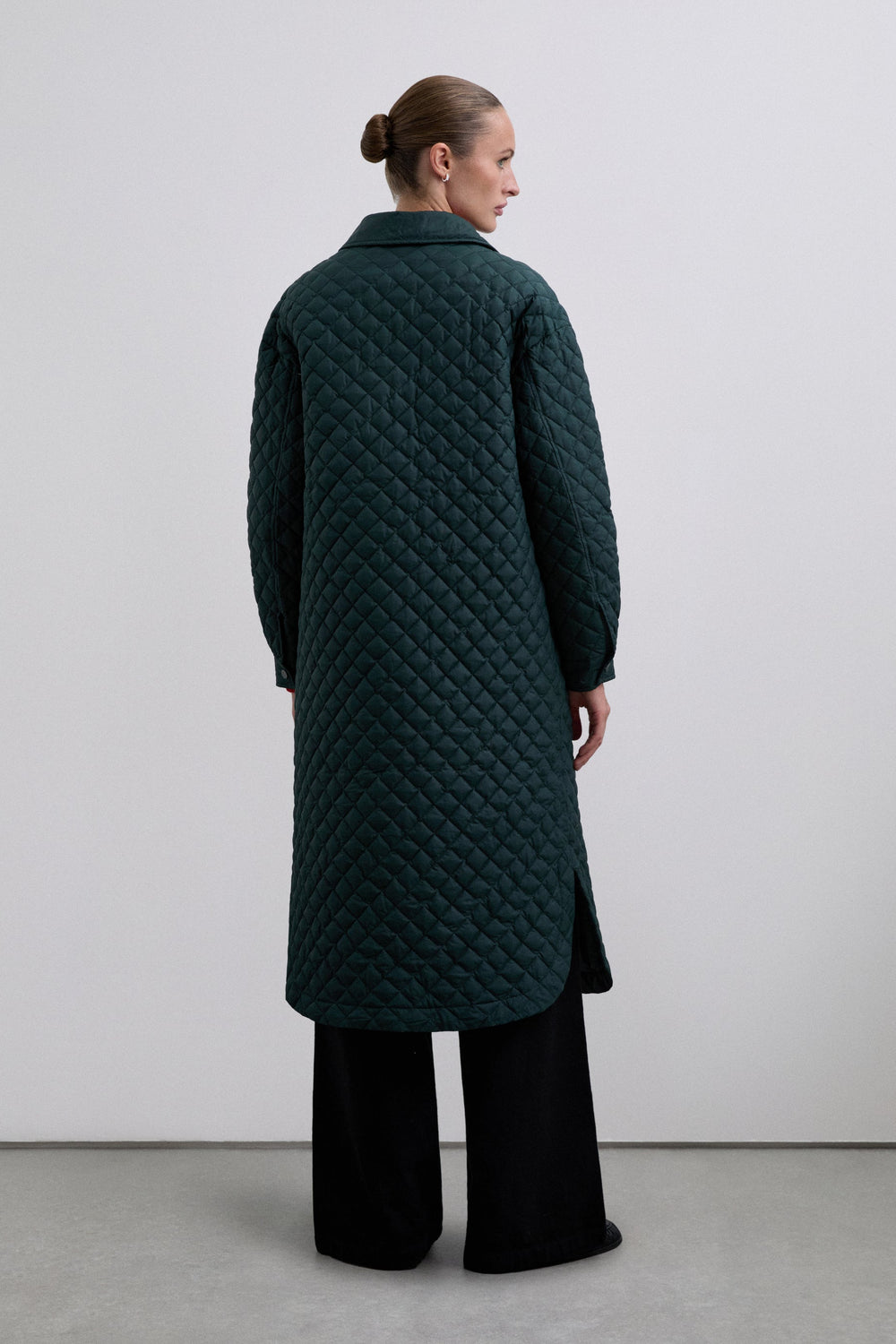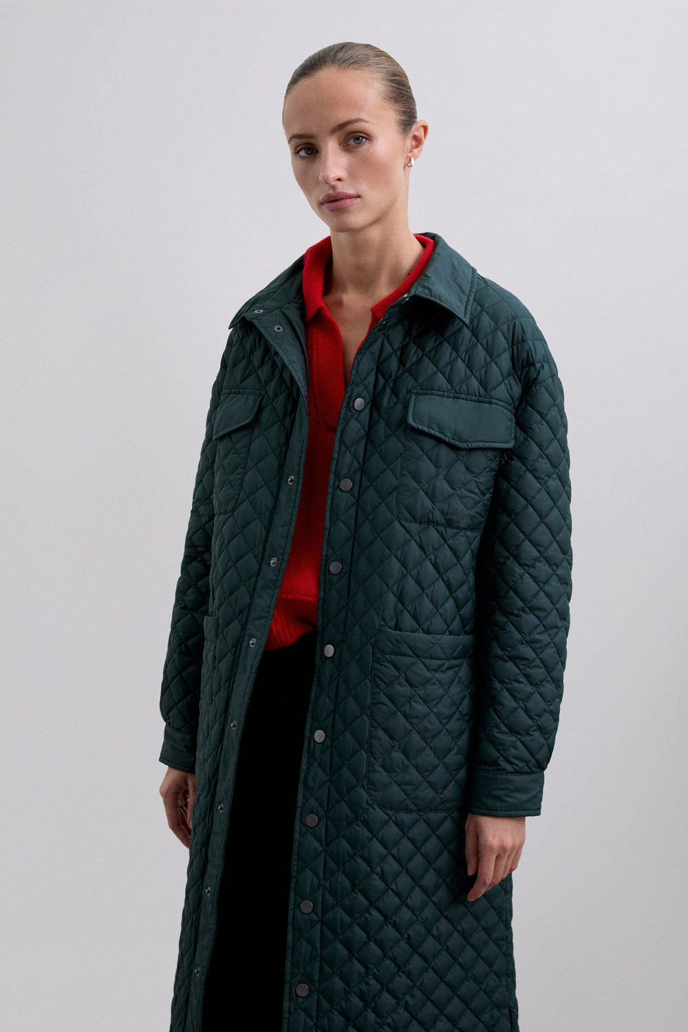 Casaco comprido acolchoado tipo puffer impermeável, com costura em losango pequena. Manga comprida. Gola alta desmontável. Quatro bolsos à frente, dois em baixo e dois em cima com placket.