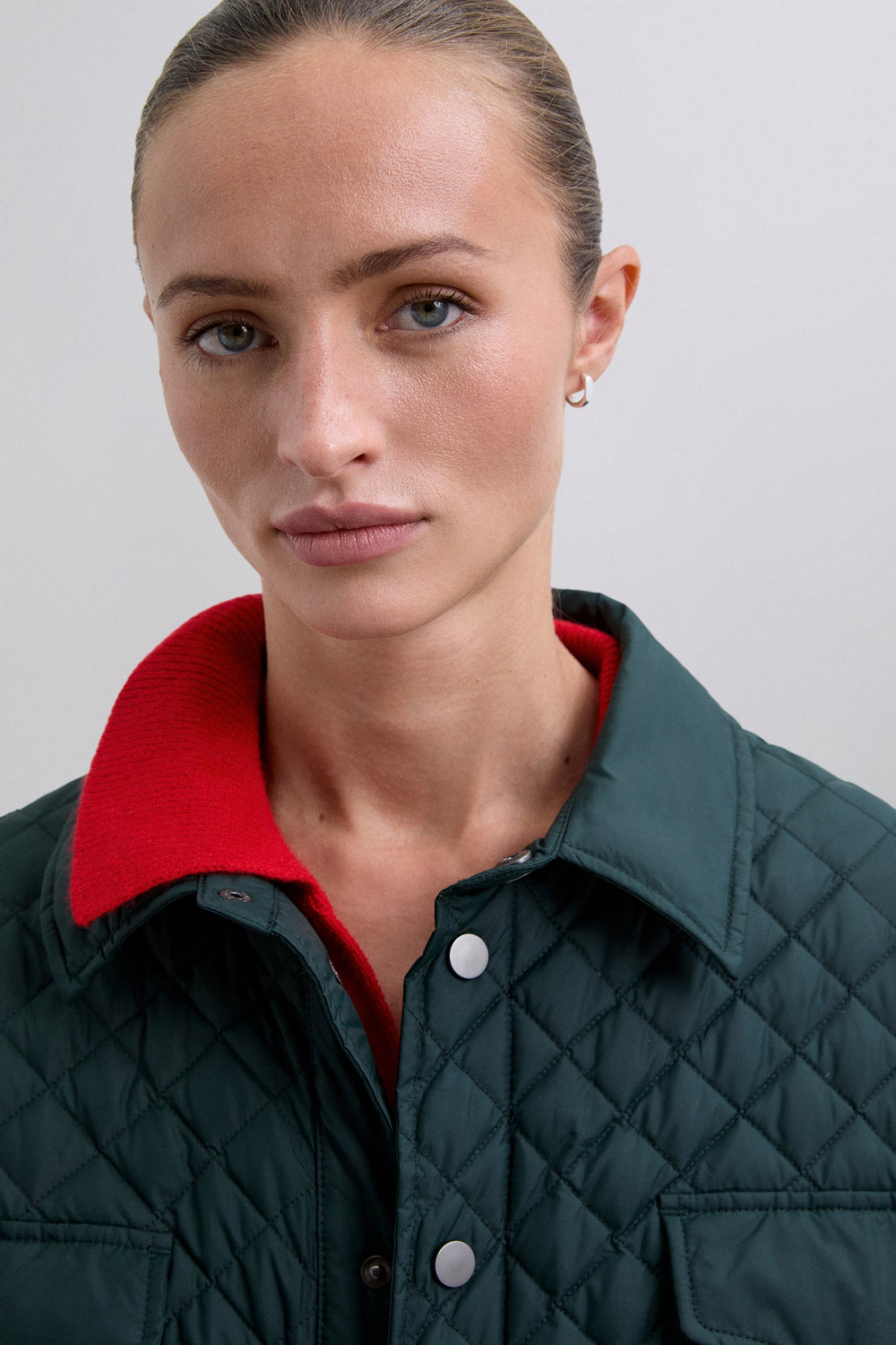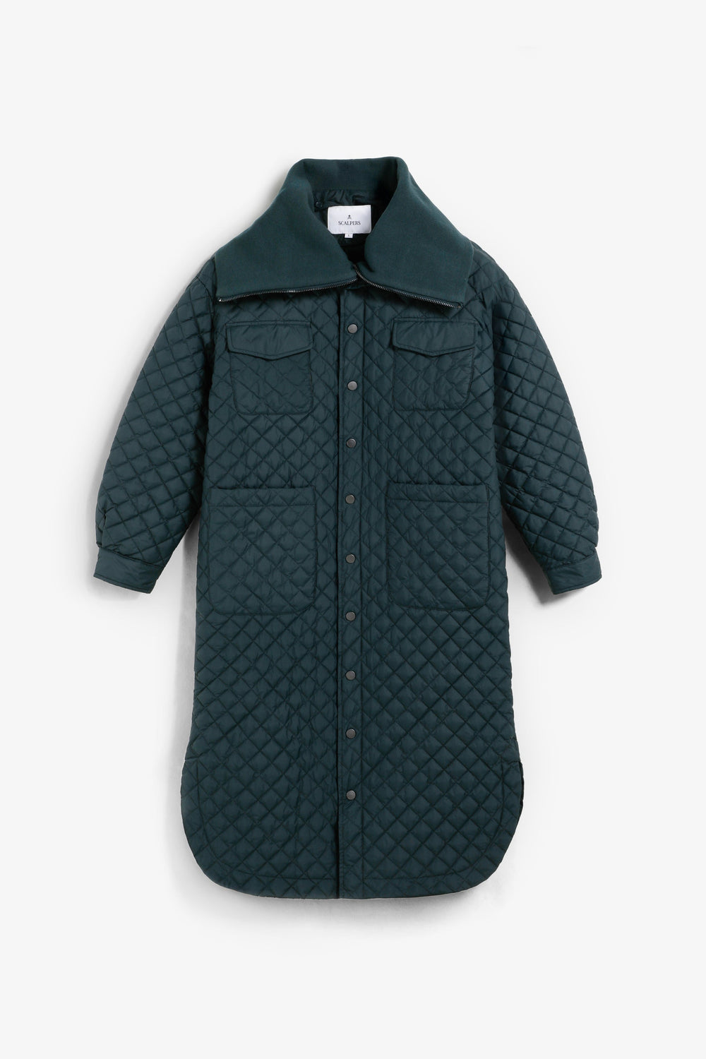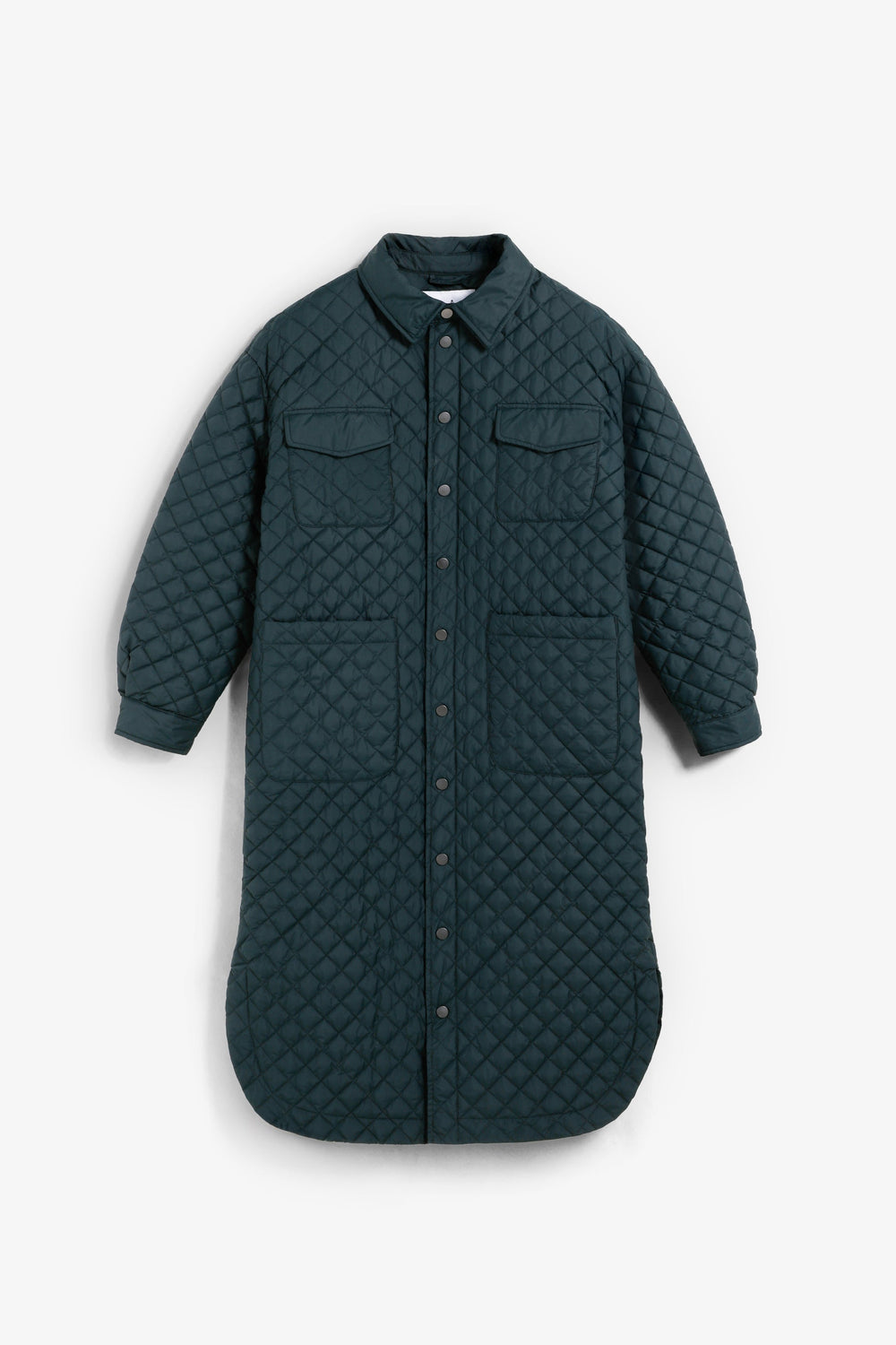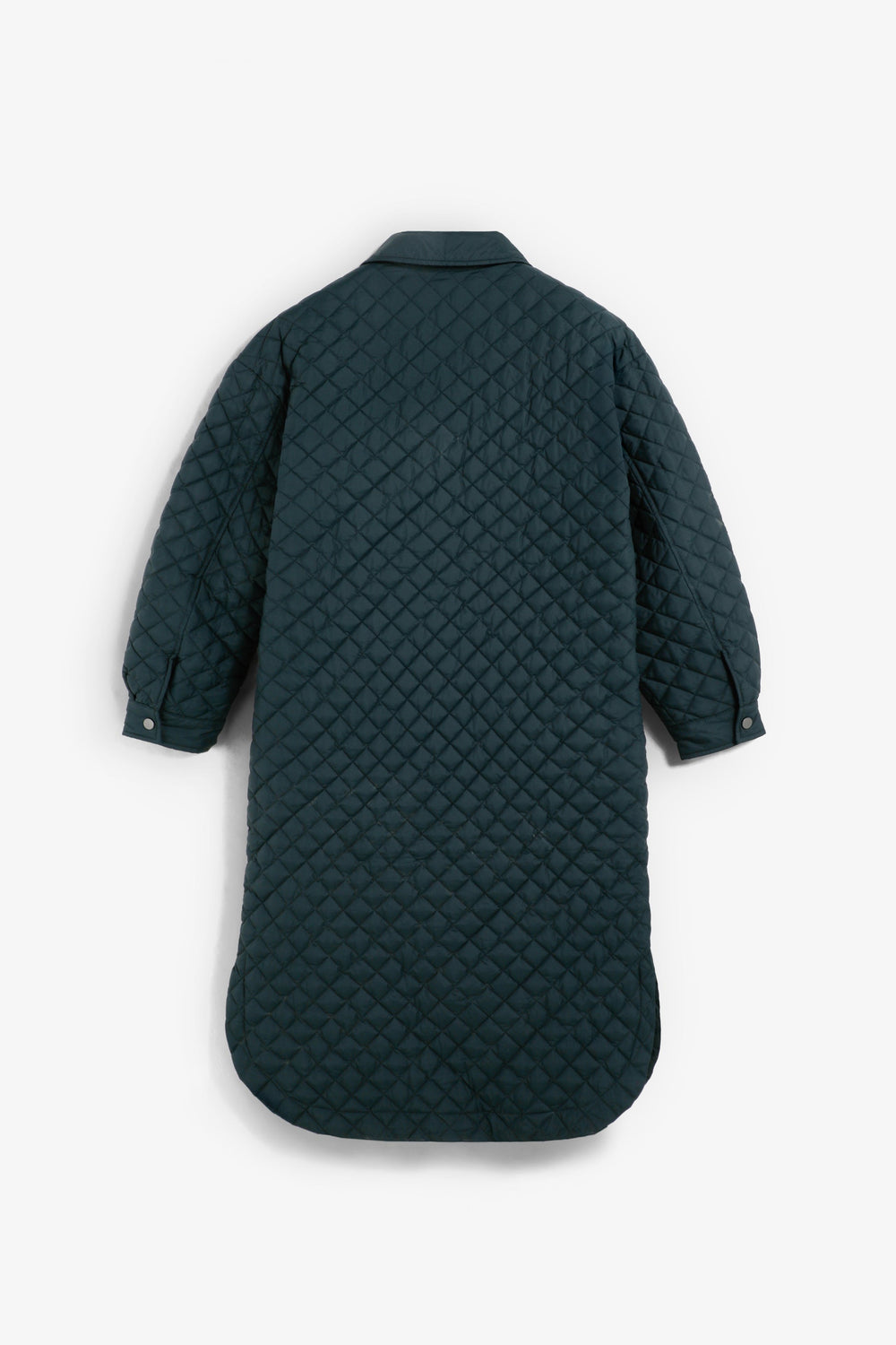 Casaco comprido acolchoado tipo puffer impermeável, com costura em losango pequena. Manga comprida. Gola alta desmontável. Quatro bolsos à frente, dois em baixo e dois em cima com placket.