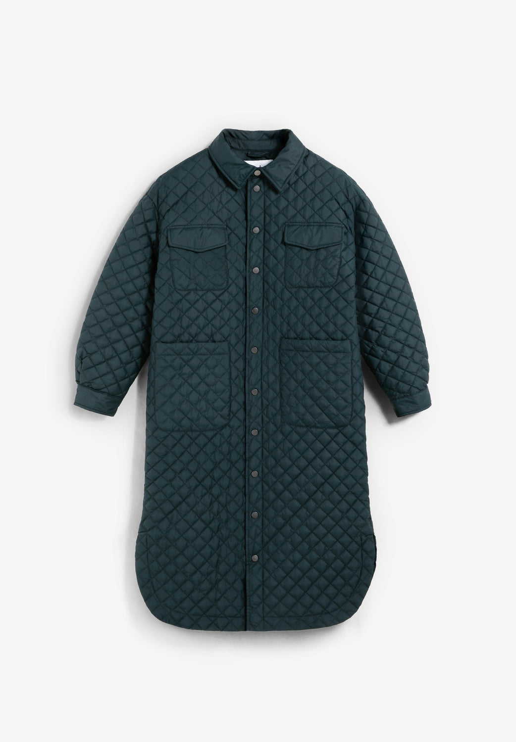 Casaco comprido acolchoado tipo puffer impermeável, com costura em losango pequena. Manga comprida. Gola alta desmontável. Quatro bolsos à frente, dois em baixo e dois em cima com placket.