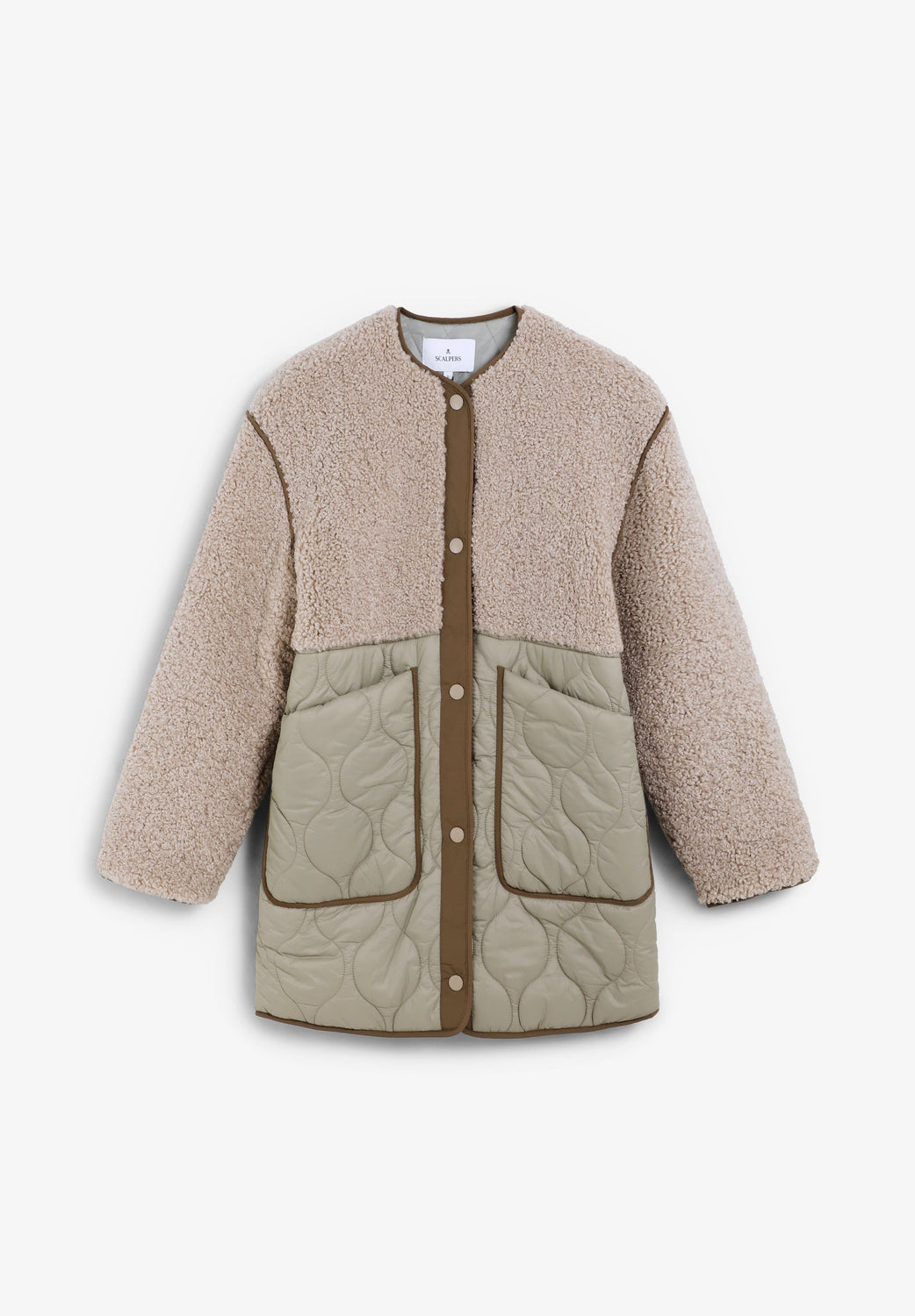 Casaco confecionado na parte superior com pele sintética de ovelha e parte inferior de nylon acolchoado com dois bolsos grandes. Fecho frontal com botões. Pormenor de remendo efeito de caucho com logótipo atrás.