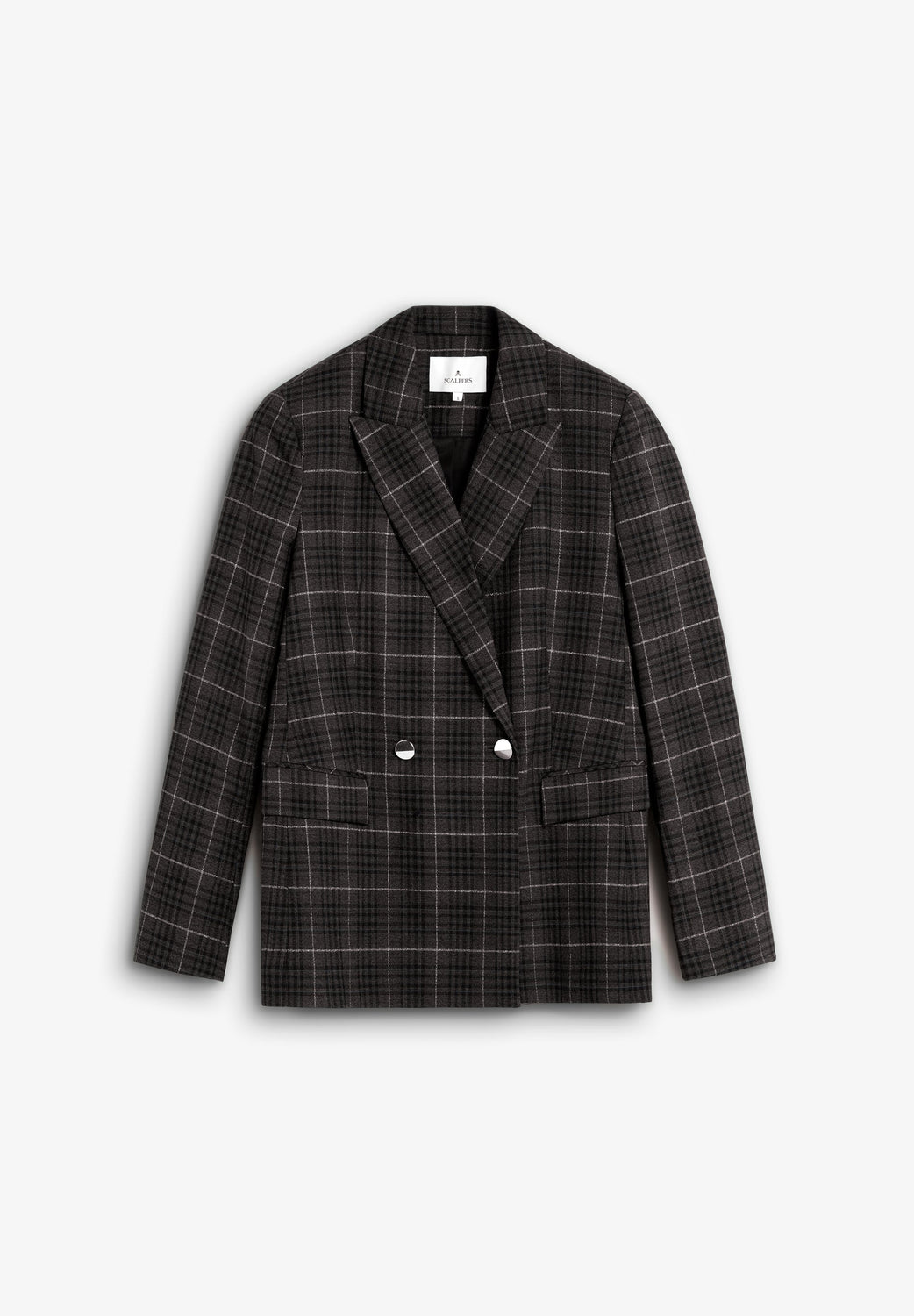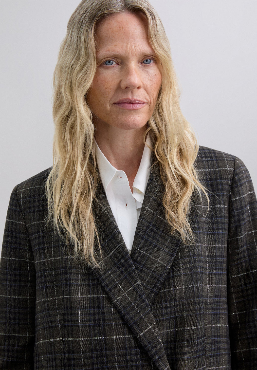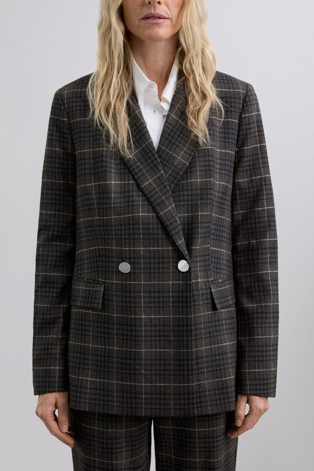 Blazer com lapela pontiaguda. Manga comprida. Fecho de botões à frente de duplo trespasse. Dois bolsos cm casa do botão. Padrão xadrez.