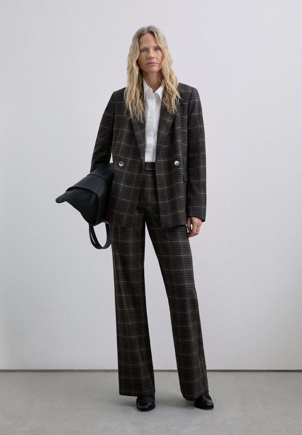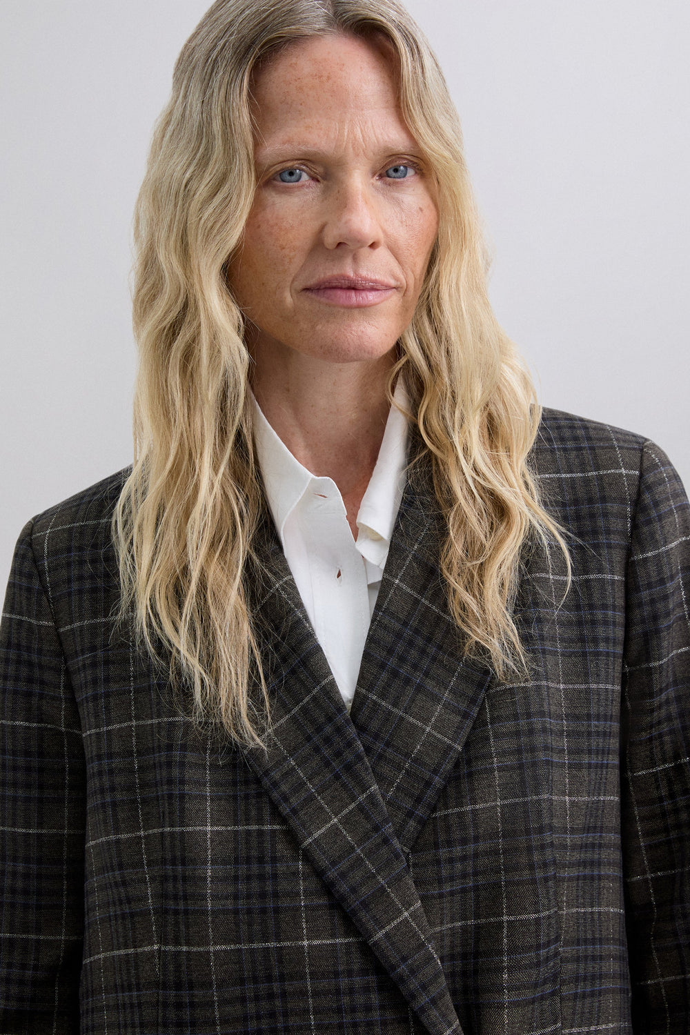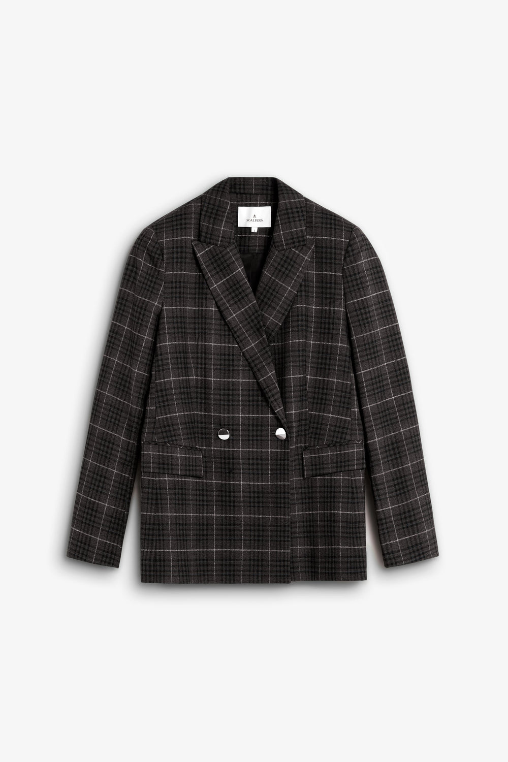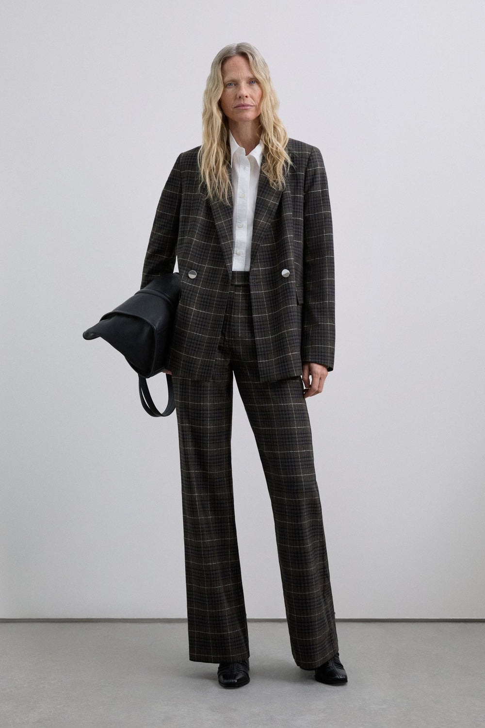 Blazer com lapela pontiaguda. Manga comprida. Fecho de botões à frente de duplo trespasse. Dois bolsos cm casa do botão. Padrão xadrez.