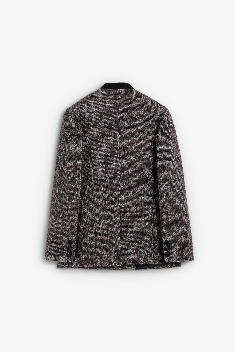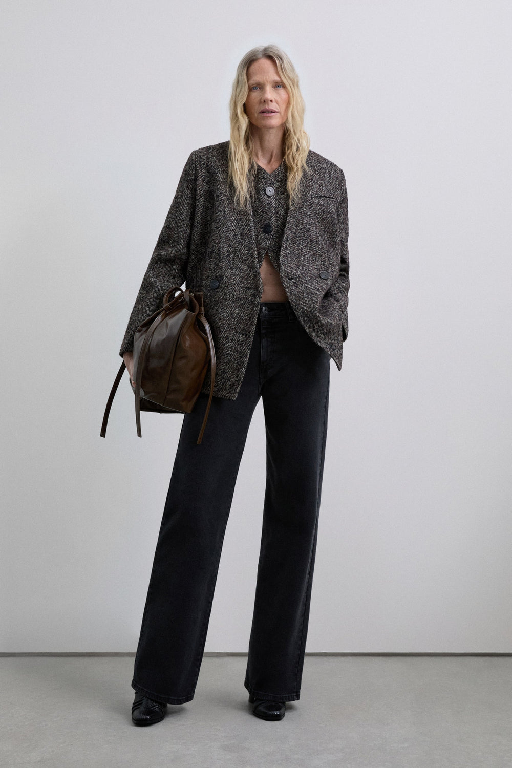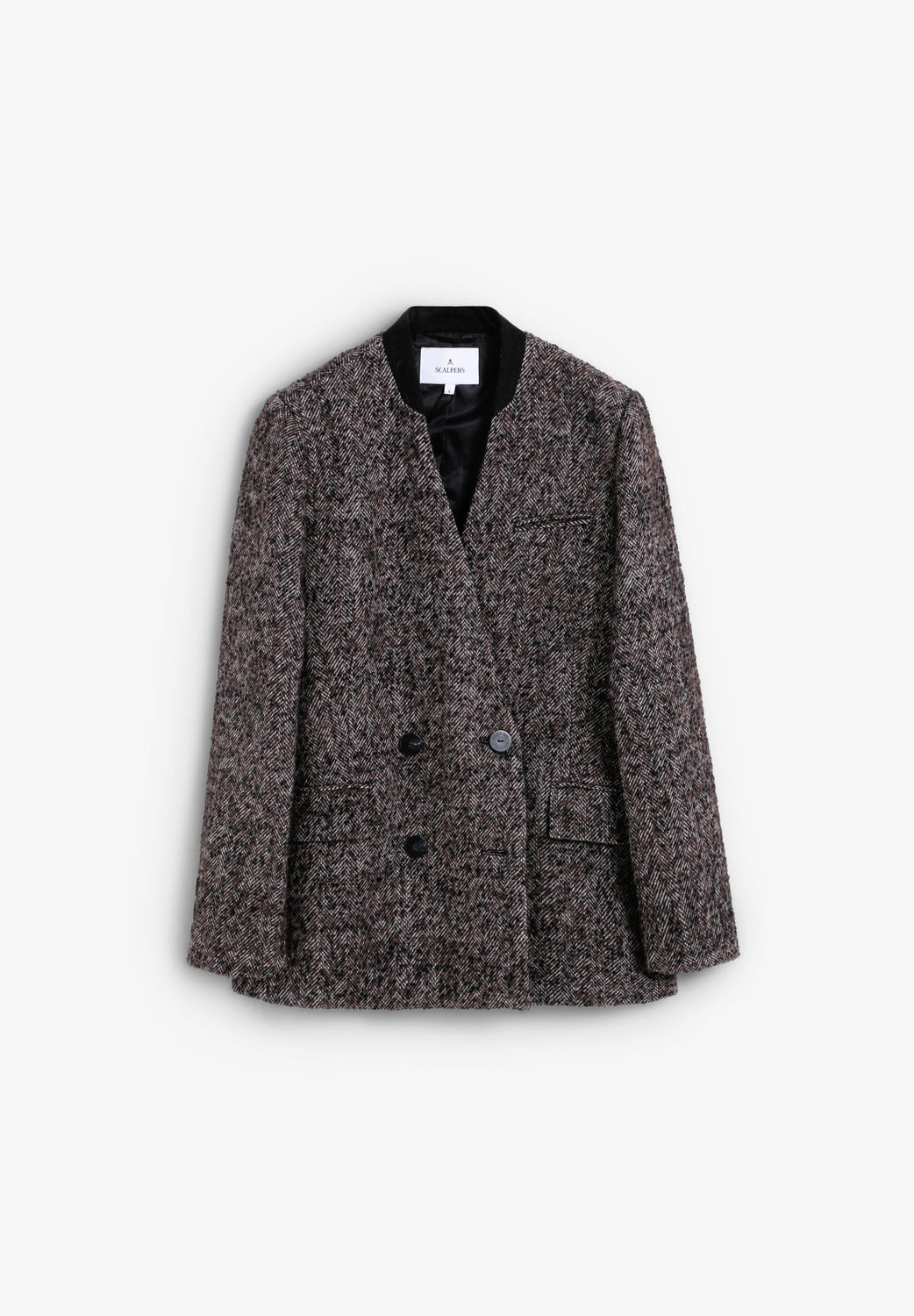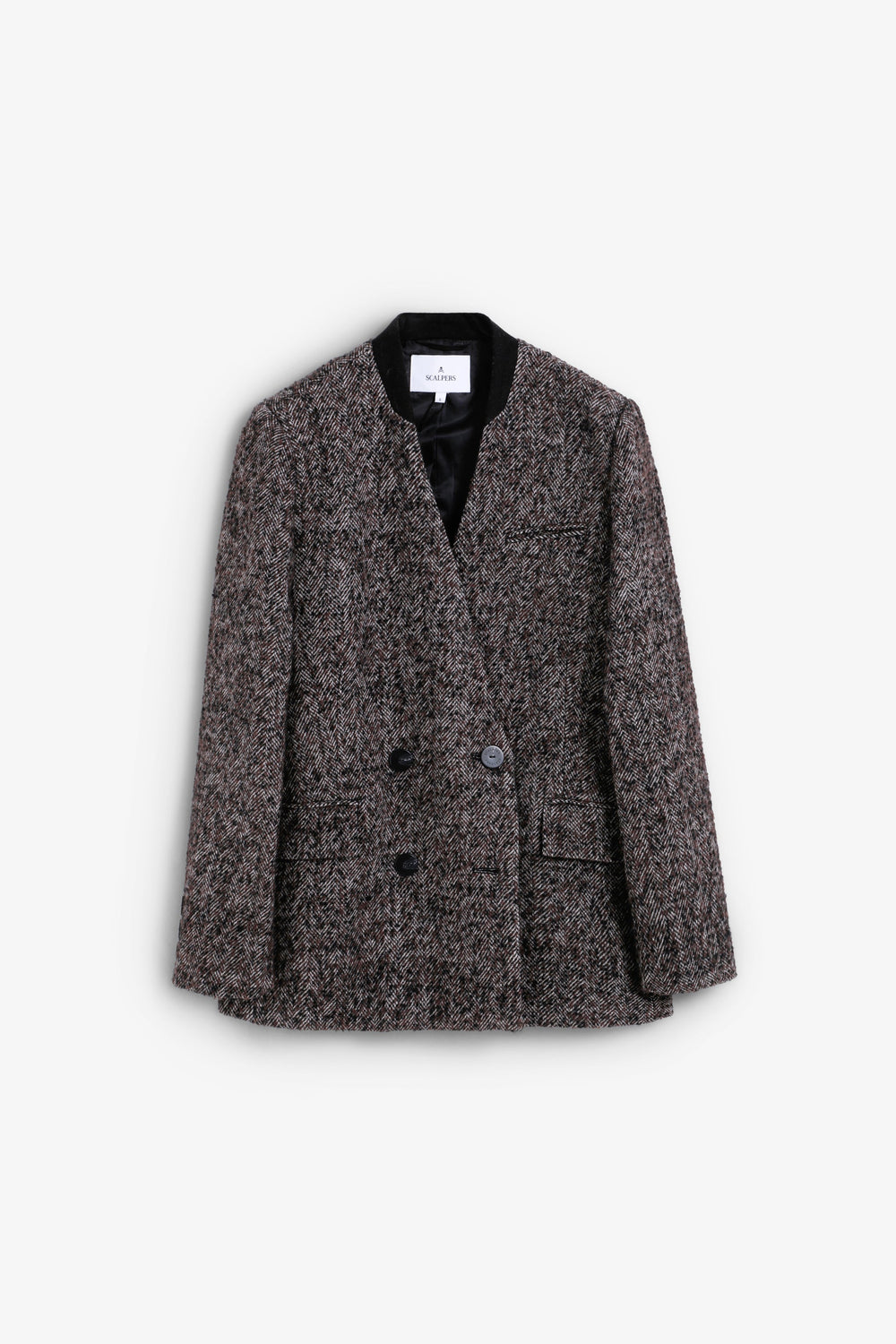 Blazer sem gola confecionado em lã. Com um colete justo e curto. Manga comprida. Dois bolsos frontais com aba. Fecho frontal com botões.