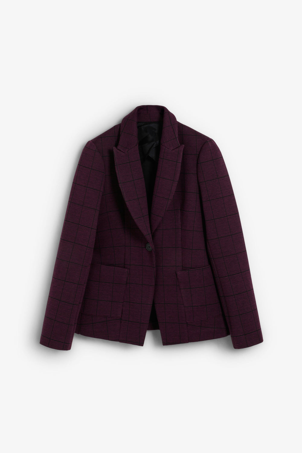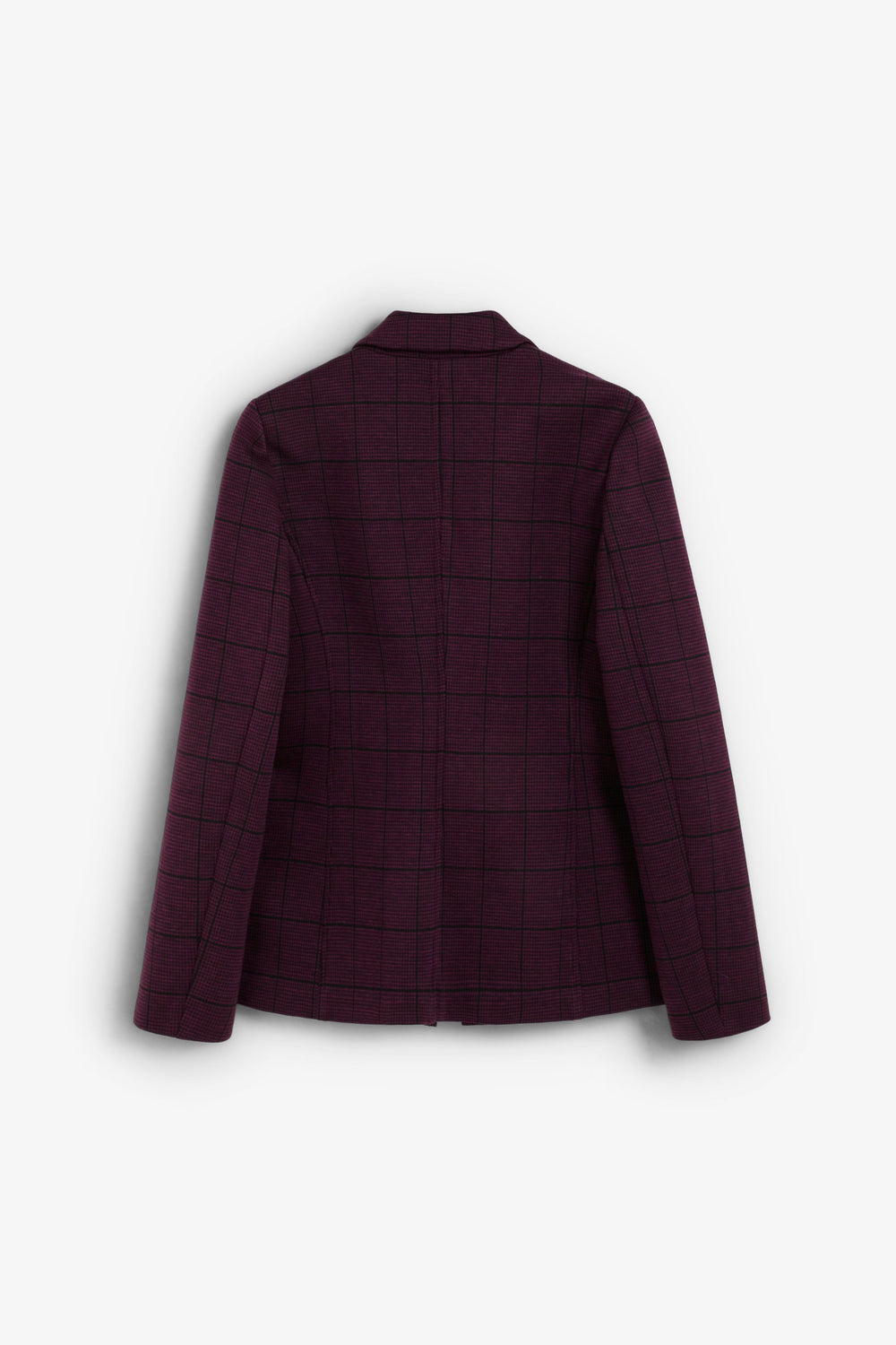 Blazer bordeaux estruturado com padrão xadrez. Gola lapela. Levemente justa. Manga comprida. Fecho com botão. Bolsos à frente de remendo.