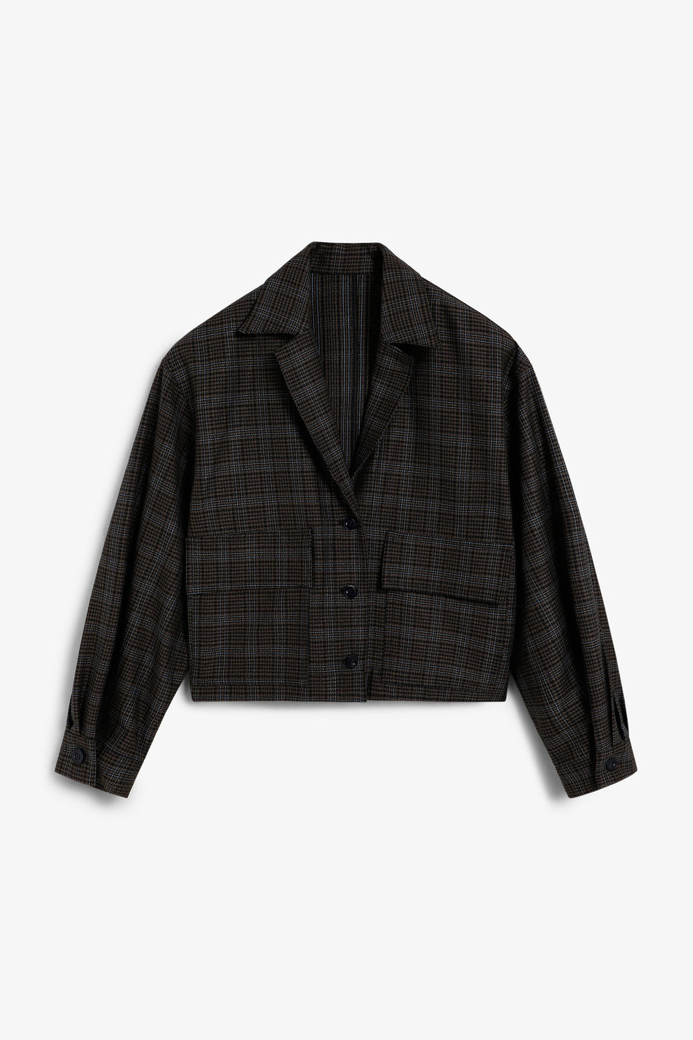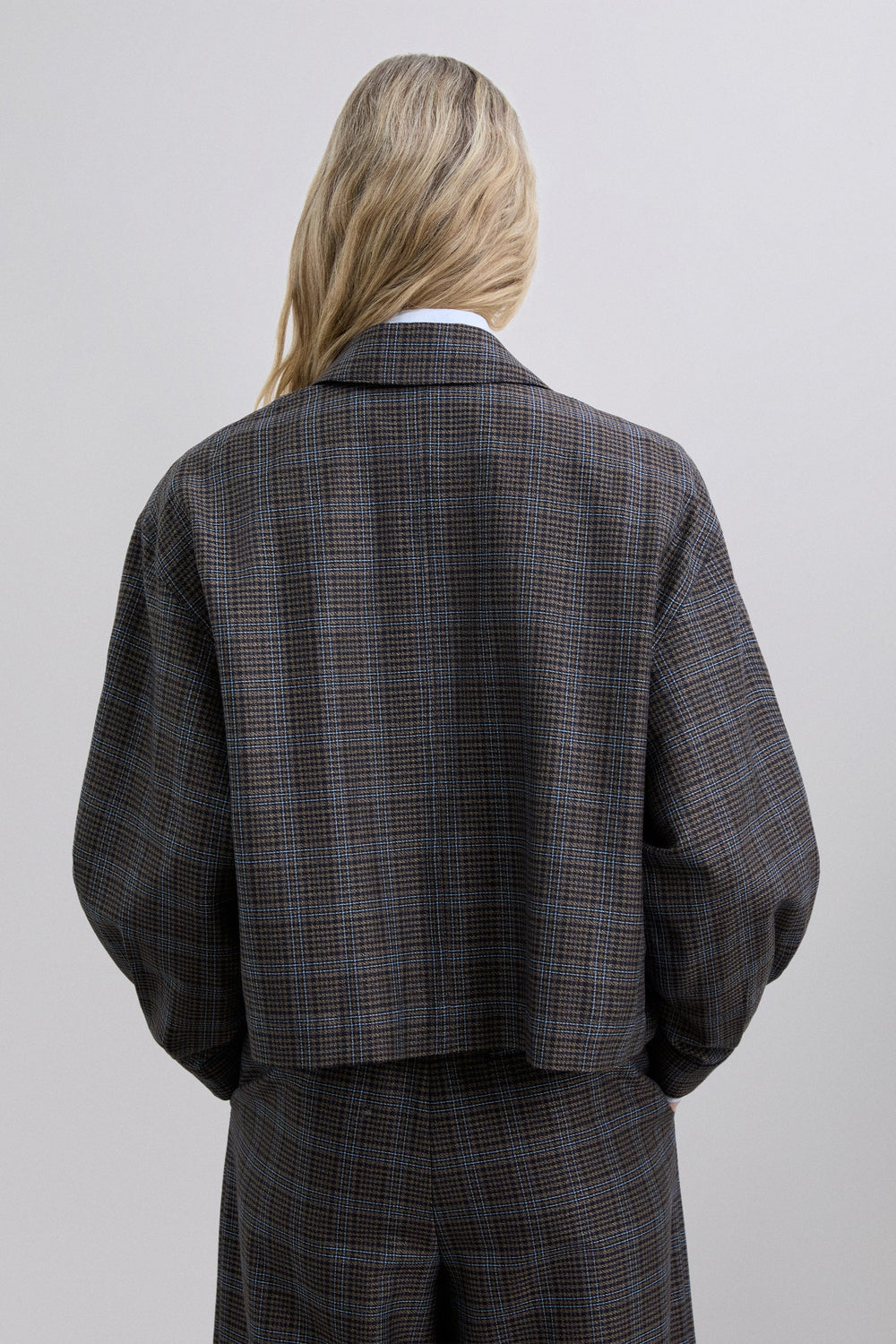 Cardigan com estampado xadrez. Gola de camisa. Mangas compridas. Ajustado na cintura. Punhos com fecho com botões. Fecho com botões à frente.