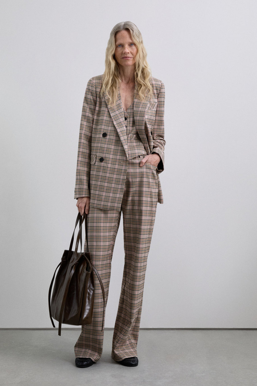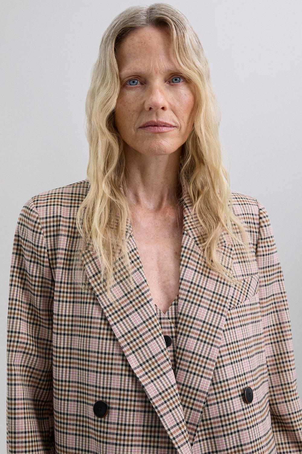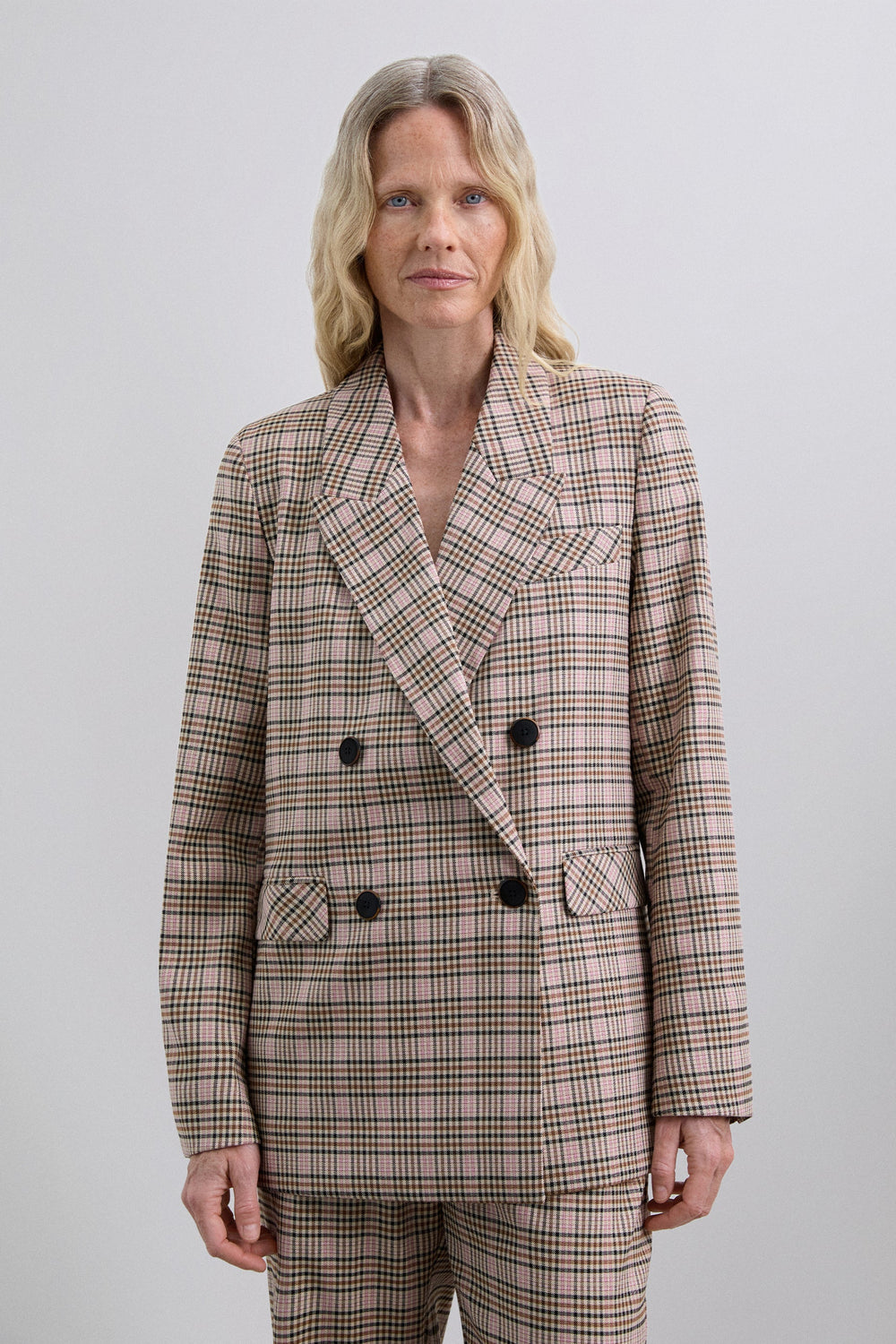 Blazer cruzado com padrão xadrez. Gola lapela. Fecho com botões. Manga comprida com acabamento de fecho de botões. Bolsos à frente com aba.