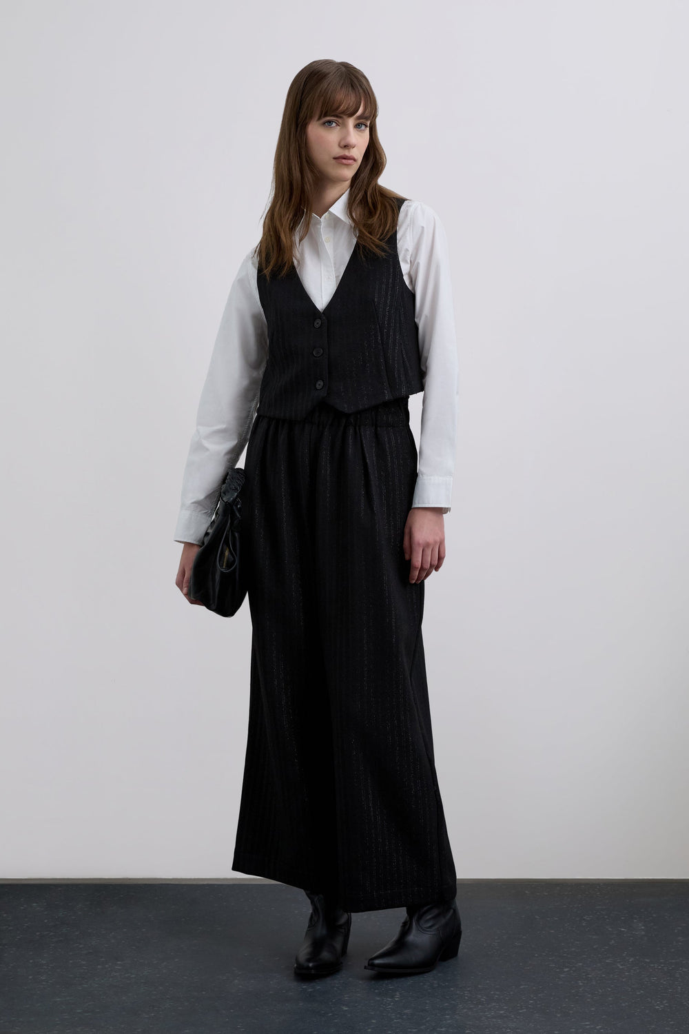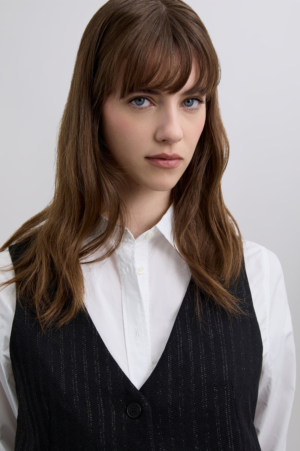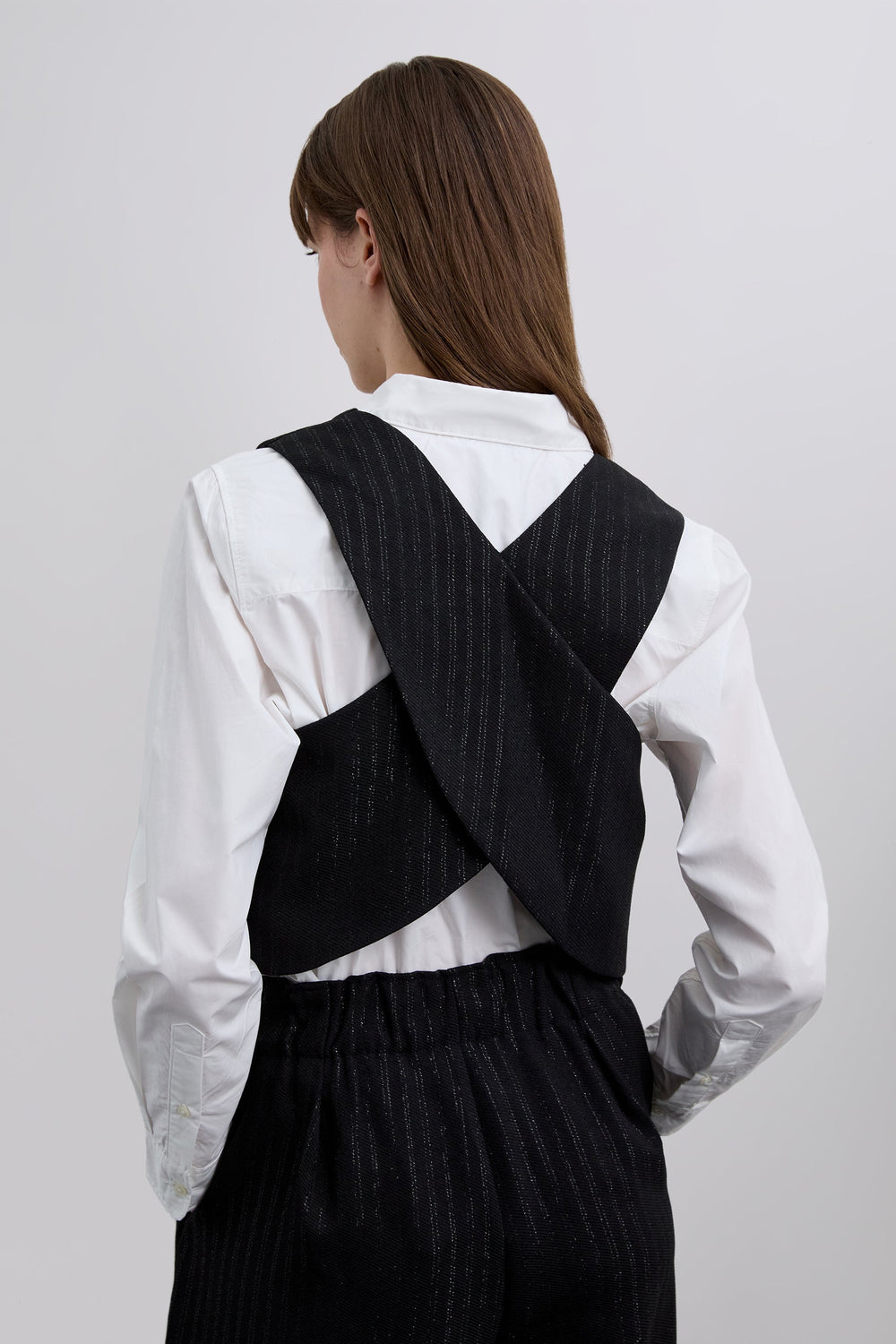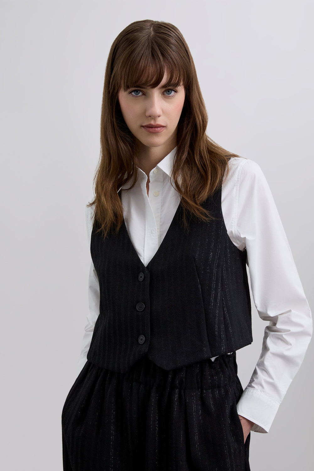 Colete confecionado em material fluido com estampado às riscas de fio metalizado. Corte slim fit. Decote em V. Manga cava. Costas cruzadas. Fecho com botões.