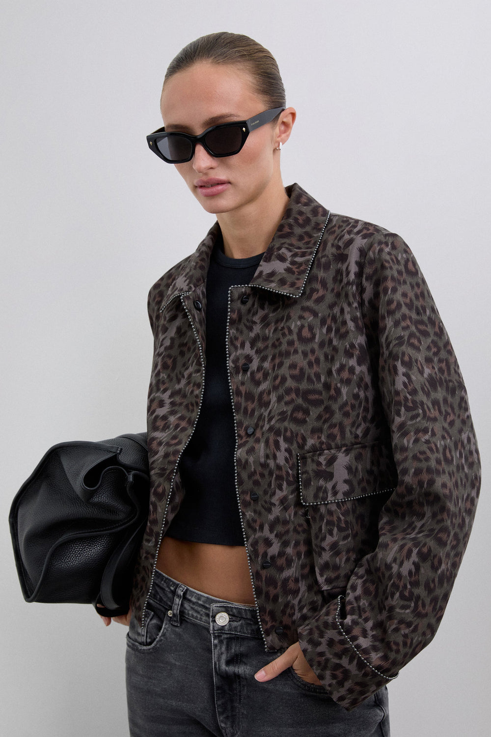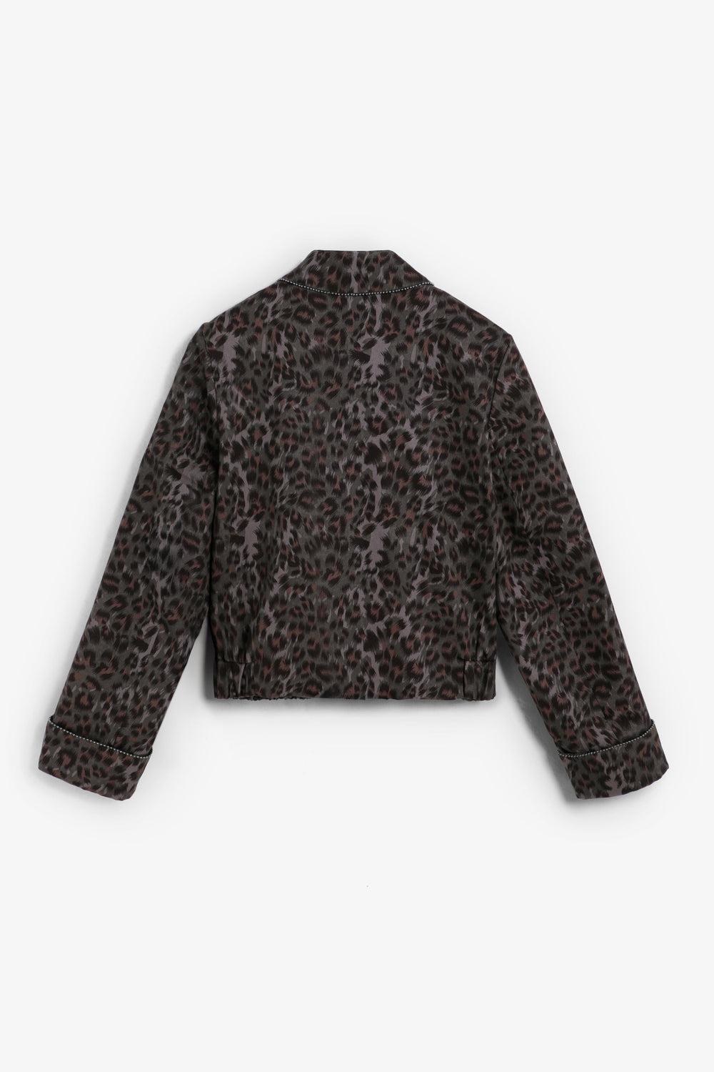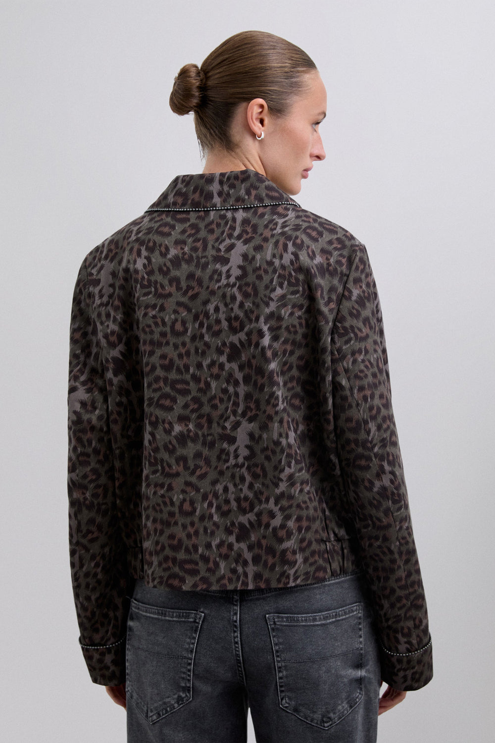 Cardigan confecionado em 100% algodão com padrão de estampado animal. Pormenor do forro com tachas metalizadas. Manga comprida com punhos enrolados. Gola de camisa. Fecho com botões oculto por placket e um botão visível. Dois bolsos com aba. Faixa elástica nas laterais da bainha.