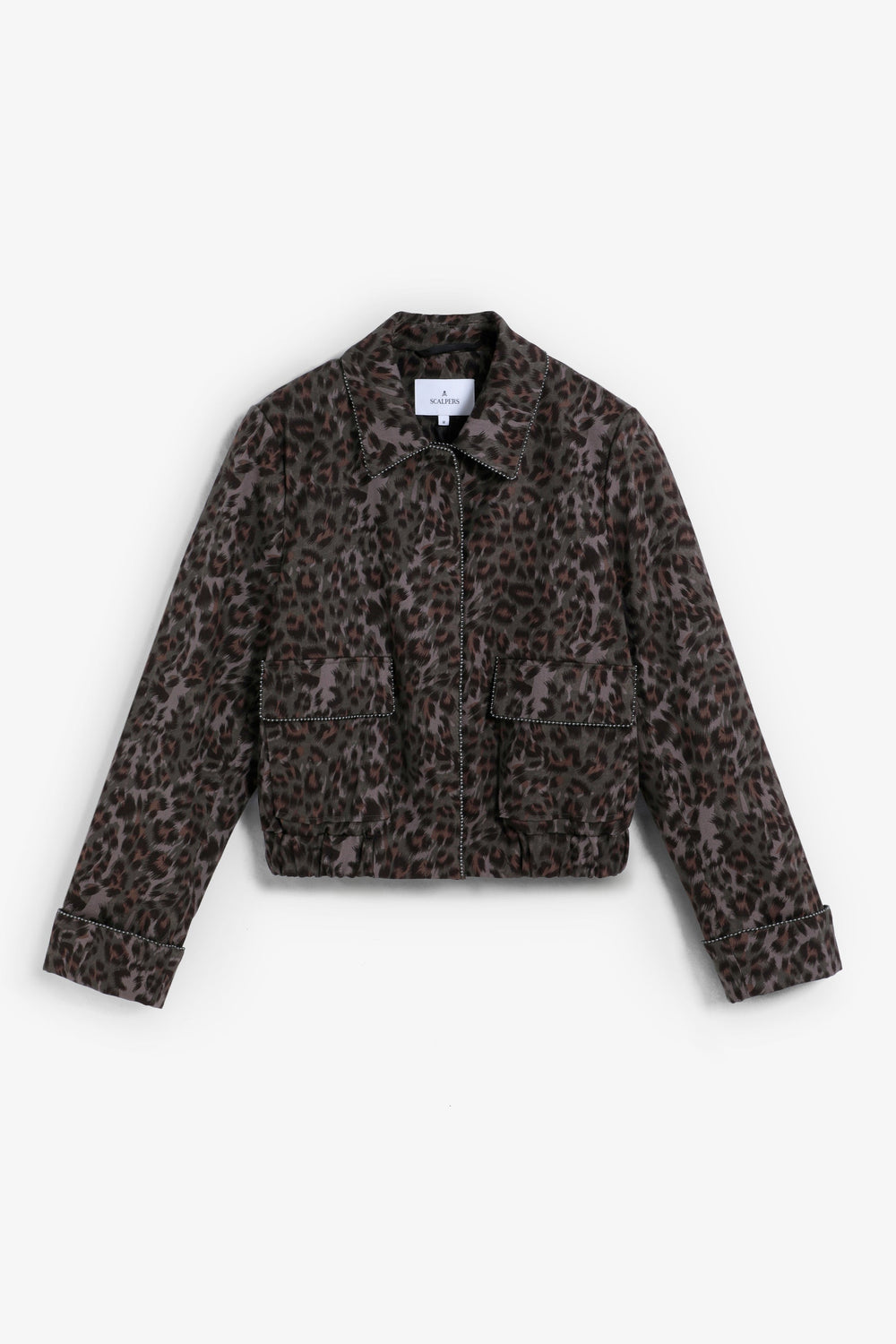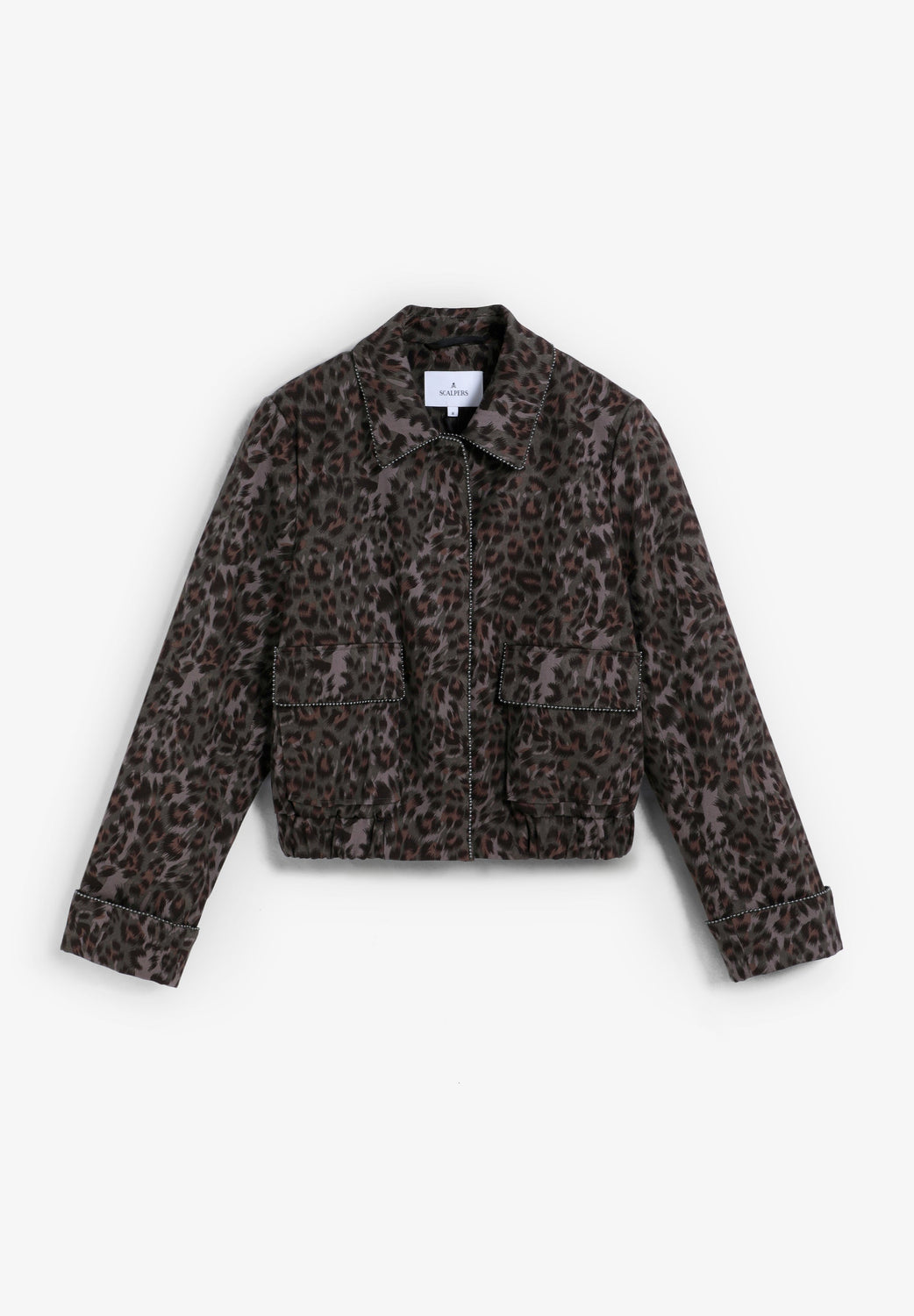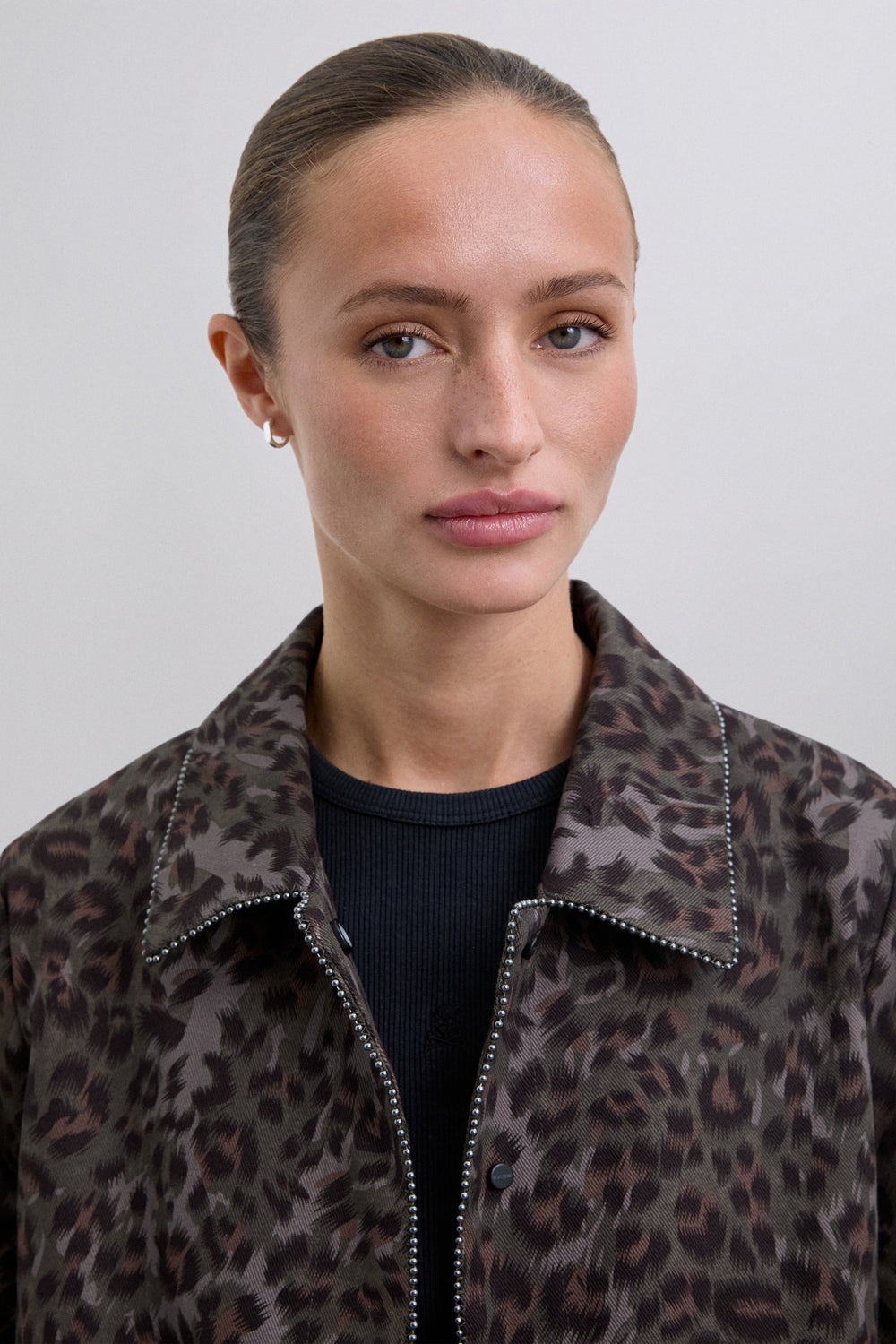 Cardigan confecionado em 100% algodão com padrão de estampado animal. Pormenor do forro com tachas metalizadas. Manga comprida com punhos enrolados. Gola de camisa. Fecho com botões oculto por placket e um botão visível. Dois bolsos com aba. Faixa elástica nas laterais da bainha.