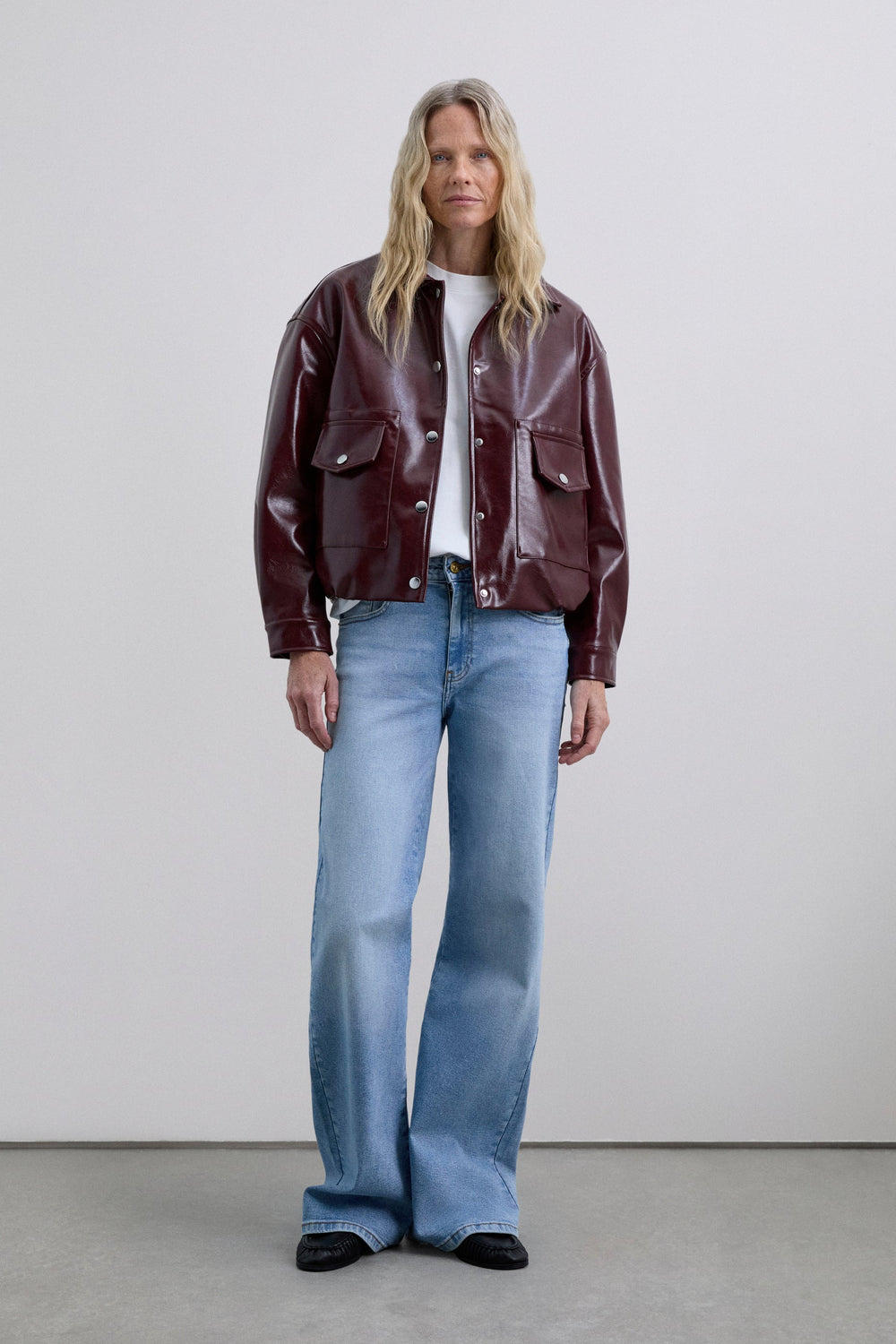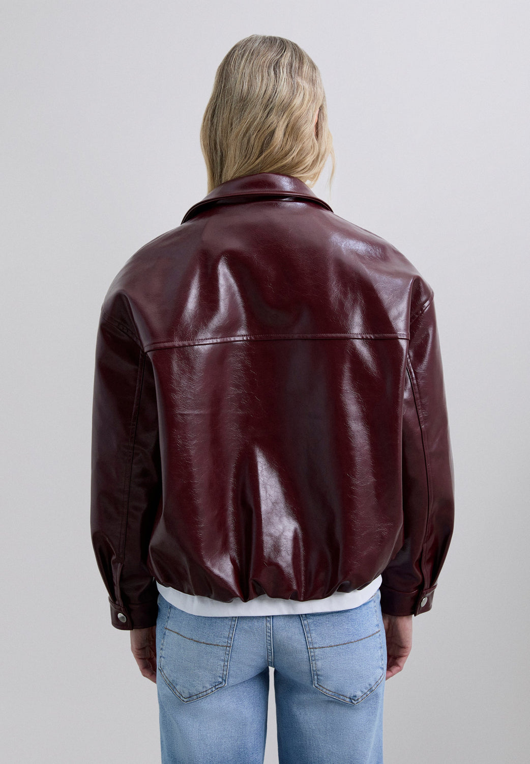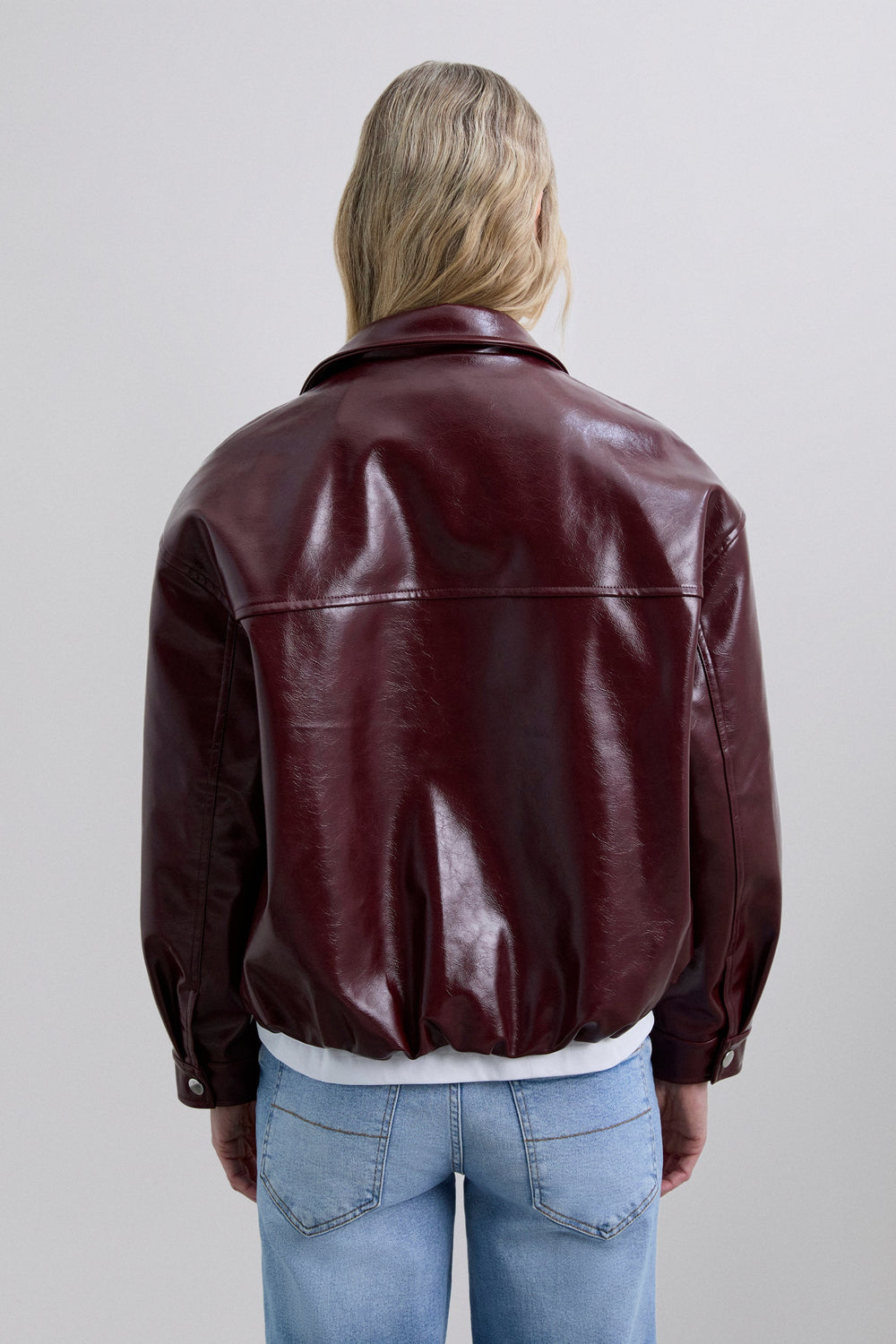Cardigan bomber confecionado em pele sintética. Fecho com botões à frente. Bolsos nas laterais e à frente. Punhos com fecho com botões.