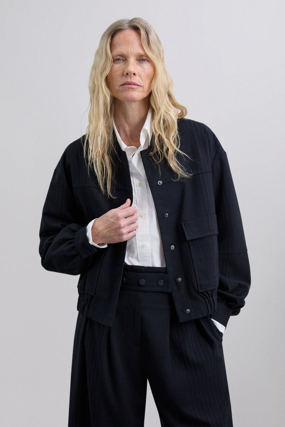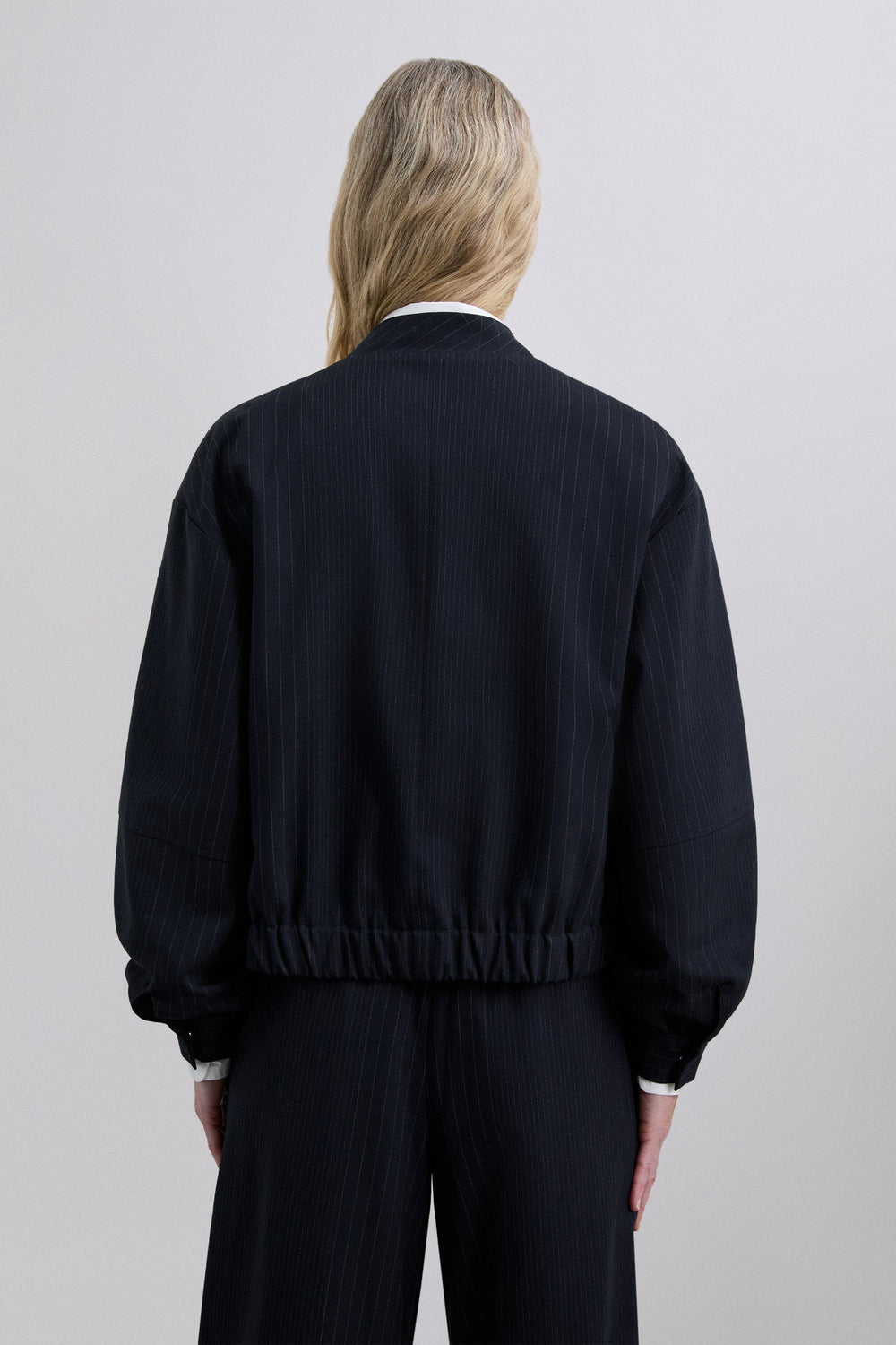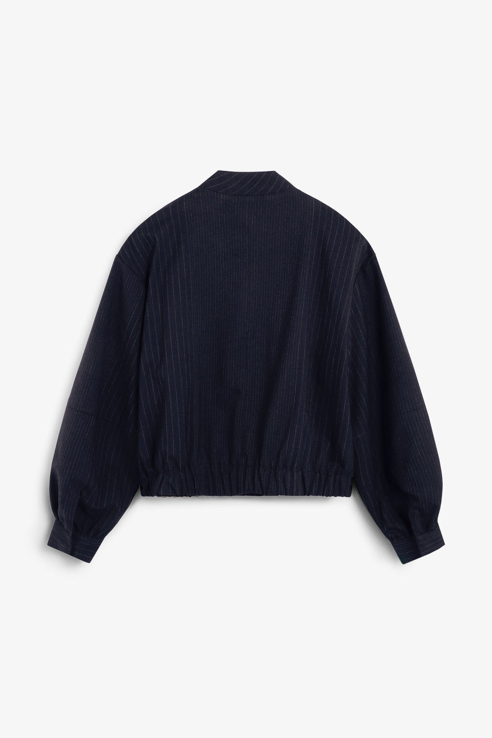 Cardigan bomber risca diplomática. Gola alta cortada em viés. Manga comprida. Cintura levemente elástica. Fecho de correr e botões à frente. Dois bolsos frontais com aba.